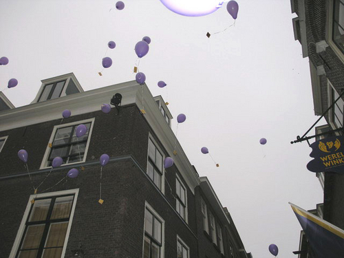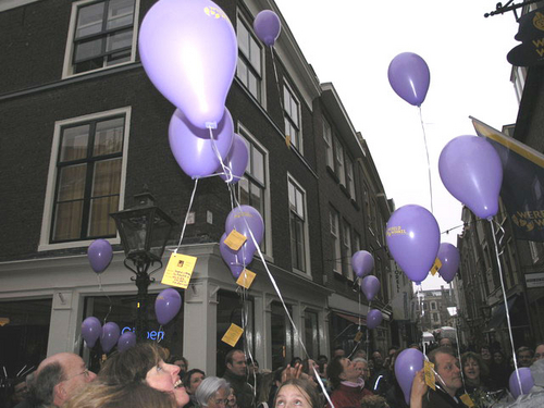Met een denkbeeldige schaar knipte Lenferink een denkbeeldig lint door om de Wereldwinkel te openen. Vervolgens werden tientallen ballonnen opgelaten. De winnaar van de ballonnenwedstrijd zal bekend gemaakt worden op 7 mei tijdens de Wereldwinkeldag. (Foto's: Chris de Waard).