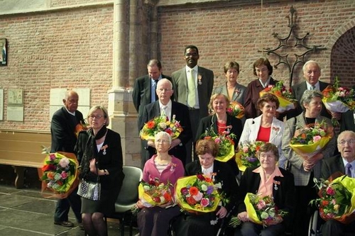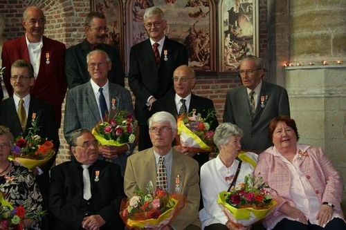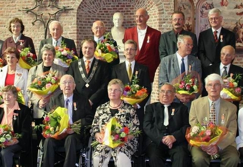 Onder de gedecoreerden bevindt zich één echtpaar, vier (bestuurs)leden van de Gymnastiekvereniging Nieuw Brunhilde en drie vrijwilligers van Centrum Club 58, de organisatie voor vrijetijdsactiviteiten voor mensen met een verstandelijke handicap.De Leiderdorpse mevrouw Aalders ontvangt haar onderscheiding in Leiden vanwege haar langdurige activiteiten voor de Oxford-Leiden uitwisselingen. Oegsgeestenaar J. Kwestro is al jaren actief binnen Club 58. Hij ontvangt de onderscheiding in Leiden omdat tegelijkertijd nog twee vrijwilligers van deze organisatie in Leiden worden gedecoreerd, waarvan er één nog een naast familielid is.
