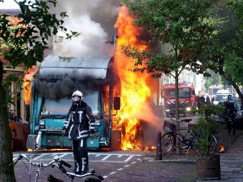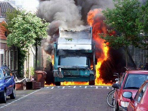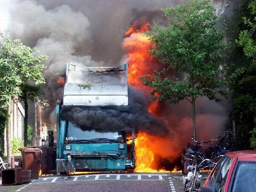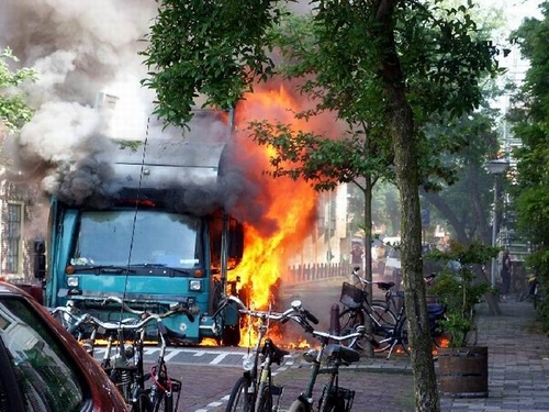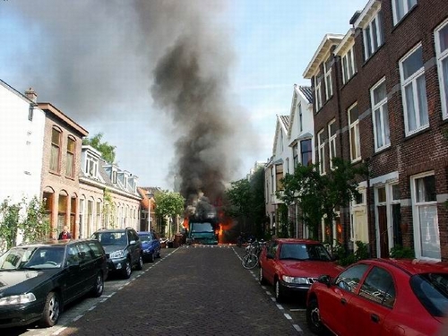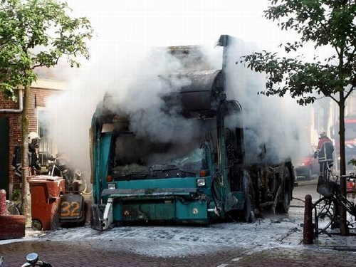 Een flinke brand in een vuilniswagen zorgde gisteren voor de nodige schade in de Witte Rozenstraat. (Foto's: Gerard Ligtvoet).