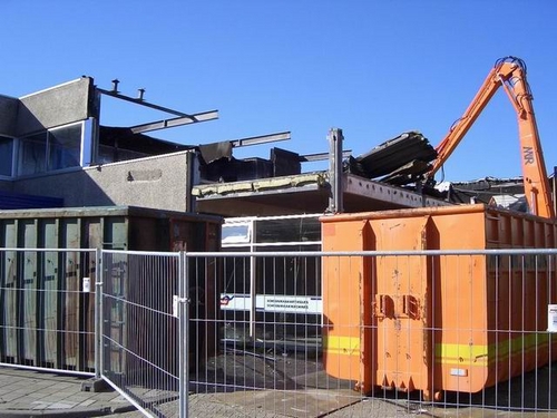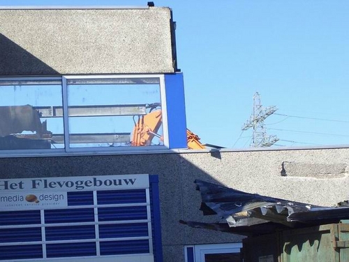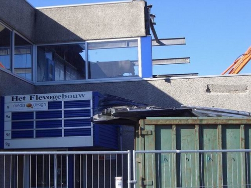 Het bedrijfsverzamelgebouw aan de Flevoweg en de Flevodwarsweg dat begin april door brand werd verwoest, is gesloopt. De afgelopen weken werd het gebouw bijna helemaal afgebroken, alleen een verdiepingsvloer die niet door de brand werd aangetast, is blijven staan. Eigenaar Aart van der Toorn heeft de plannen voor de nieuwbouw al klaar en hoopt nog dit jaar te kunnen starten met de realisatie van een nieuw bedrijvencomplex in de Merenwijk.
