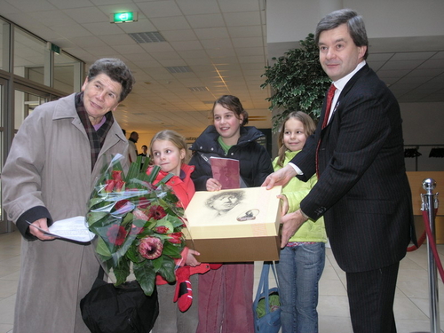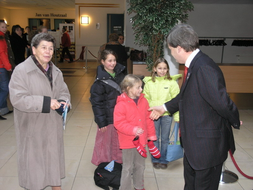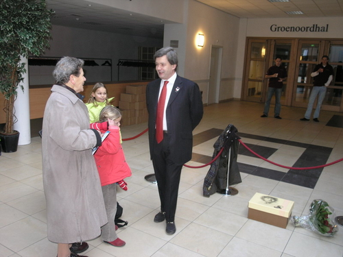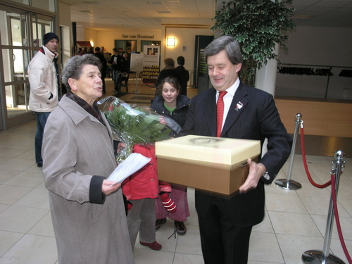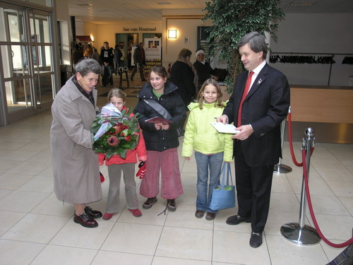 Het IJssculpturenfestival in Leiden is een ongekend succes. Net twee weken na de opening is er al een mijlpaal te vieren en werd vanmorgen de 50.000ste bezoeker feestelijk onthaald door Wethouder Alexander Geertsema van Economische en Zaken. De 72-jarige mevrouw van Spaendonk uit Tilburg was een dagje op pad met haar kleindochters Maureen (9 jaar), Quinty en Aimée (beiden 7 jaar). Het drie waren al vroeg met oma per trein naar Leiden vertrokken om de prachtige ijssculpturen in Groenoordplaza te gaan bekijken. Groot was hun verbazing dat juist zij de 50.000ste bezoeker waren en met bloemen, kado’s en gratis toegangskaarten door Wethouder Geertsema onthaald werden.