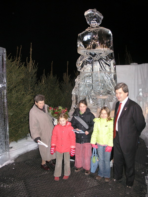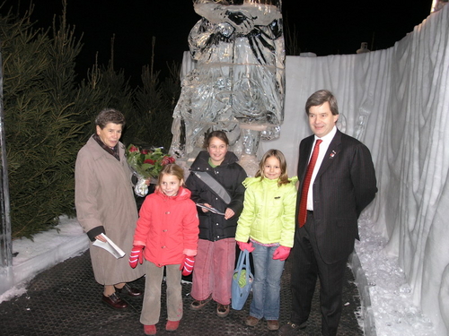 Wethouder Geertsema verwelkomde vanmorgen de 50.000ste bezoeker aan het ijssculturenfestival in Groenoordplaza. Het was de 72-jarige mevrouw Spaendonk die haar drie kleindochters een dagje mee naar Leiden had genomen. (Foto's: Chris de Waard).