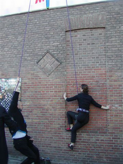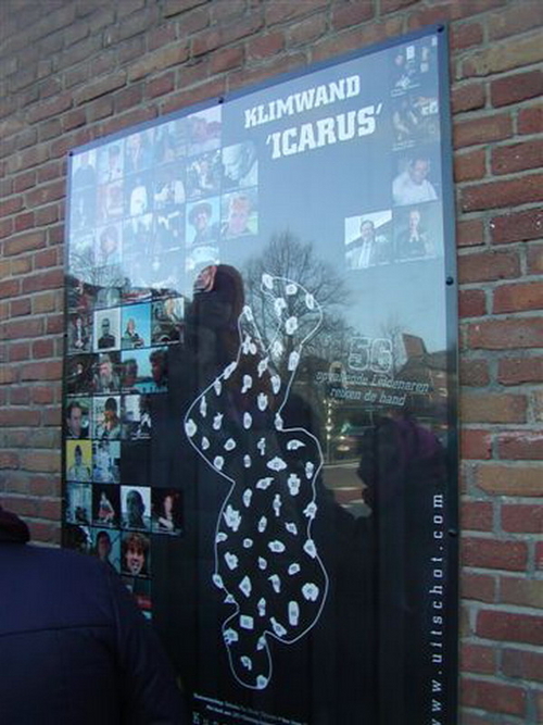 Het Leidse Kunst Uitschot Team (K.U.T.) heeft zondagmiddag bij het Utrechtse Veer hun nieuwste project onthuld. Het gaat om een klimwand waaraan ruim 50 bekende Leidenaren hun medewerking hebben verleend door een afgietsel te laten maken van hun hand. De handen vormen de klimelementen van het kunstwerk. De ‘Hangplek voor opvallende Leidenaren’ heeft vooralsnog een plekje gekregen aan de gevel van een pand aan het Utrechtse Veer. Hoe lang het blijft hangen is onduidelijk, want geheel in de traditie van het K.U.T. is geen vergunning voor het kunstwerk verleend. De klimwand kreeg de titel ‘Icarus’ mee.