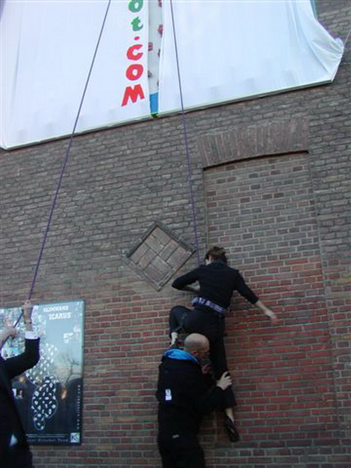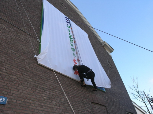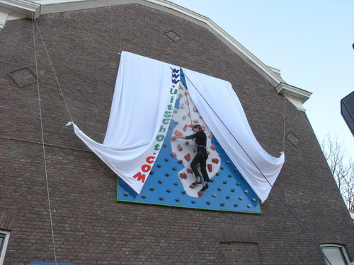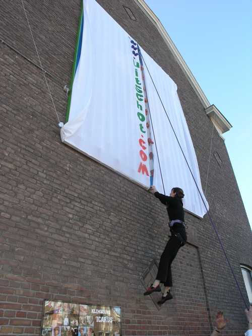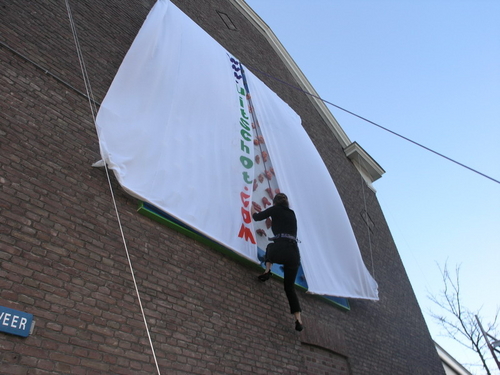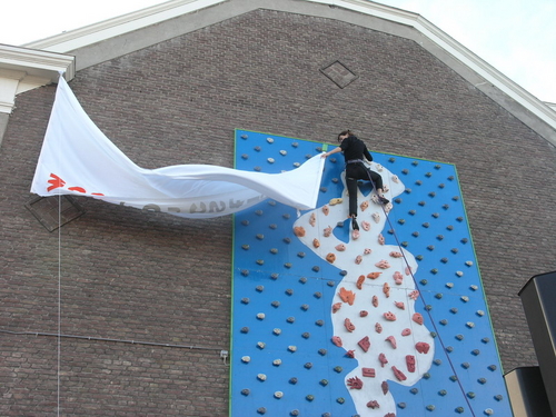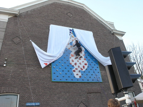 een klimster verwijderde de lakens die het kunstwerk tot het moment van onthulling aan het zicht onttrokken. (Foto's: Chris de Waard, Emile van Aelst en Nick Long).