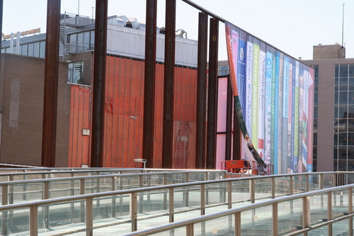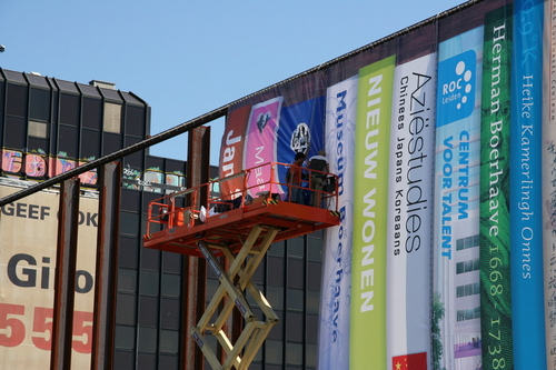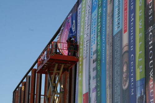 Tijdens de Peurbakkentocht kondigde Studio America uit Leiden het al aan: ‘binnenkort weer’. Daarbij doelend op de boekenkast die bij het Leidse centraal station de enorme bouwput moet verhullen. Vandaag heeft het bedrijf de daad bij het woord gevoegd en werd de kast boek voor boek gevuld. Voor de bevestiging is een heel nieuw ophangsysteem gemonteerd, zodat het 180.000 euro kostende doek nu weer en wind moet kunnen doorstaan.