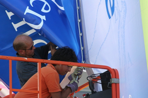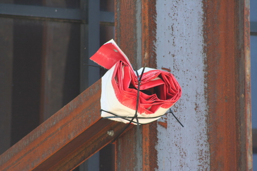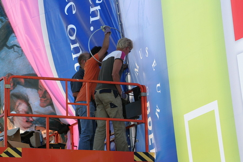 Voor de zekerheid zijn ook de scherpe delen van de stalen constructie ‘bekleed’ zodat deze het promodoek niet kunnen beschadigen.