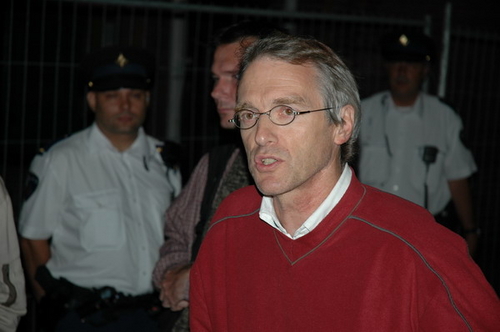 SP-wethouder Jonas fietste 'toevallig' langs tijdens de protestbijeenkomst van Eurodusnie. Onder toeziend oog van de politie voerde hij kort het woord tijdens de protestactie. (Foto: Chris de Waard).