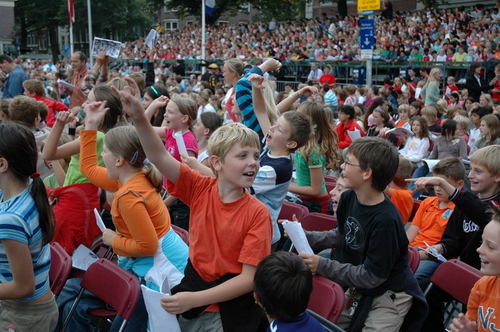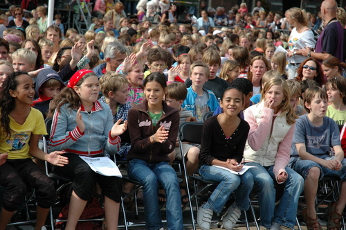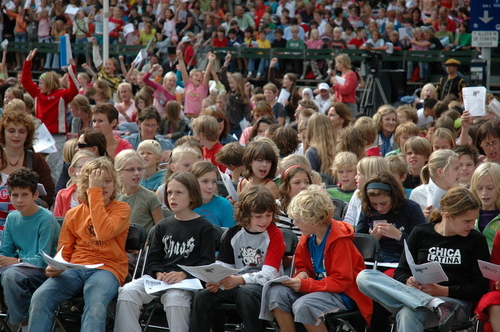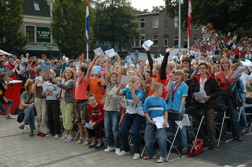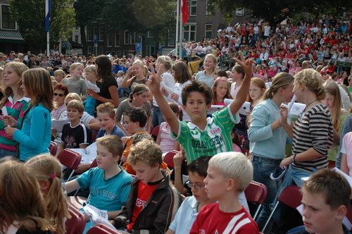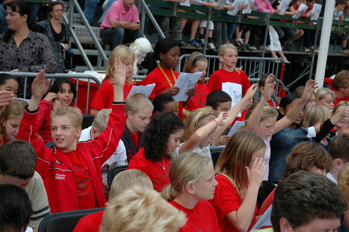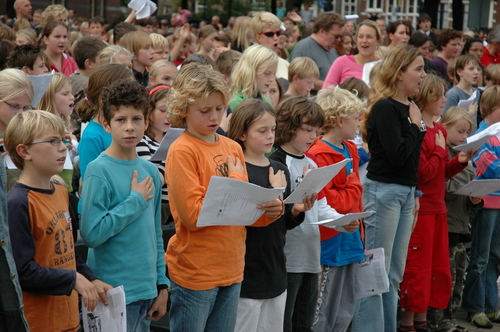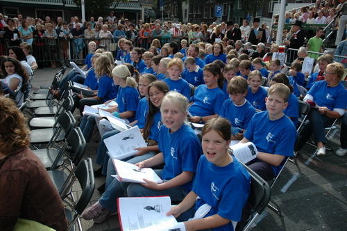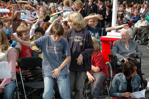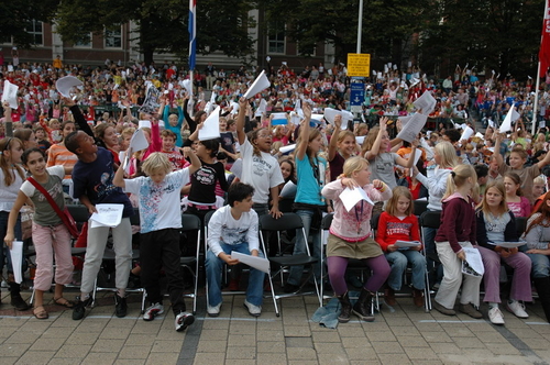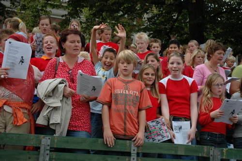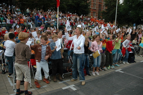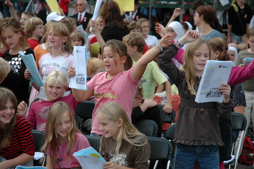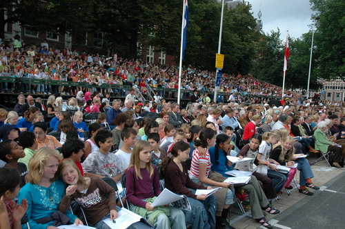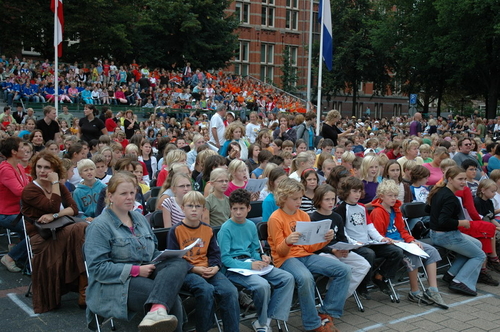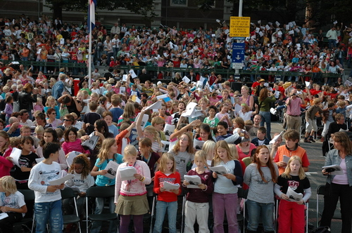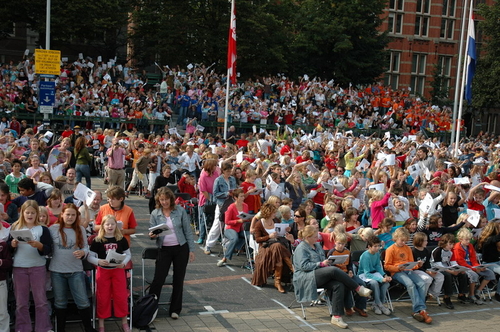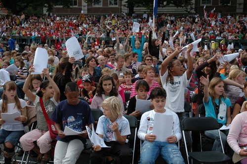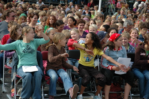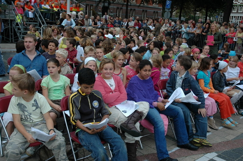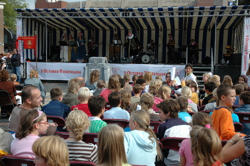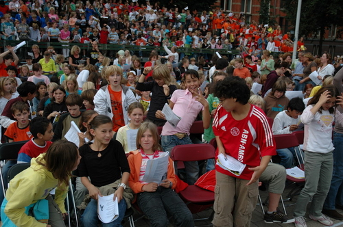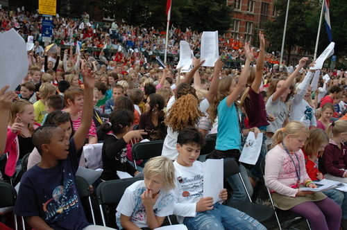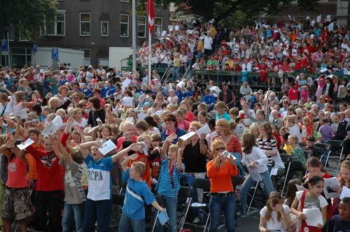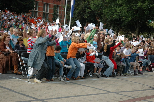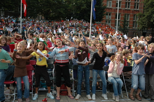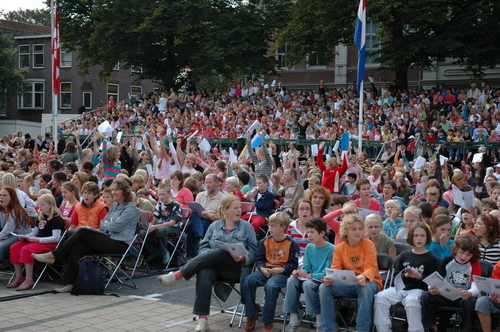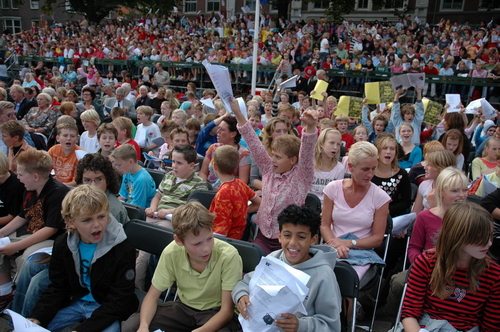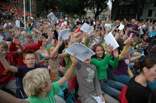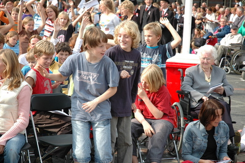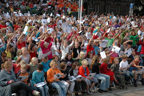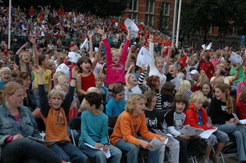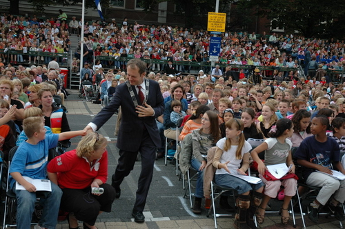 Afgelopen middag werd op de Garenmarkt de 14e Minikoraal gehouden. Ruim 2,5 duizend basisscholieren zongen Leidse en 3-oktoberliedjes. Tussendoor kregen ze van burgemeester Van der Werff verhalen te horen over de geschiedenis van Leidens Ontzet. De 'echte' burgemeester, Lenferink, stond voor de gelegenheid zijn ambtsketen af aan zijn collega. (Foto's: Chris de Waard).