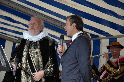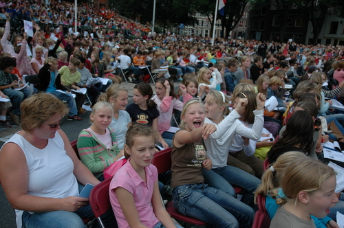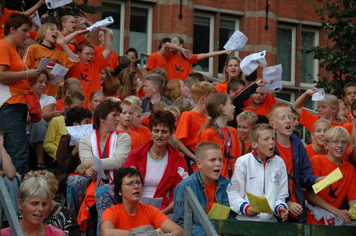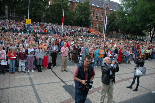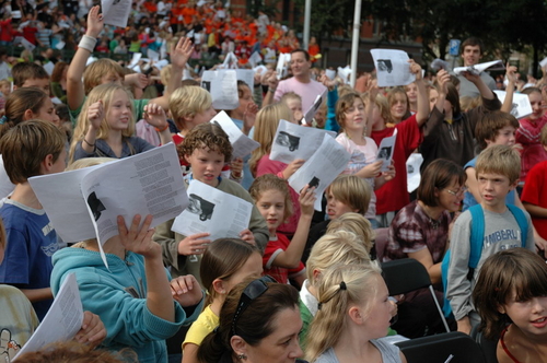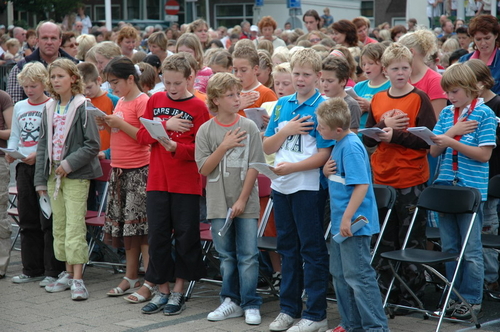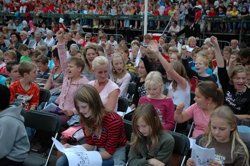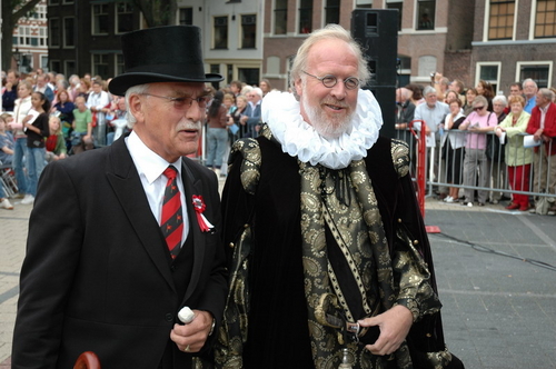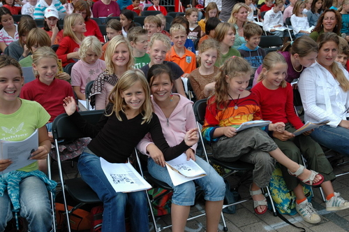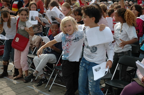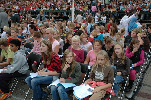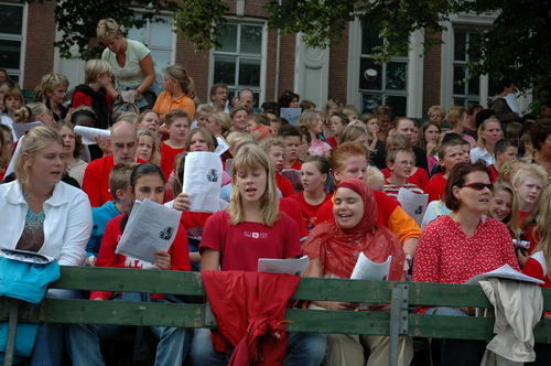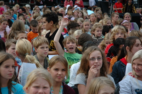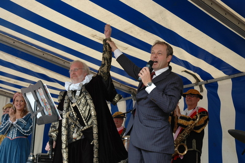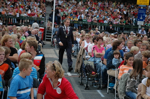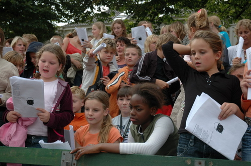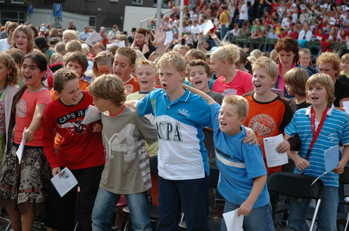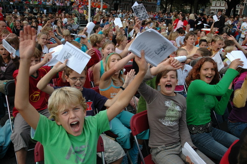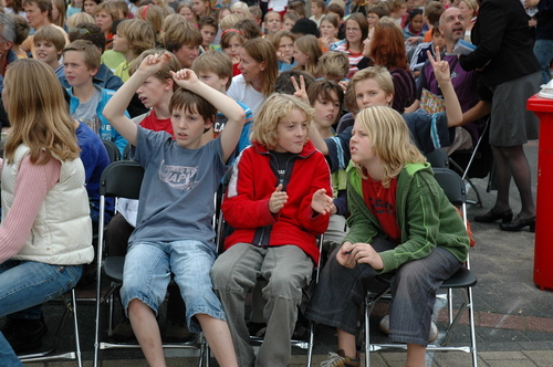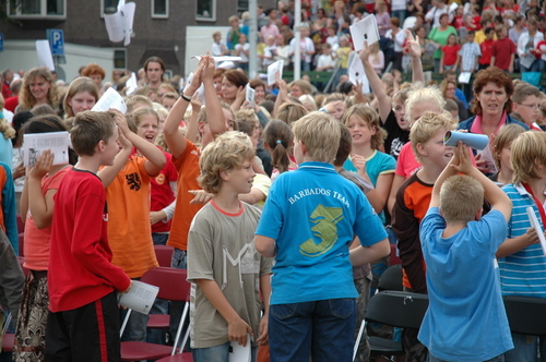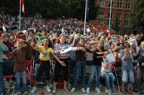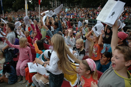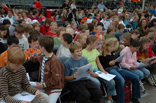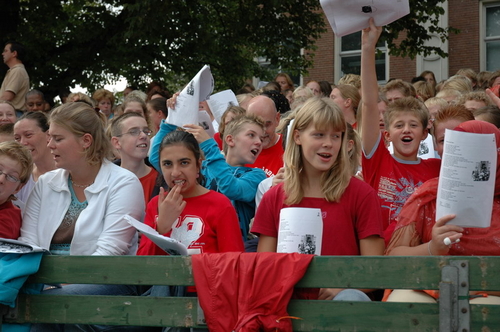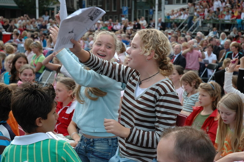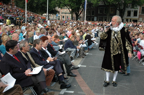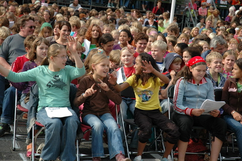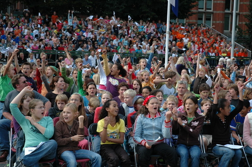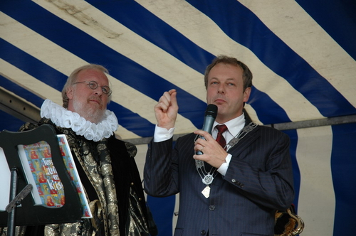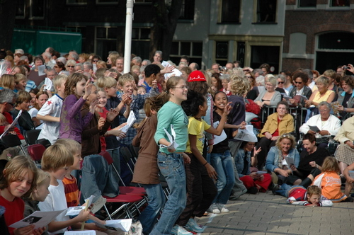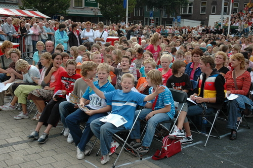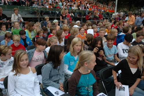Afgelopen middag werd op de Garenmarkt de 14e Minikoraal gehouden. Ruim 2,5 duizend basisscholieren zongen Leidse en 3-oktoberliedjes. Tussendoor kregen ze van burgemeester Van der Werff verhalen te horen over de geschiedenis van Leidens Ontzet. De 'echte' burgemeester, Lenferink, stond voor de gelegenheid zijn ambtsketen af aan zijn collega. (Foto's: Chris de Waard).