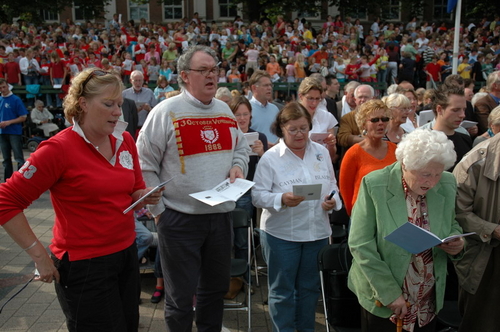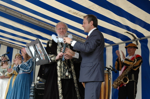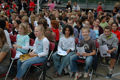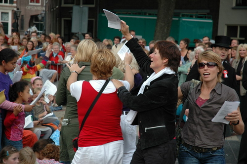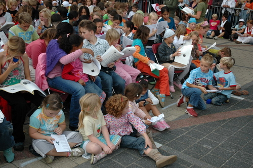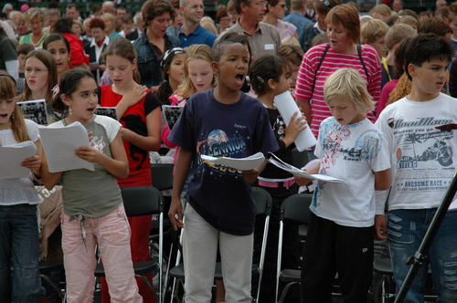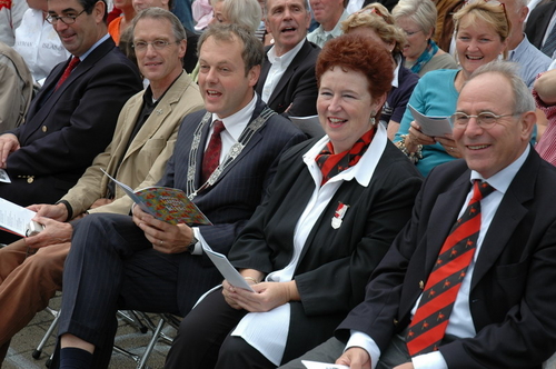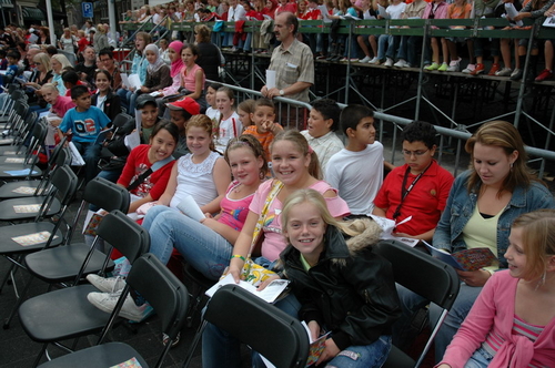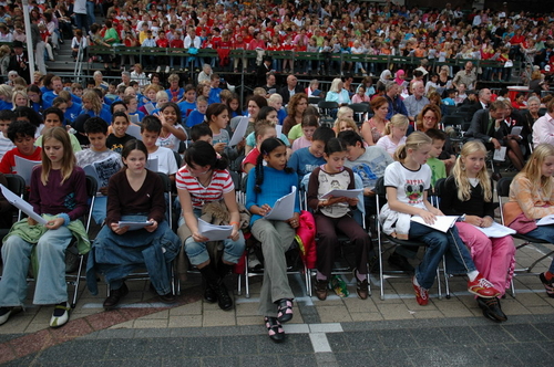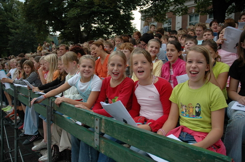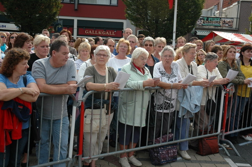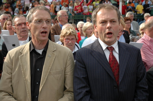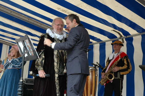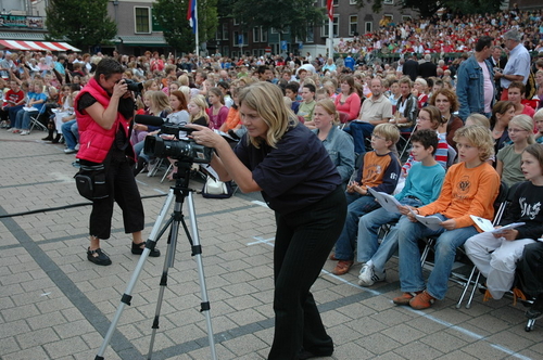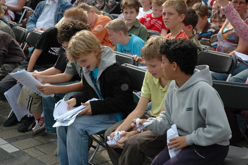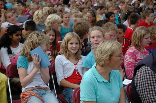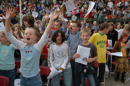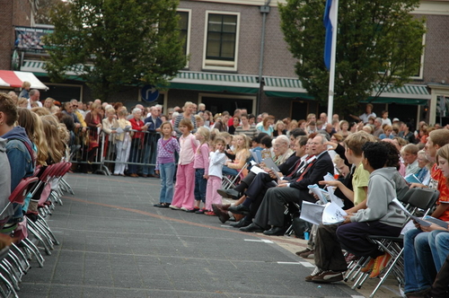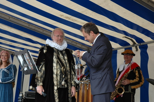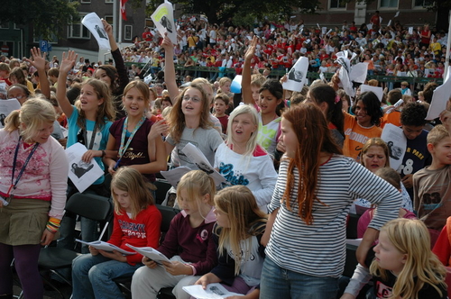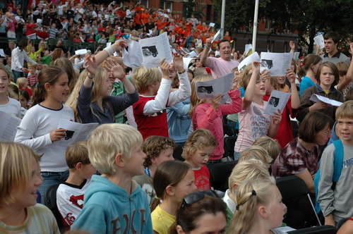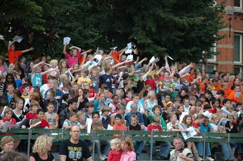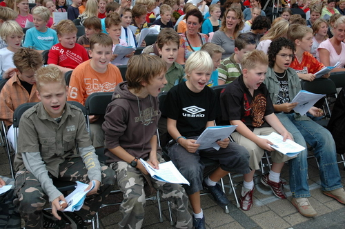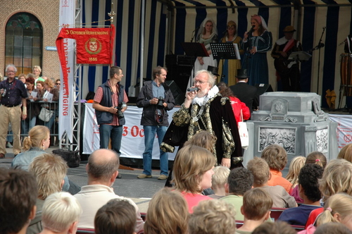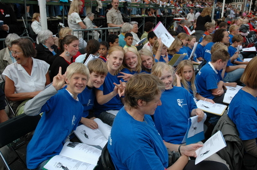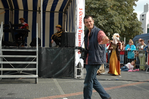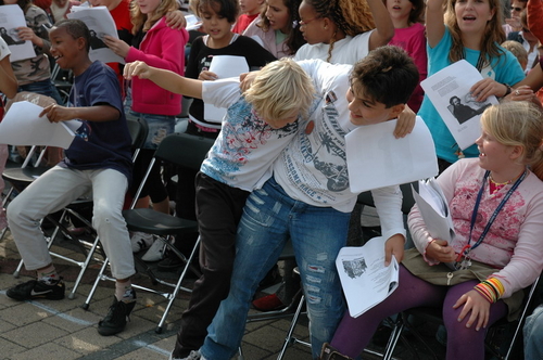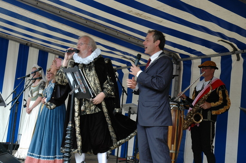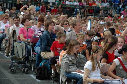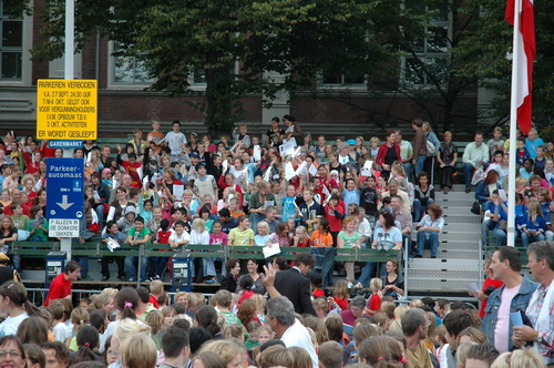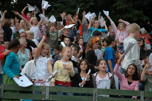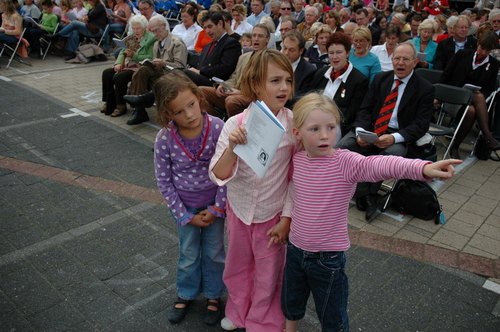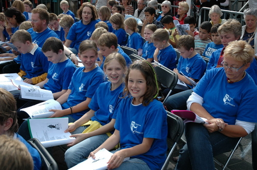 Afgelopen middag werd op de Garenmarkt de 14e Minikoraal gehouden. Ruim 2,5 duizend basisscholieren zongen Leidse en 3-oktoberliedjes. Tussendoor kregen ze van burgemeester Van der Werff verhalen te horen over de geschiedenis van Leidens Ontzet. De 'echte' burgemeester, Lenferink, stond voor de gelegenheid zijn ambtsketen af aan zijn collega. (Foto's: Chris de Waard).