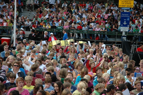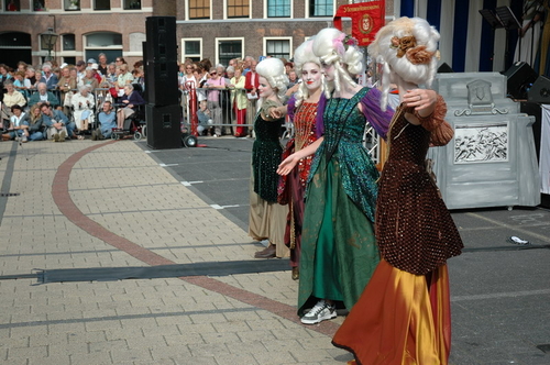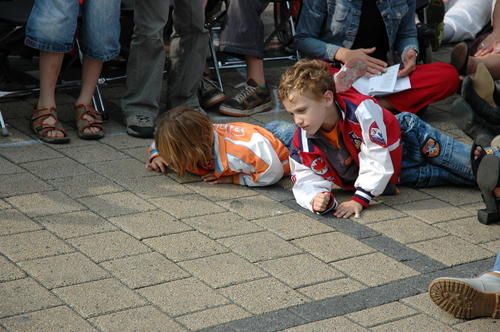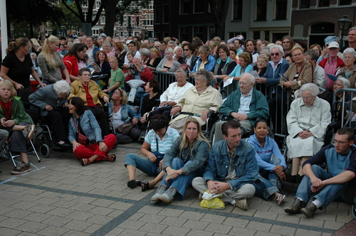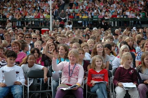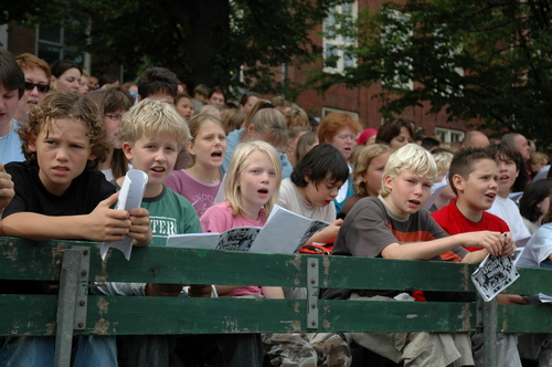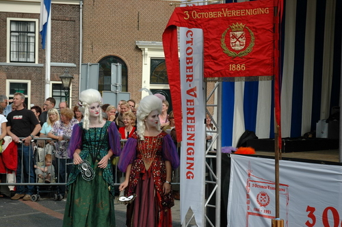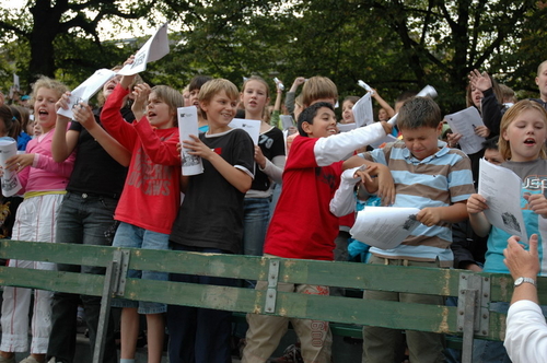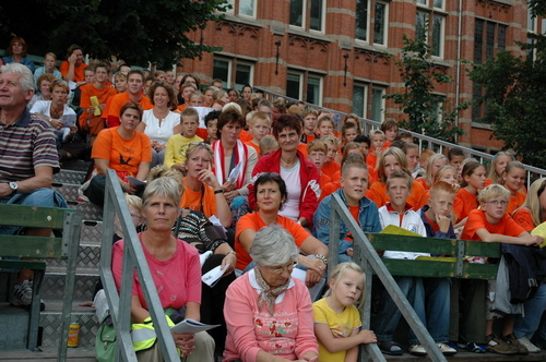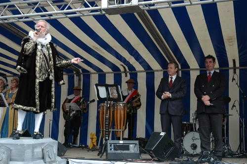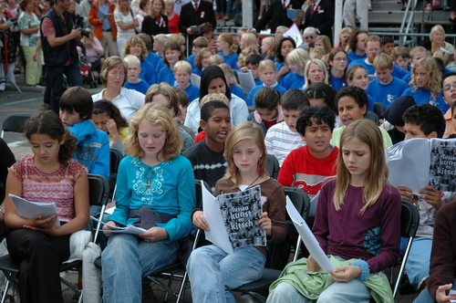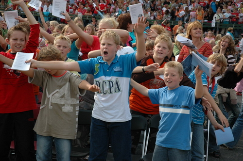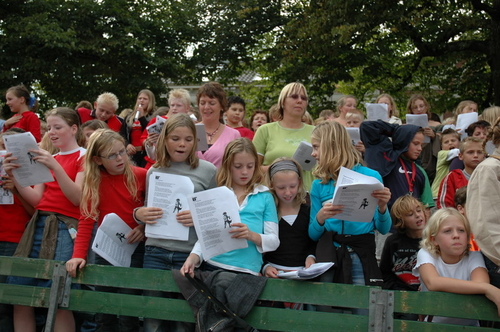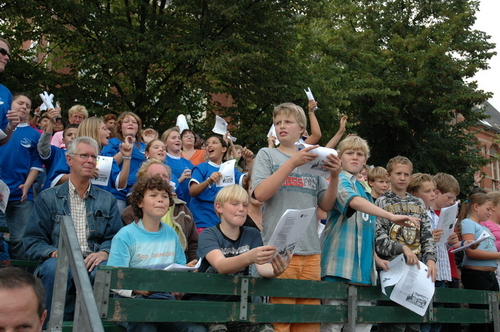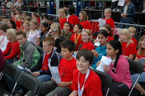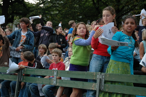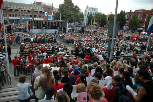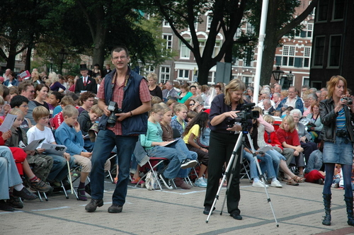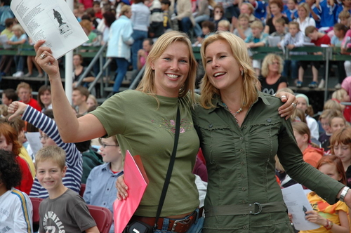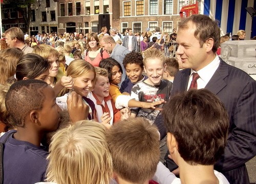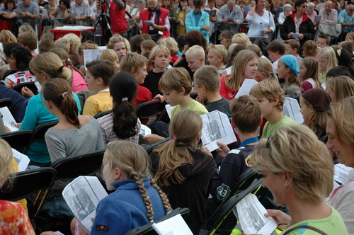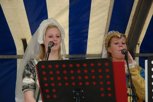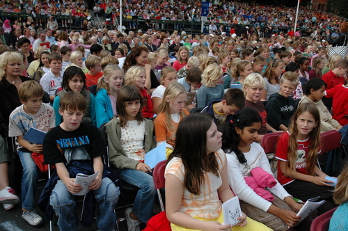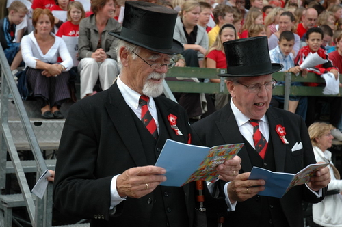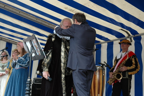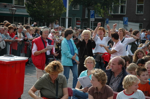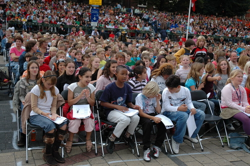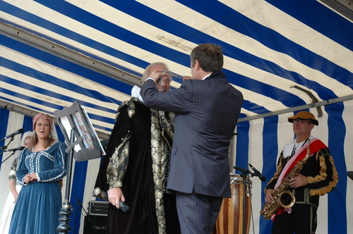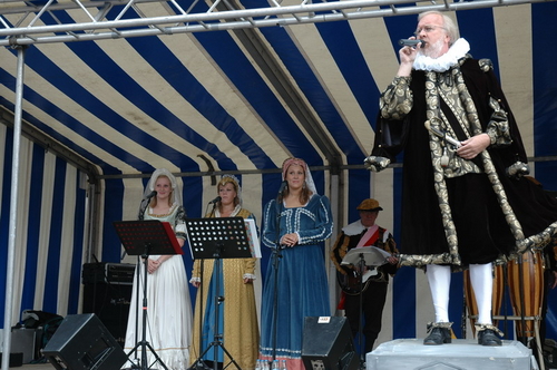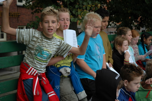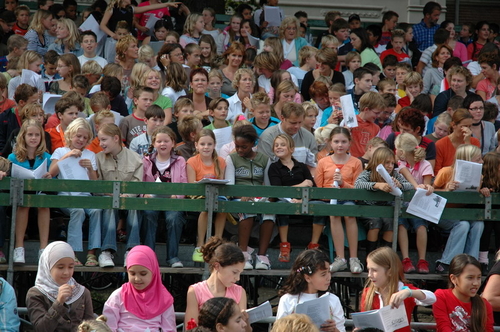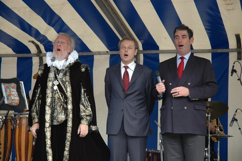 Afgelopen middag werd op de Garenmarkt de 14e Minikoraal gehouden. Ruim 2,5 duizend basisscholieren zongen Leidse en 3-oktoberliedjes. Tussendoor kregen ze van burgemeester Van der Werff verhalen te horen over de geschiedenis van Leidens Ontzet. De 'echte' burgemeester, Lenferink, stond voor de gelegenheid zijn ambtsketen af aan zijn collega. (Foto's: Chris de Waard).