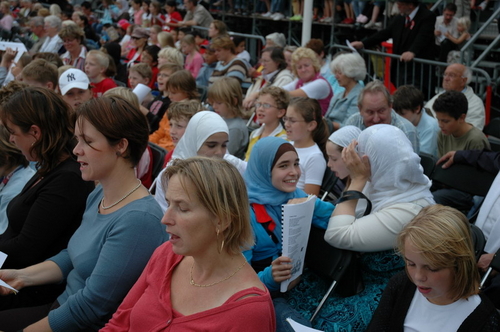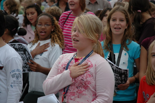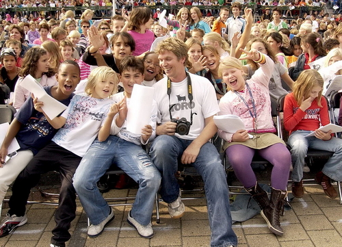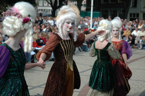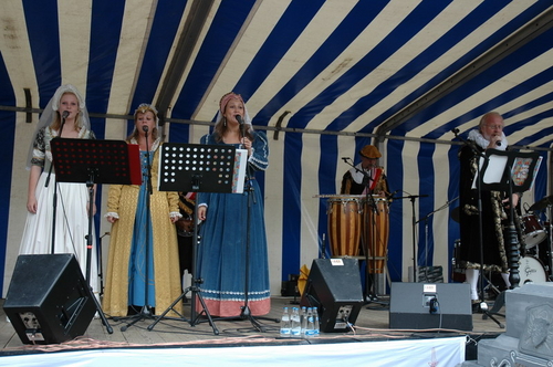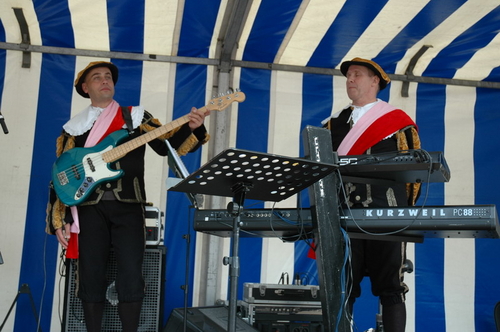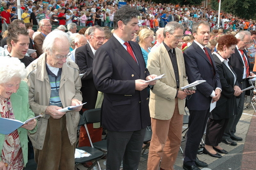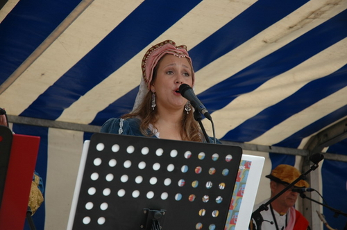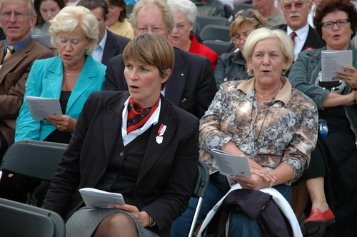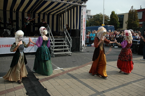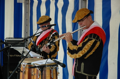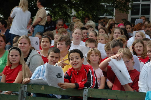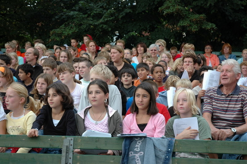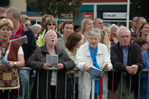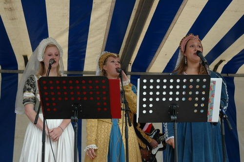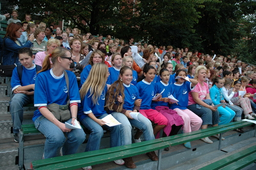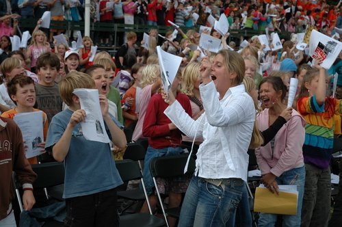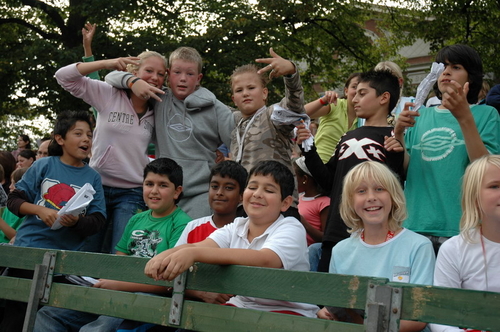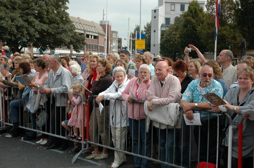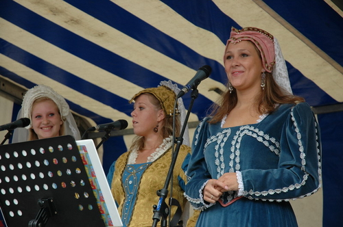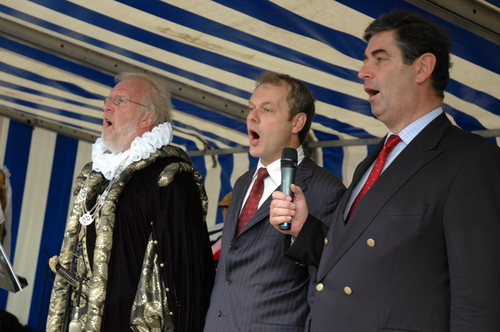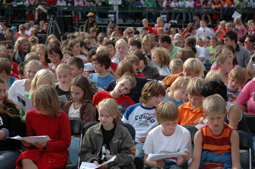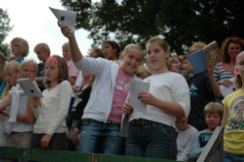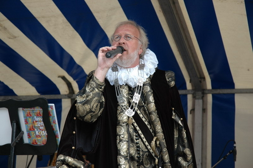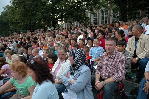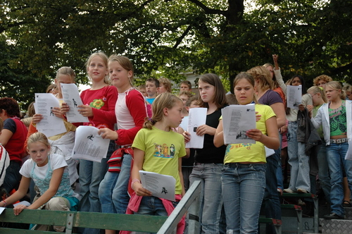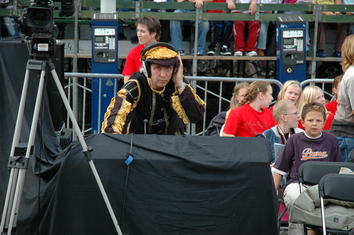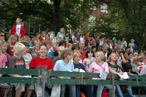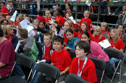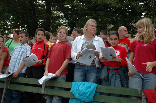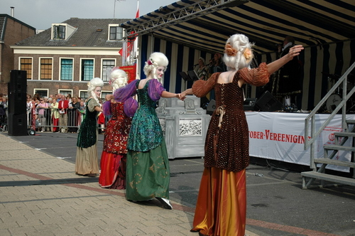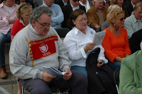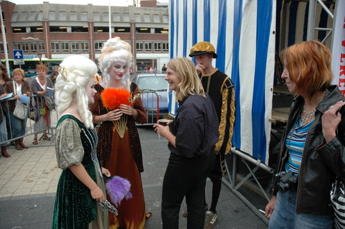 Afgelopen middag werd op de Garenmarkt de 14e Minikoraal gehouden. Ruim 2,5 duizend basisscholieren zongen Leidse en 3-oktoberliedjes. Tussendoor kregen ze van burgemeester Van der Werff verhalen te horen over de geschiedenis van Leidens Ontzet. De 'echte' burgemeester, Lenferink, stond voor de gelegenheid zijn ambtsketen af aan zijn collega. (Foto's: Chris de Waard).