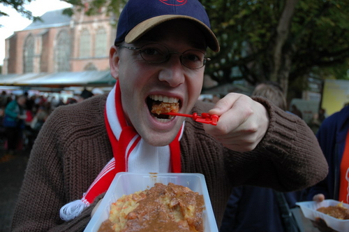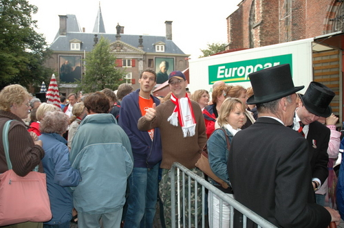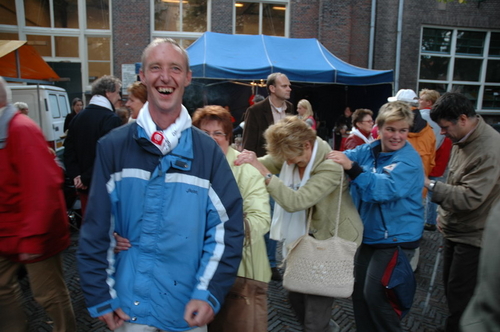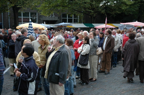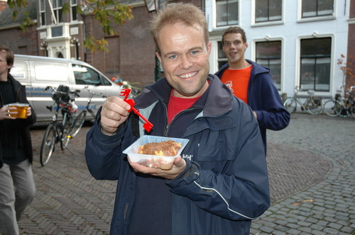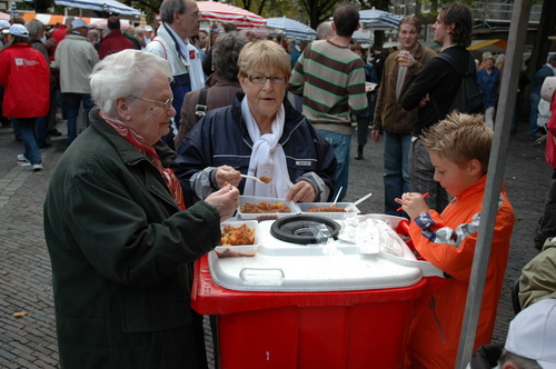 In anderhalf uur tijd 3200 hutspotmaaltijden serveren is beslist geen sinecure maar ook dit jaar verliep de uitreiking van de gratis hutspotmaaltijd op het Pieterskerkplein weer op rolletjes. Gelukkig bleef het voor de feestvierders droog al was de temperatuur niet zo aangenaam, maar een echte Leidenaar laat zich daar niet door weerhouden. De Leidenaars die lid zijn van de 3 Octobervereeniging konden op vertoon van hun bon die ze eerder moesten ophalen bij de inschrijving voor Haring en Wittebrood hun feestmaaltijd inclusief een consumptie ophalen en aanschuiven bij een van de vele marktkramen die dienst deden als feestdis.
