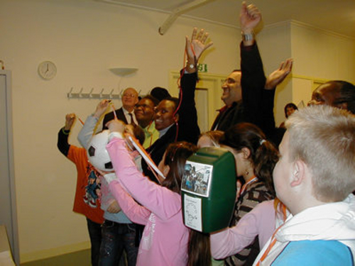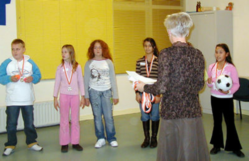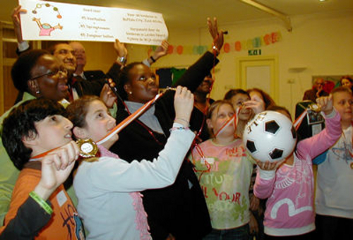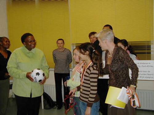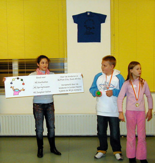 Vanavond om 19.00 uur overhandigde het kindercomité van de Wijk-Olympics de opbrengst van de collecte ten behoeve van Buffalo City aan de vijf afgevaardigden van de Zuid-Afrikaanse delegatie uit die stad. Van die opbrengst is sportmateriaal gekocht voor de kinderen, die in de sloppenwijken van Buffalo City (Zuid-Afrika) wonen. Het geld is bijeengebracht gedurende de tien weken dat Leiden Noord in het teken stond van bewegen: de Wijk-Olympics. Symbolisch werden 45 voetballen, 45 springtouwen en 45 jongleerballen overhandigd! Joke Verberg mag wel de spil van het hele gebeuren genoemd worden; zij heeft veel mensen samengebracht en is zelf ook ter plekke geweest. Verberg bedankte de kinderen voor hun inzet en enthousiasme. De kinderen van het kindercomité overhandigden één voor één de attributen van het gekochte sportmateriaal aan mevrouw Nontobeko Mafu. Mevrouw Mafu, een van de vijf afgevaardigden van de Zuid-Afrikaanse delegatie, onderstreepte het belang van deze actie en vertelde over de situatie van de kinderen in haar stad. Zij beschreef de krottenwijken, de armoede, de werkeloosheid en het feit, dat veel kinderen hun ouders hebben verloren door Aids.