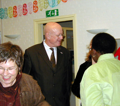 Daarna was het woord aan wethouder Dinesh Vallabh, die de burgemeester van Buffalo City representeerde, die er zelf helaas niet bij kon zijn. “Dank je wel”, zei de heer Vallabh in het Nederlands. De heer Vallabh zei ontroerd te zijn door de actie van deze kinderen en onderstreepte de ‘familieband’ met Leiden. Naast dit project, loopt er ook een zeer belangrijk ‘waterproject’ in Buffalo City, dat moet gaan zorgen voor schoon drinkwater en goede sanitaire voorzieningen. Vallebh schetste de kinderen de situatie van hun leeftijdgenoten in zijn land, die dan al vaak de verantwoordelijkheid moeten dragen voor hun broertjes en zusjes en meestal niet naar school kunnen, omdat er geen geld is voor het verplichte schooluniform. Vallebh bedankte iedereen, mede namens de burgemeester van Buffalo City. Na afloop was het tijd voor typisch Hollandse ‘decemberversnaperingen’, zoals pepernoten en banketstaaf. Vooral de banketstaaf konden de Zuid-Afrikaanse bezoekers goed waarderen.