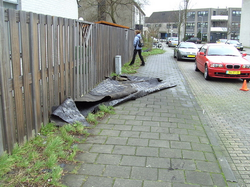 De storm heeft vanmiddag onder meer de dakbedekking van het gezondheidscentrum in de Stevenshof weggeblazen. Brandweer en Politie hebben de Stevenshofdreef afgezet. De stukken dakleer waaiden zo`n 300 meter verderop tegen de ramen van woningen aan het Truus Wijsmullerpad. Over de hoogte van de schade is nog niets bekend. (Foto's: Helgo Tuinhof de Moed (Stevenshof) en Chris de Waard (Plantsoen)).
