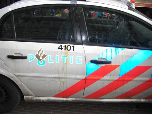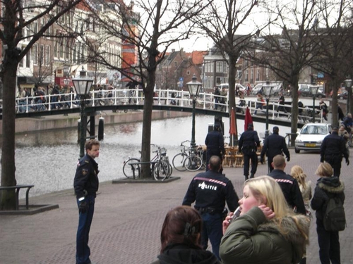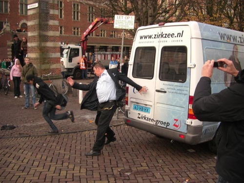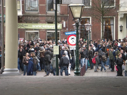 Zo’n 400 stakende Leidse scholieren hebben vandaag voor ongeregeldheden gezorgd in het centrum. Er werden discriminerende teksten als “Hamas, Hams, Joden aan het gas” gescandeerd en bussen, politiewagens en winkels werden bedolven onder een regen van eieren. Ook enkele winkelruiten moesten het ontgelden en een chauffeur van een busje van het Stadsparkeerplan aan de Haagweg werd uit zijn bus getrokken en mishandeld toen hij zich vastreed in een groep scholieren bij het Stadhuisplein. Ook werd de bus van binnen en buiten met eieren bekogeld. Stadsparkeerplan heeft direct daarna de route door het centrum geschrapt. Passagiers werden bij het Kort Rapenburg afgezet.