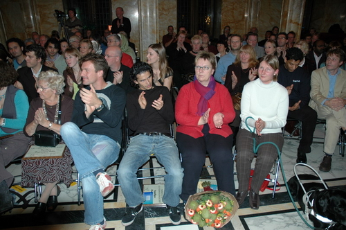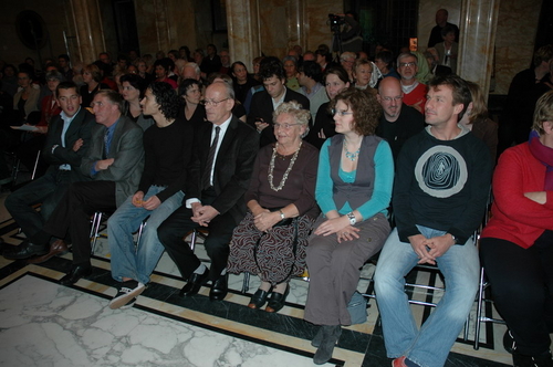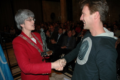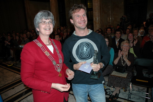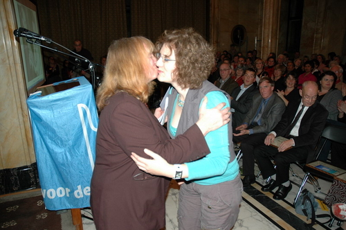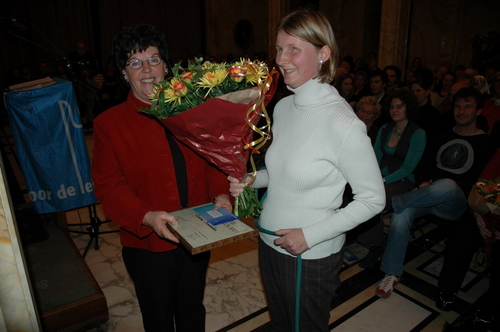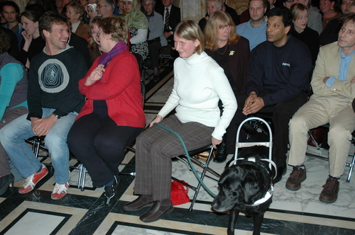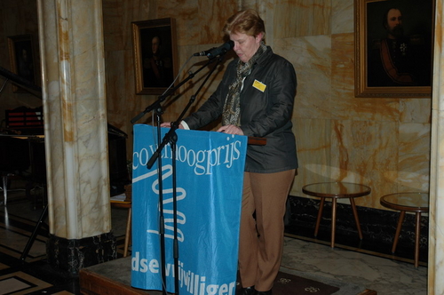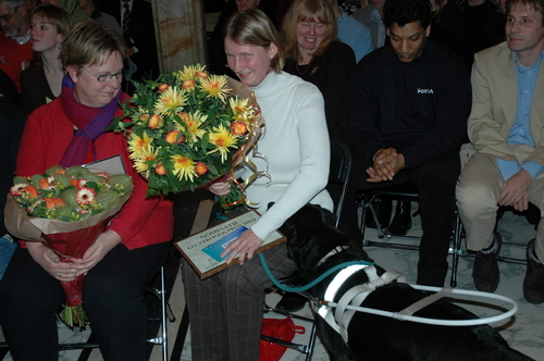 Gisteravond werd in de Burgerzaal van het Leidse stadhuis voor de 15e keer de Co Verhoog vrijwilligersprijs uitgereikt. Uit tien genomineerden koost de jury uiteindelijk voor de vrijwilligers van VTV Leiden die verstandelijk gehandicapten onder meer ontspanning bieden met muziek en sport. Onder de genomineerden was ook Sleutelstad-redactrice Corine Knoester met hond Co. Corine werd door jurylid Ella Veenstra uitgebreid geprezen vanwege haar grote inzet voor mensen met een handicap. Zo is ze bestuurslid van de Nederlandse Vereniging voor Blinden en Slechtzienden (NVBS), helpt ze gehandicapte asielzoekers, organiseert ze wandelingen met geleidehonden en houdt ze een weblog bij. Ook nam ze het initiatief voor een e-mailgroep waar blinden en slechtzienden op een makkelijke manier met elkaar kunnen corresponderen. De Co Verhoogprijs won ze er niet mee, wel de felicitaties van alle collega’s bij Sleutelstad.nl!