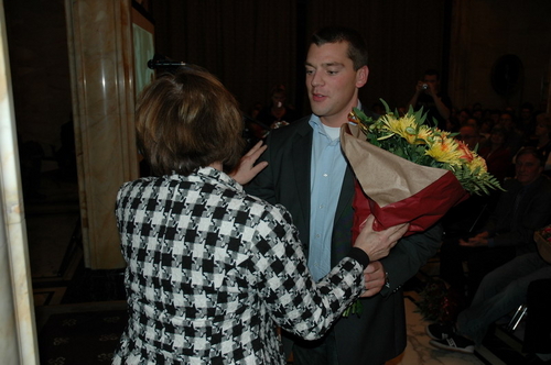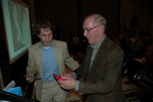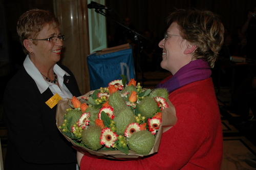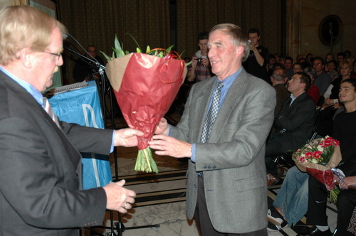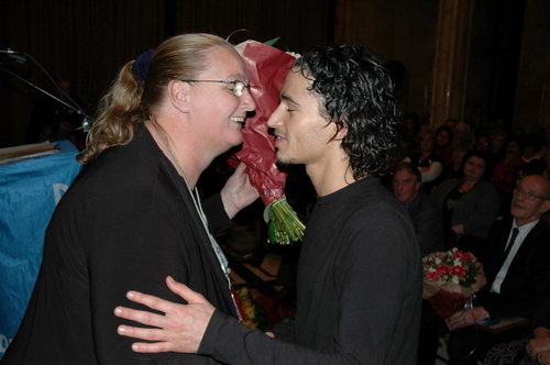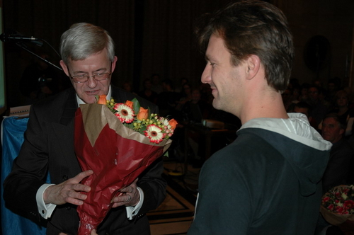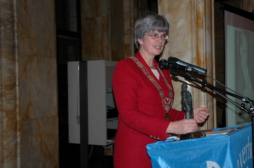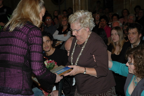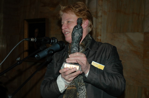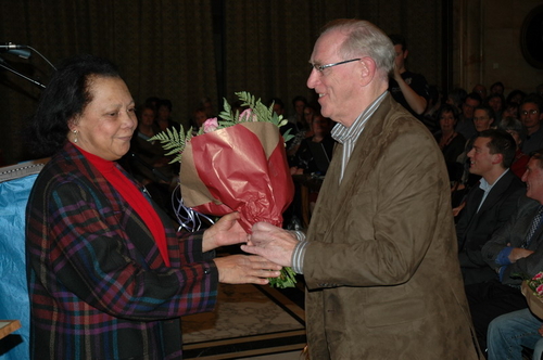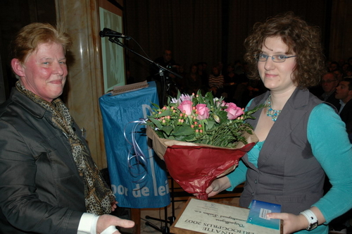 Loco-burgemeester Gerda van den Berg reikte afgelopen avond de Co Verhoogprijs 2007 uit aan de vrijwilligers van de Leidse afdeling van VTV Zuid-Holland Noord (Vrije Tijd en Vorming). Het VTV organiseert vrijetijd, vorming en ontspanning voor mensen met een verstandelijke beperking. Vrijwilliger Remko Roodenburg nam het beeldje namens de hele club in ontvangst. (Foto's: Chris de Waard).