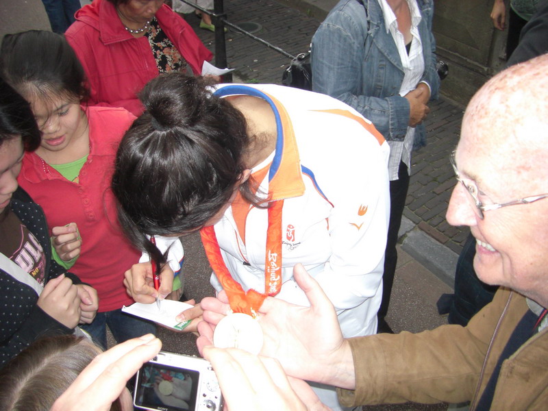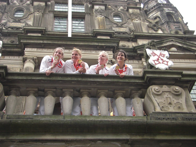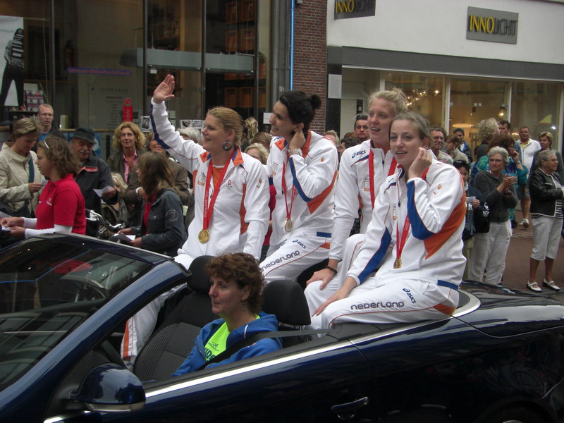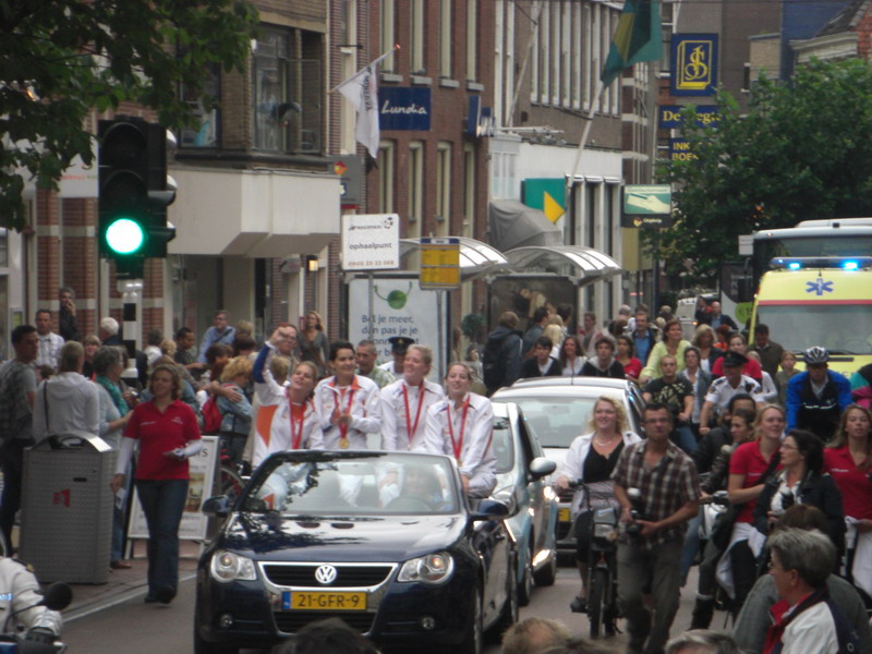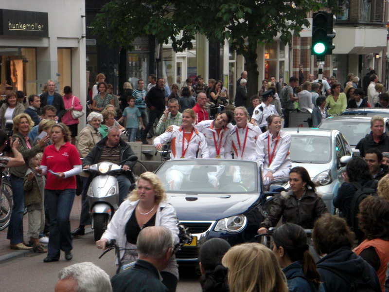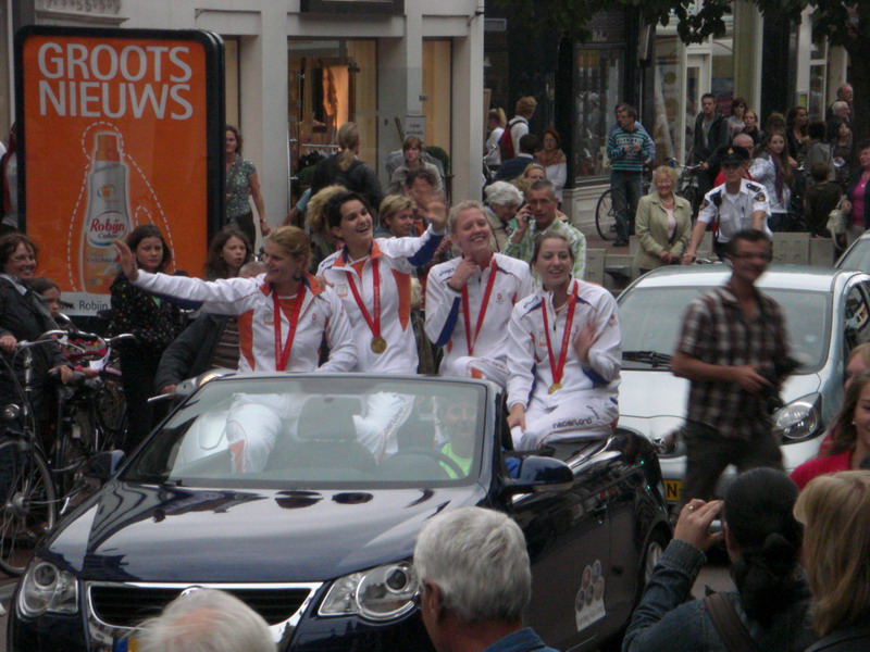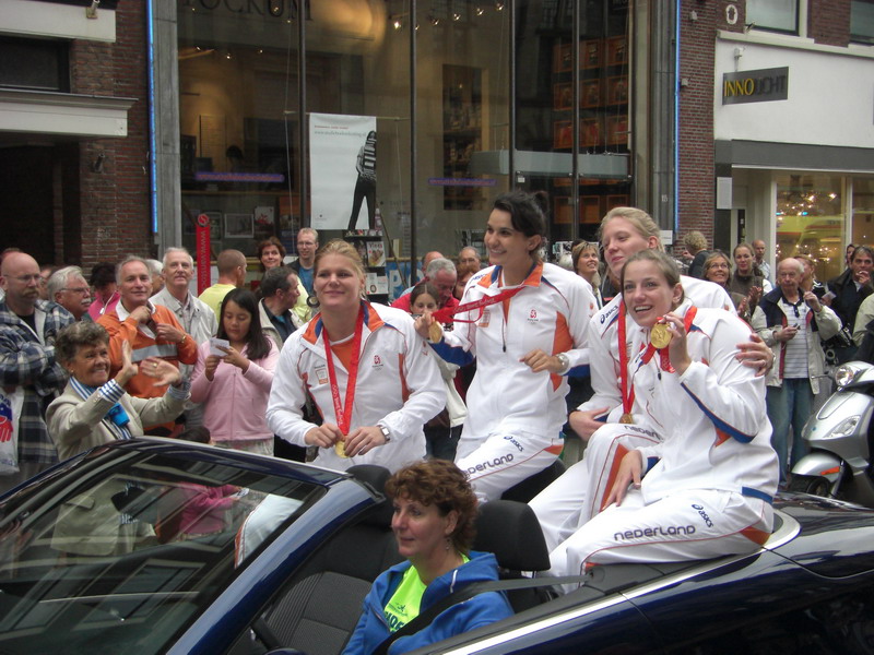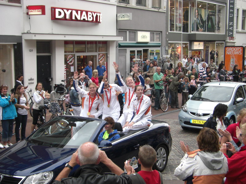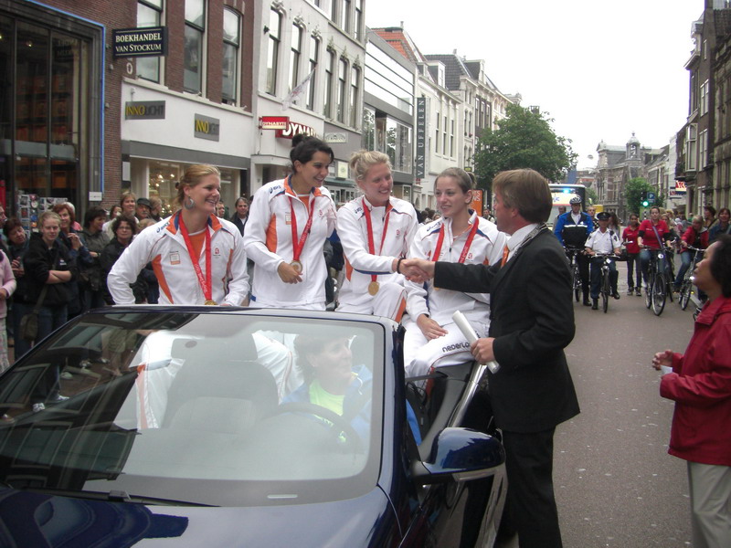 Onder enorme belangstelling reden de Leidse waterpoloërs die op de Olympische Spelen goud haalden gisteren door de stad. Bij het stadhuis werden ze gehuldigd en ontvingen voor de tweede keer goud: de Gouden Penning van de gemeente Leiden. Vanmorgen zijn alle olympische medaillewinnaars ontvangen door premier Balkenende en Koningin Beatrix. Vrijdag volgt er nog een laatste officiële Leidse olympische huldiging'. Dan wordt op het hoofdbureau van de Politie Hollands Midden in Leiderdorp roeister Femke Dekker in het zonnetje gezet. De Leidse politiemedewerkster haalde een zilveren medaille op de Olympische Spelen met de vrouwen-acht roeiploeg. (Foto's: Dennis Oudshoorn).