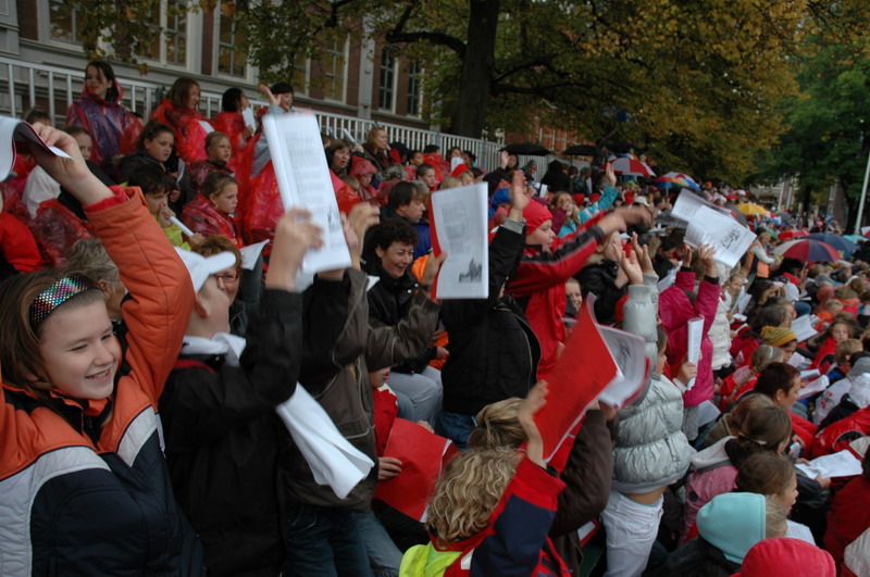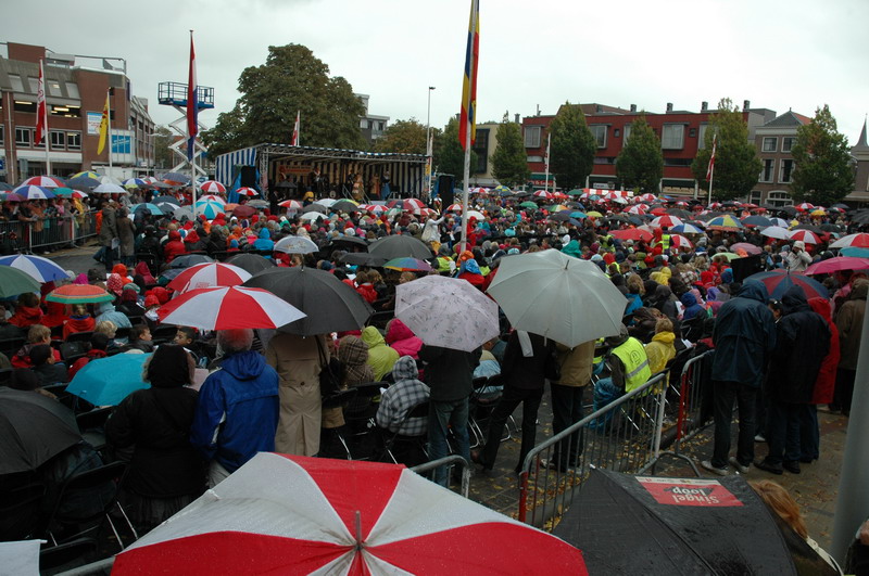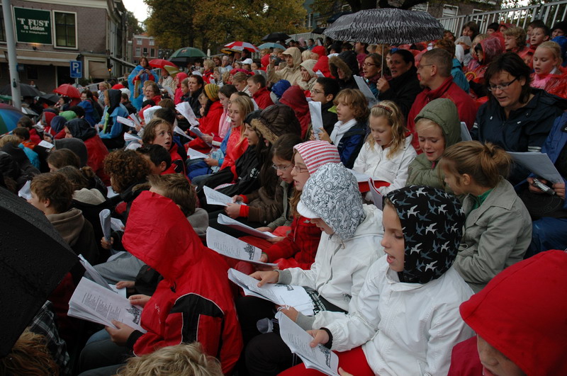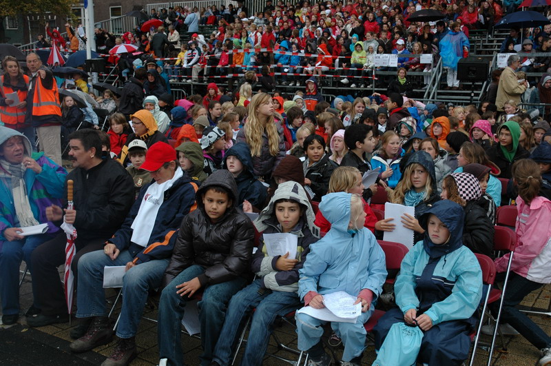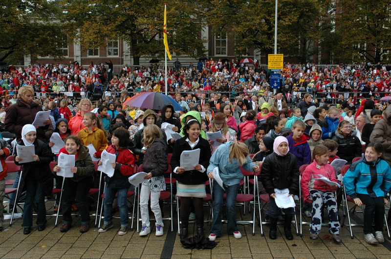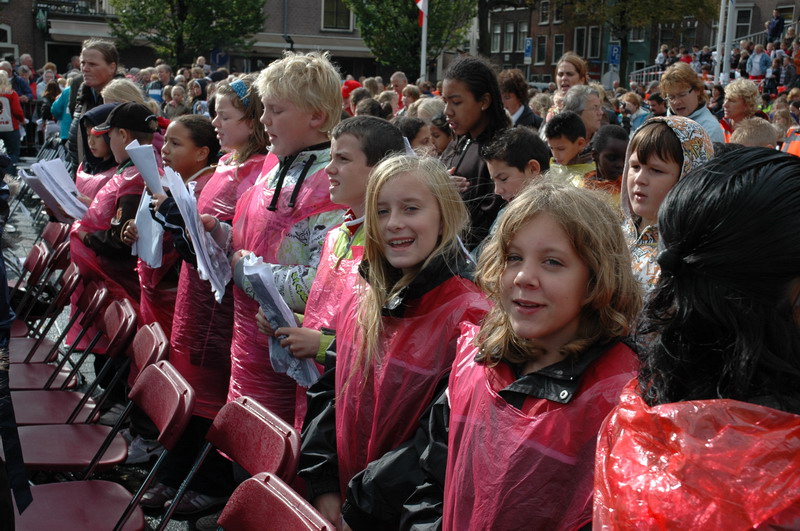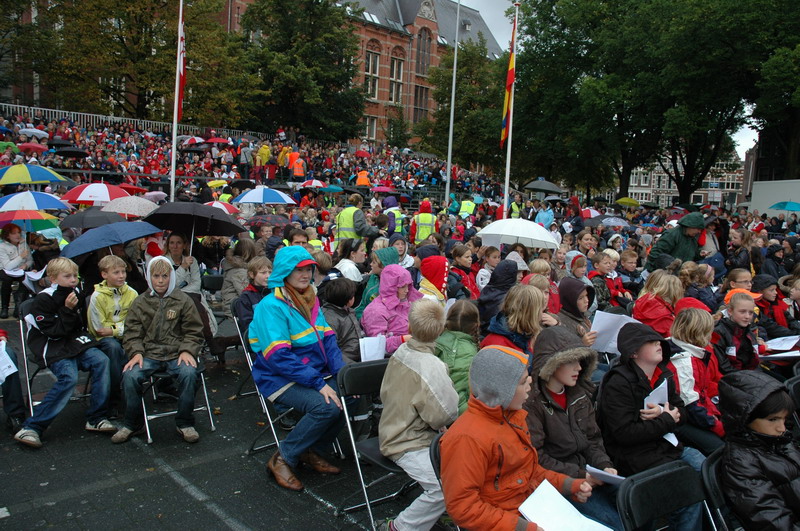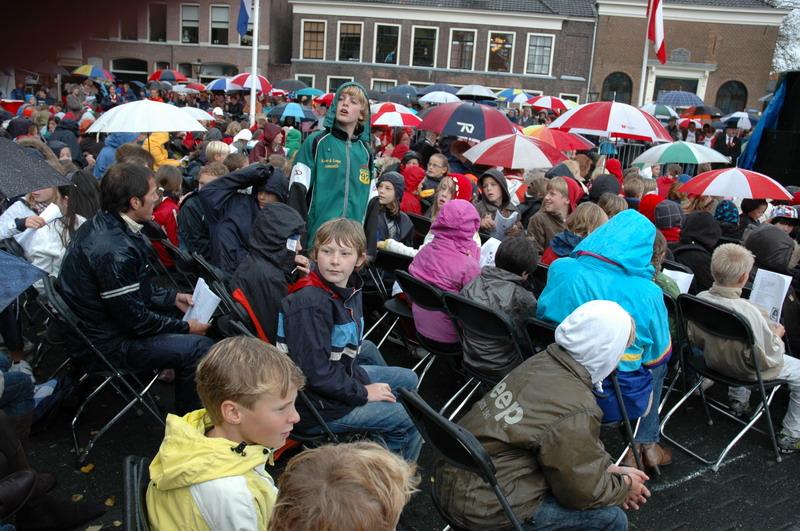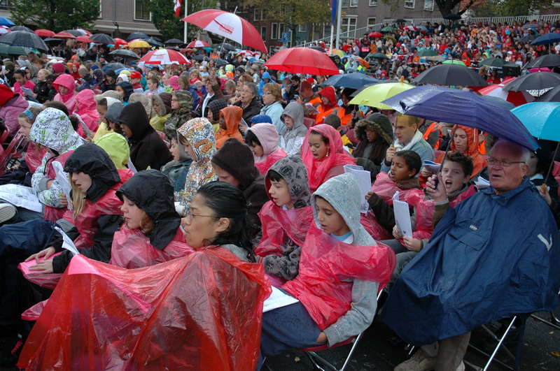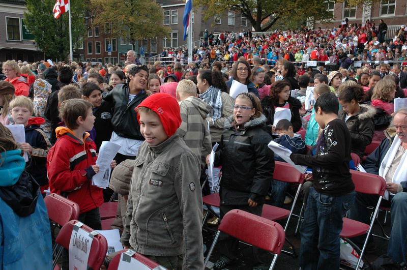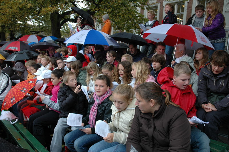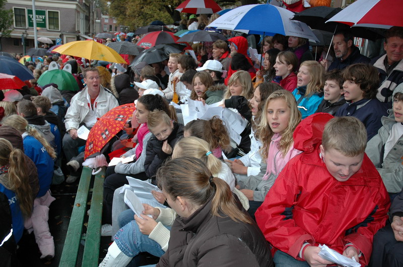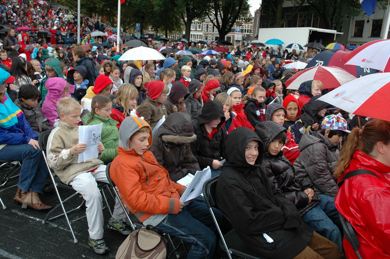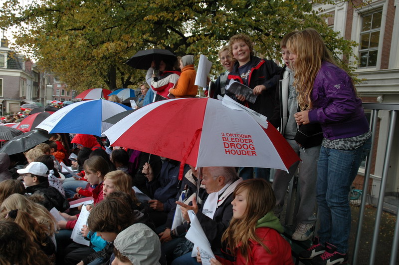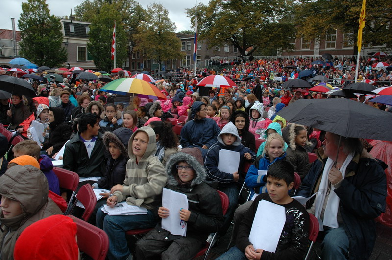 Hoewel de regen bij tijd en wijle met bakken uit de hemel kwam, had slechts een enkele basisschool vandaag besloten de leerlingen niet aan de elementen bloot te stellen tijdens het Minikoraal vanmorgen. Zij die wel kwamen zingen op de Garenmarkt, leek de regen niet te deren. Gewapend met poncho’s en paraplu’s vermaakten de duizenden scholieren zich prima met de liedjes over 3 oktober.