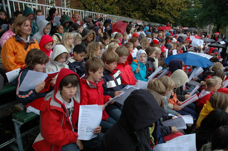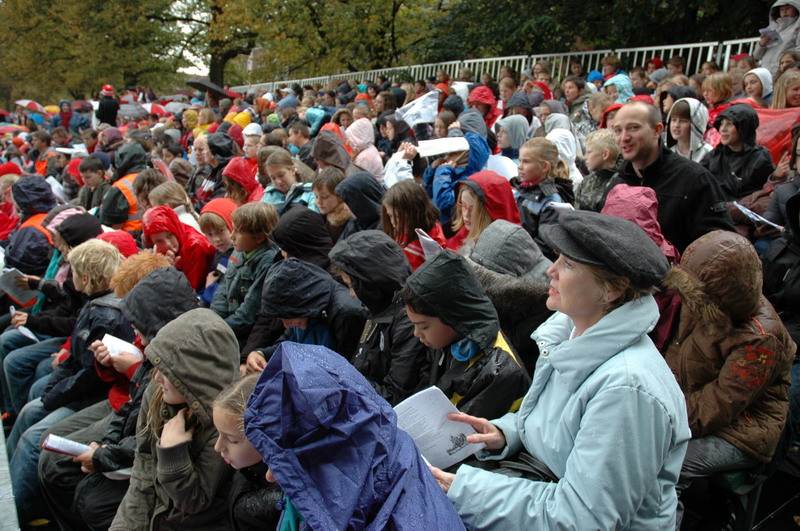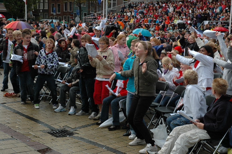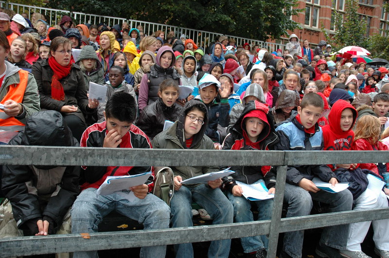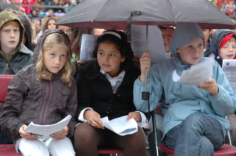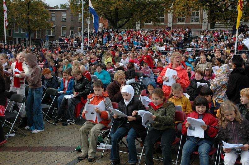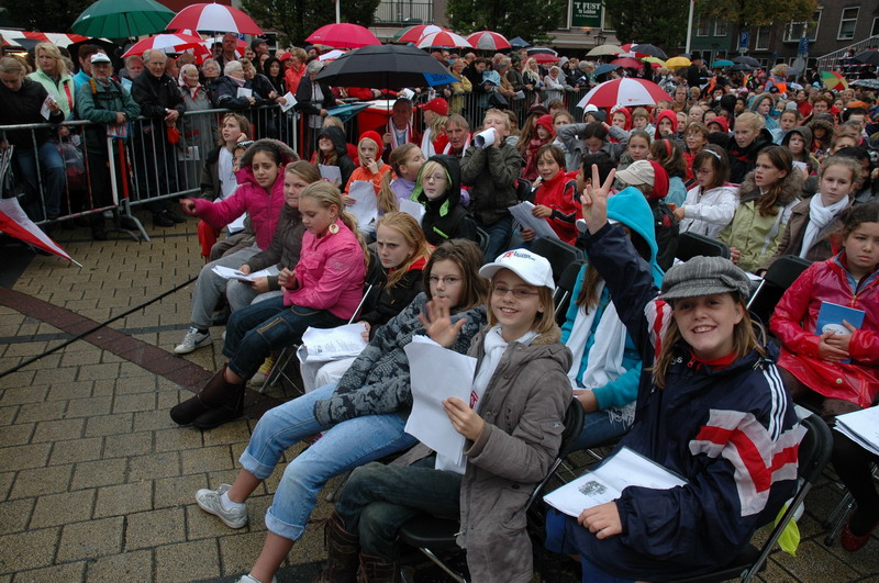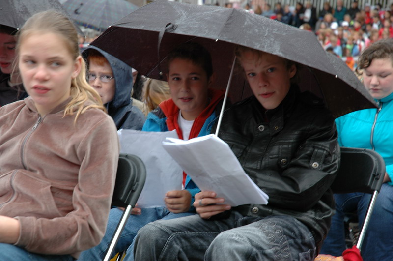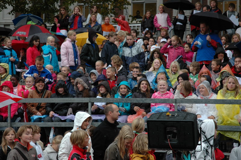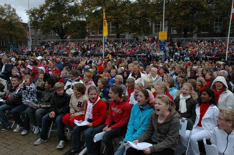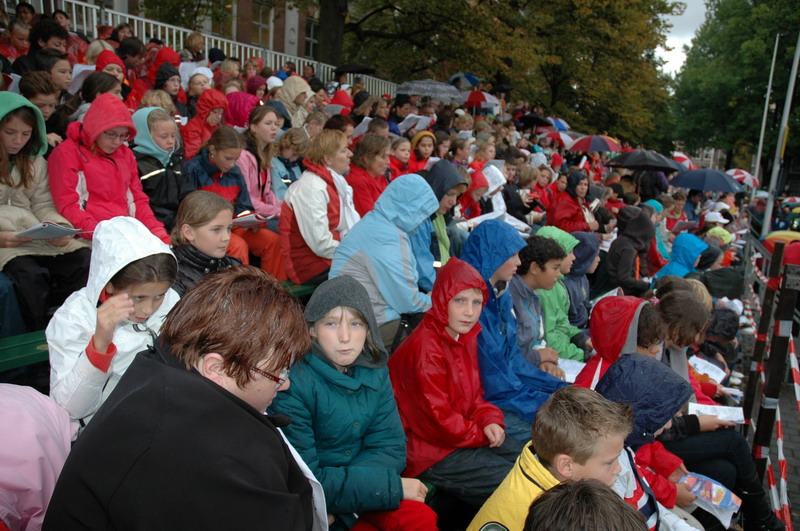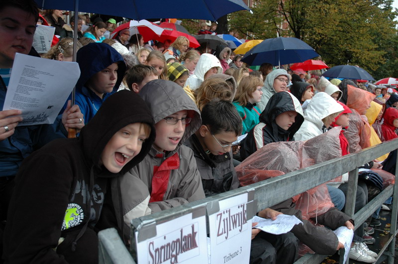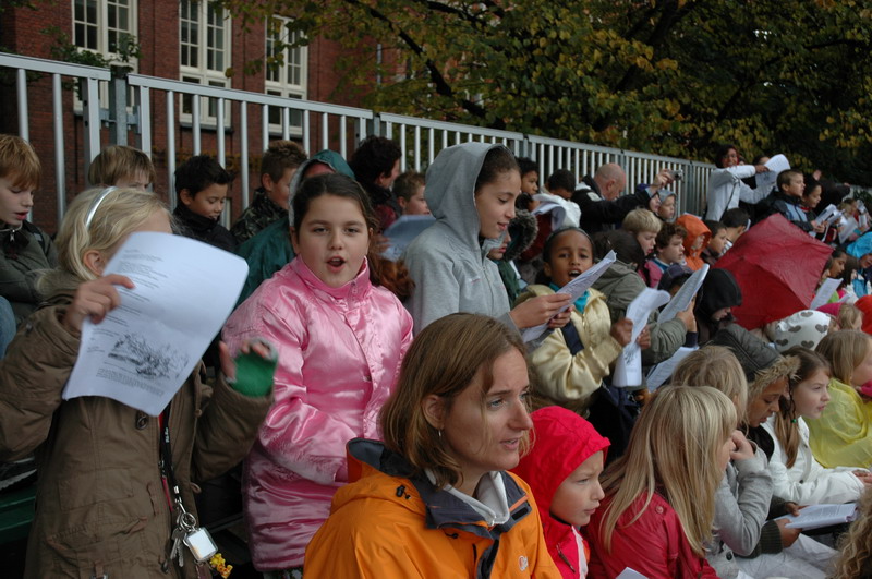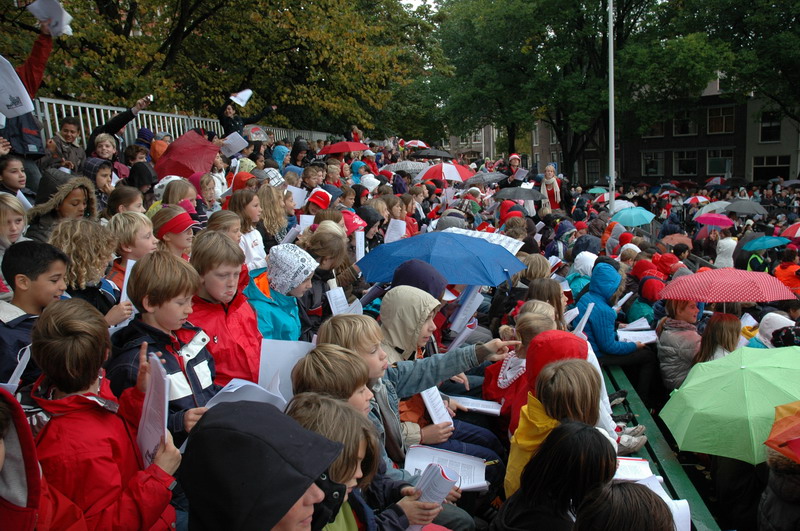 Hoewel de regen bij tijd en wijle met bakken uit de hemel kwam, had slechts een enkele basisschool vandaag besloten de leerlingen niet aan de elementen bloot te stellen tijdens het Minikoraal vanmorgen. Zij die wel kwamen zingen op de Garenmarkt, leek de regen niet te deren. Gewapend met poncho’s en paraplu’s vermaakten de duizenden scholieren zich prima met de liedjes over 3 oktober.