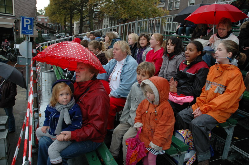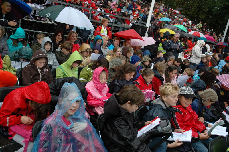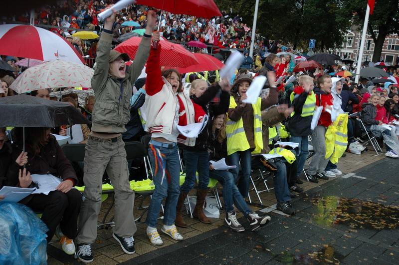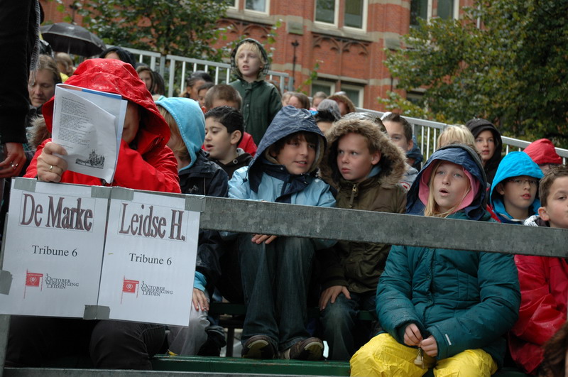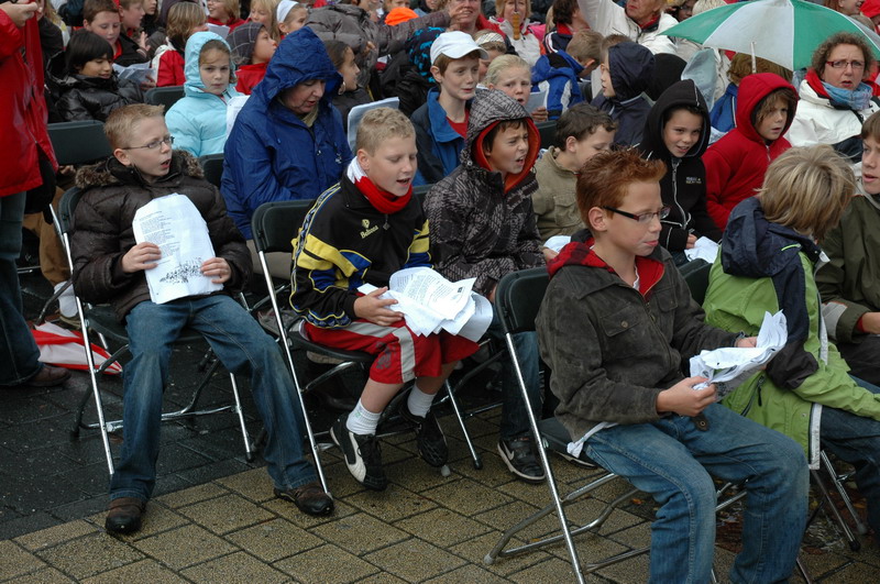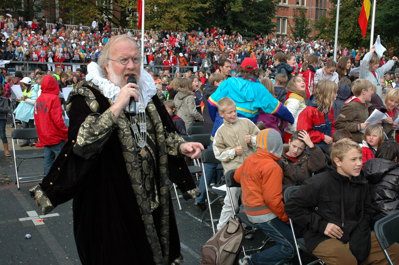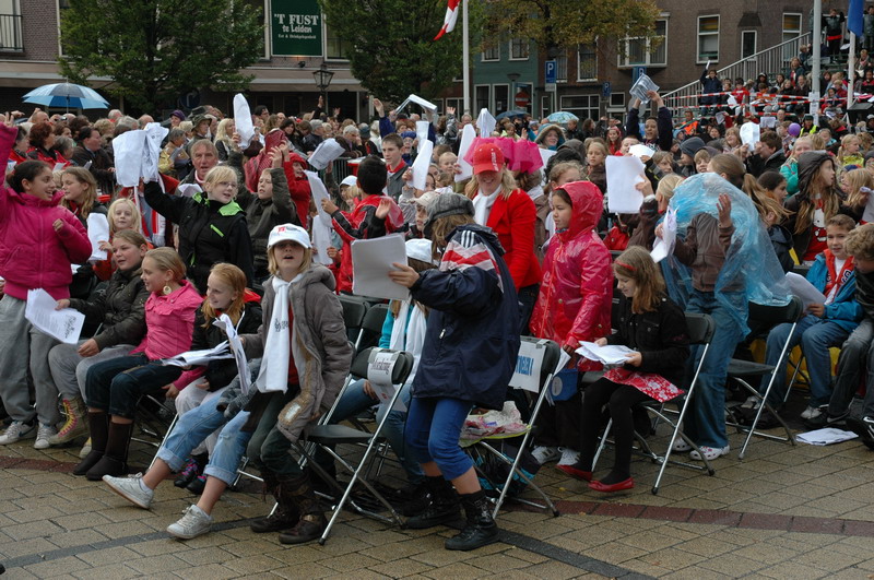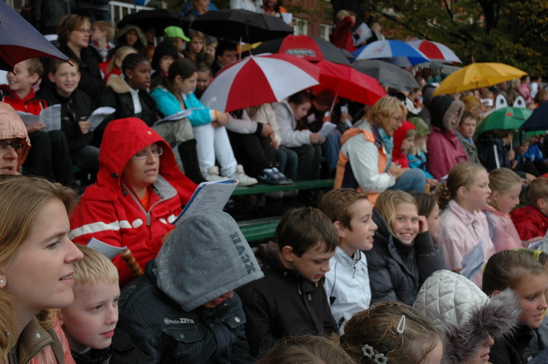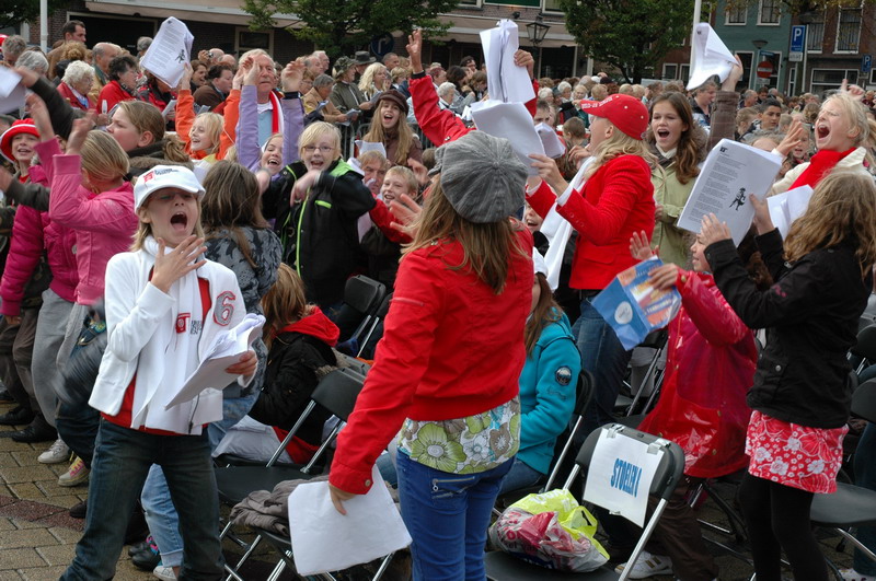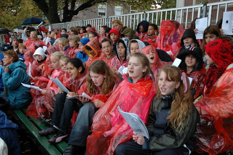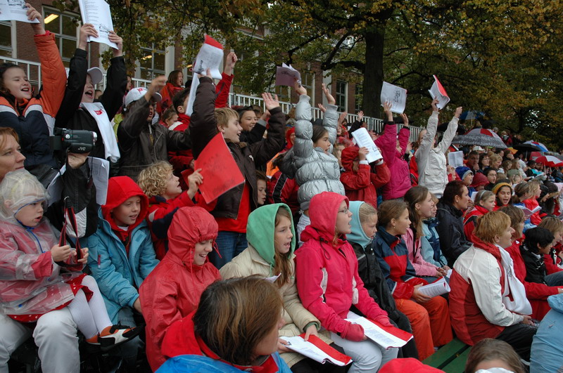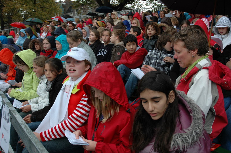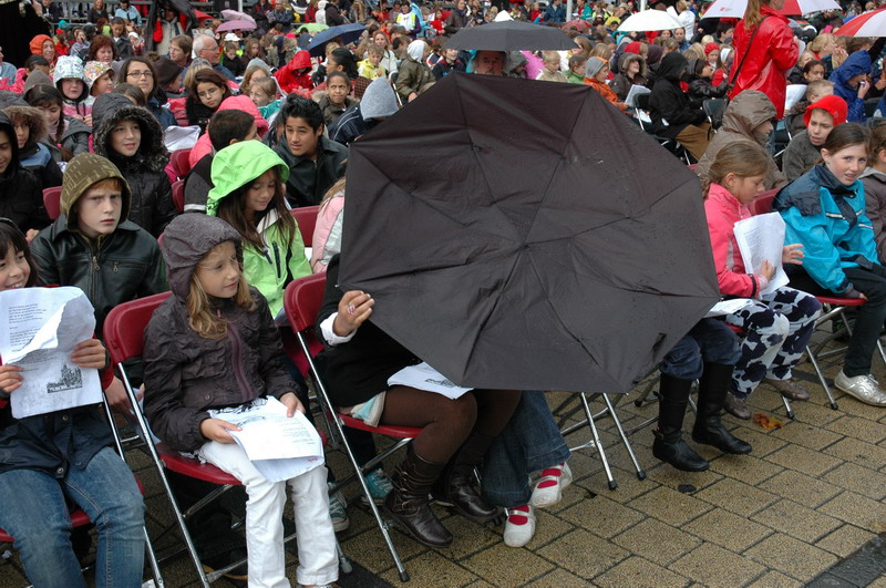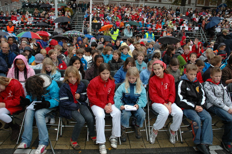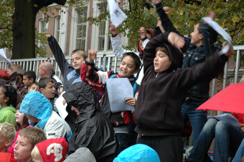 Hoewel de regen bij tijd en wijle met bakken uit de hemel kwam, had slechts een enkele basisschool vandaag besloten de leerlingen niet aan de elementen bloot te stellen tijdens het Minikoraal vanmorgen. Zij die wel kwamen zingen op de Garenmarkt, leek de regen niet te deren. Gewapend met poncho’s en paraplu’s vermaakten de duizenden scholieren zich prima met de liedjes over 3 oktober.