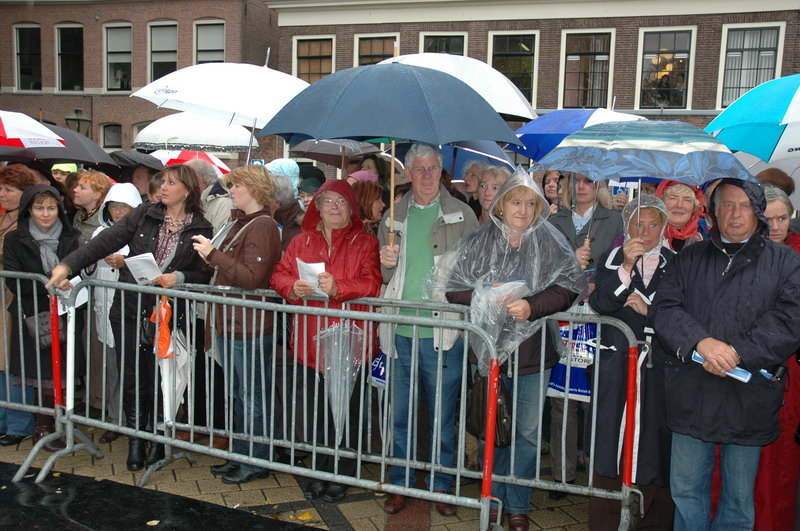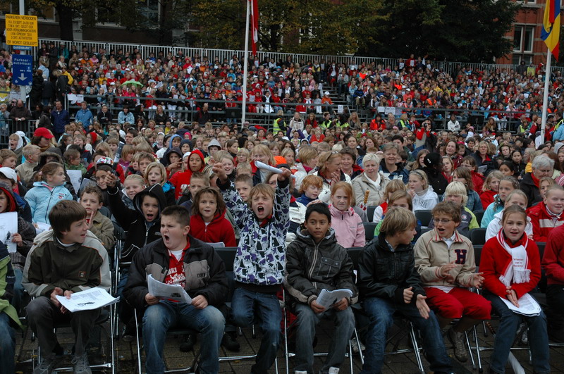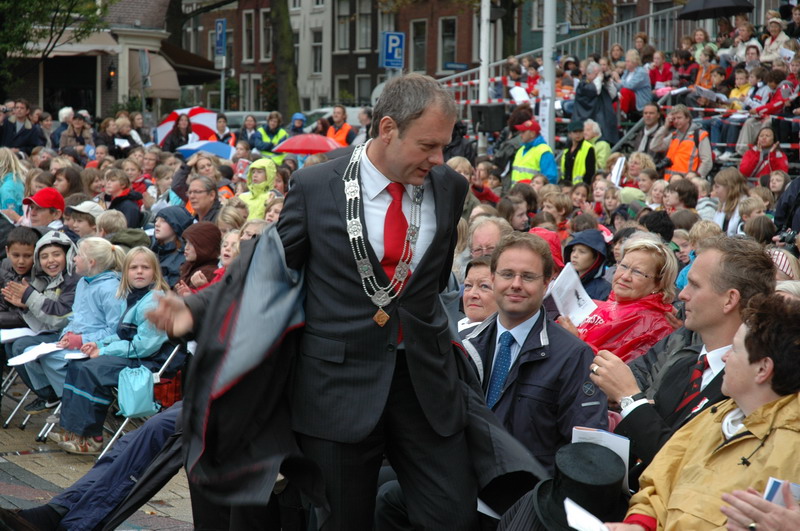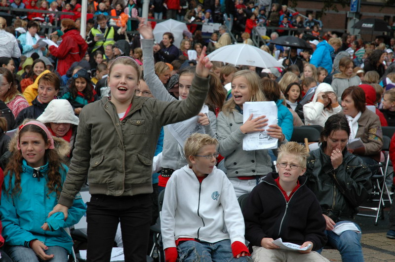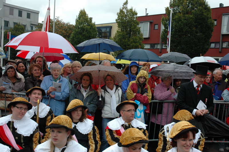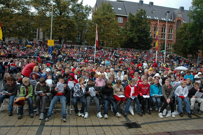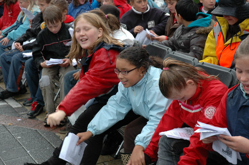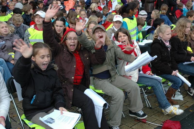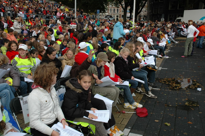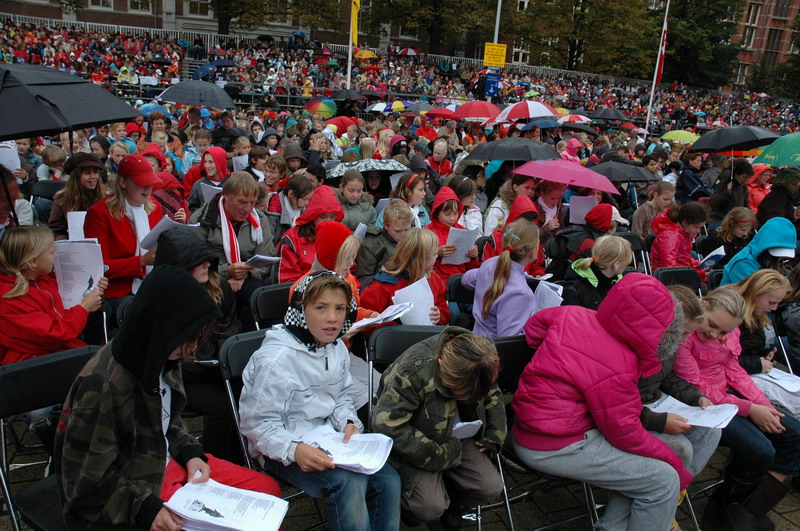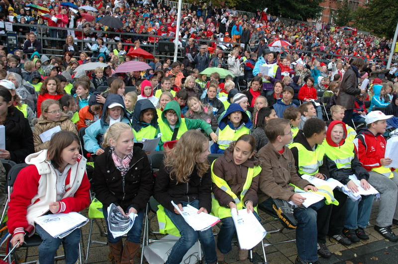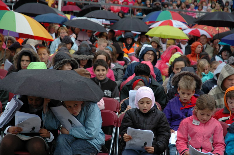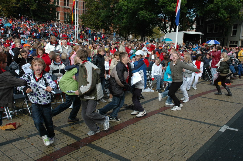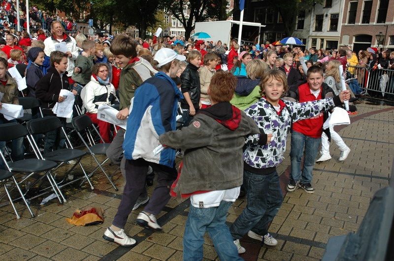 Hoewel de regen bij tijd en wijle met bakken uit de hemel kwam, had slechts een enkele basisschool vandaag besloten de leerlingen niet aan de elementen bloot te stellen tijdens het Minikoraal vanmorgen. Zij die wel kwamen zingen op de Garenmarkt, leek de regen niet te deren. Gewapend met poncho’s en paraplu’s vermaakten de duizenden scholieren zich prima met de liedjes over 3 oktober.