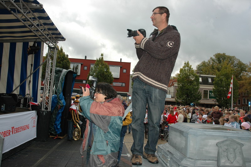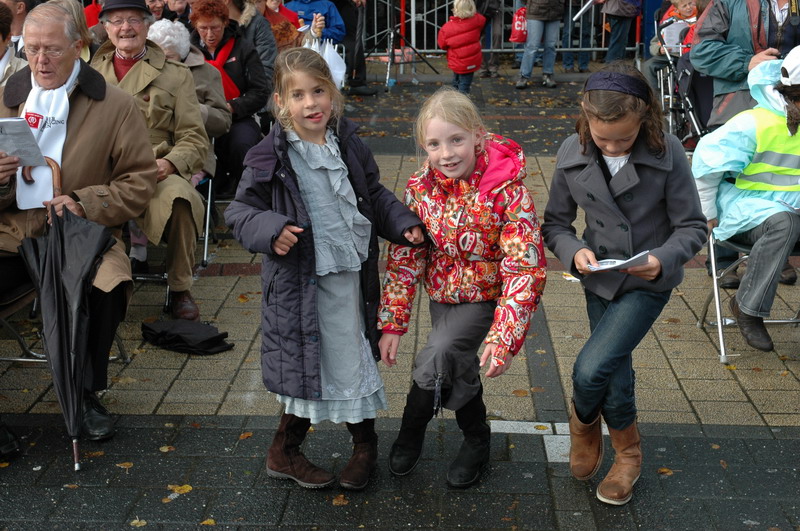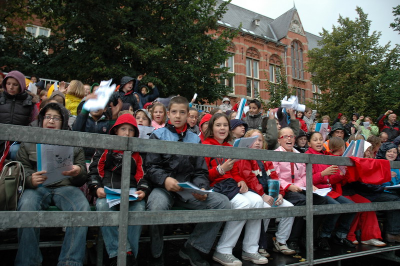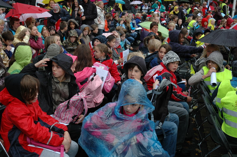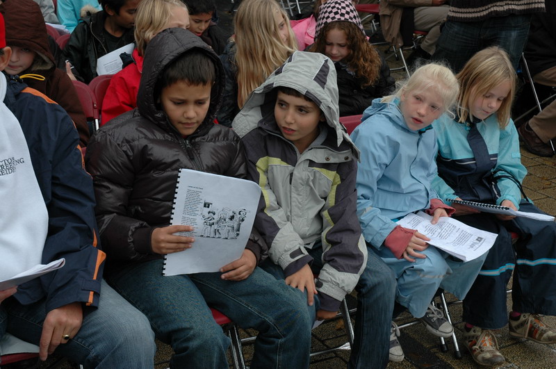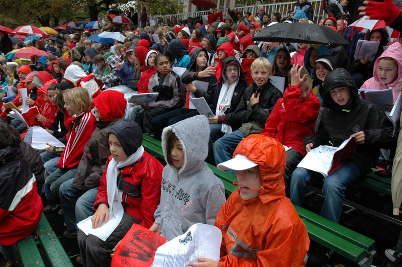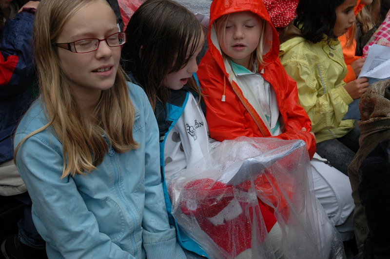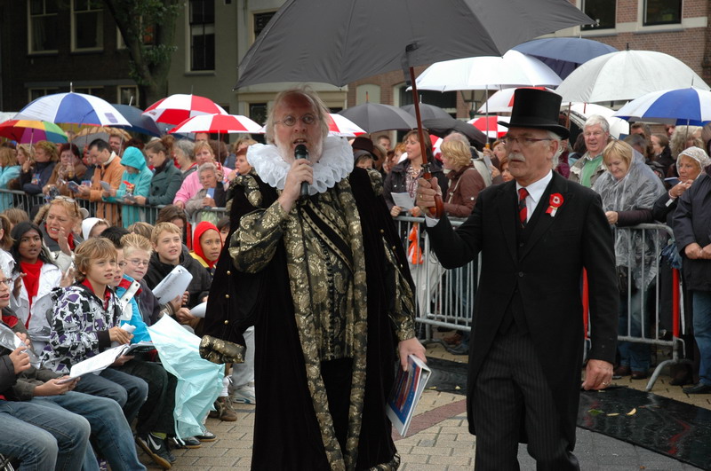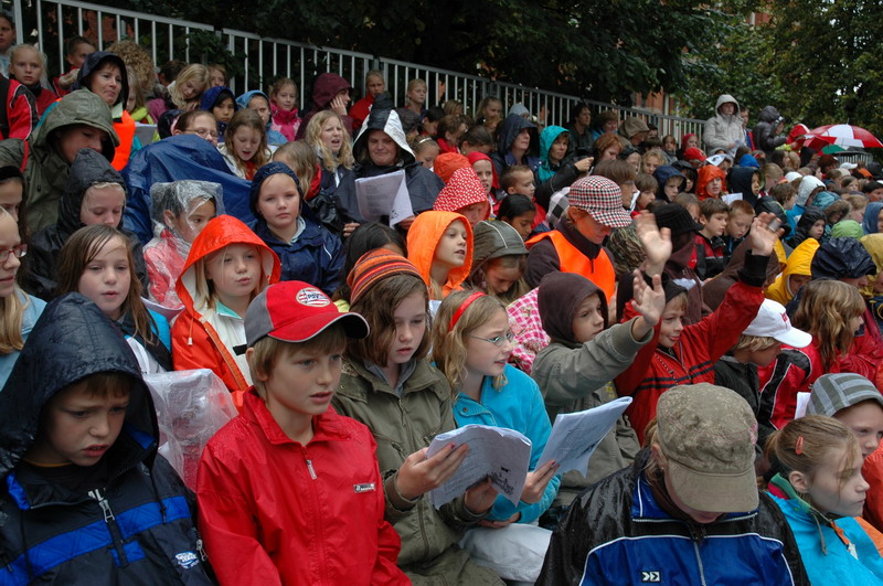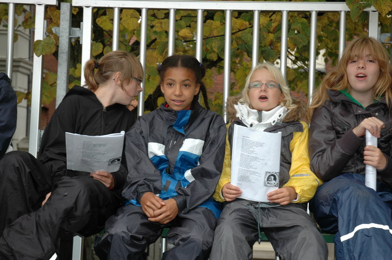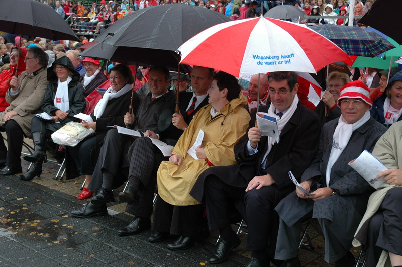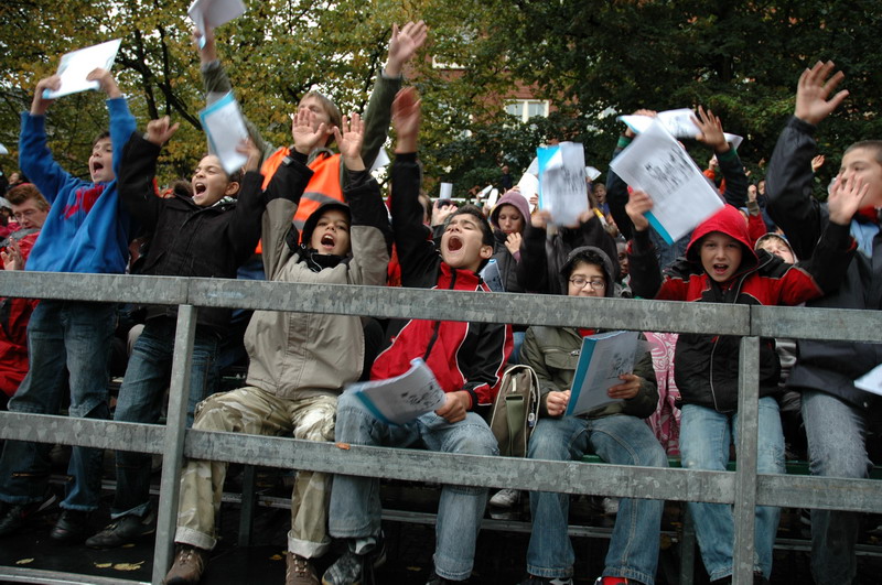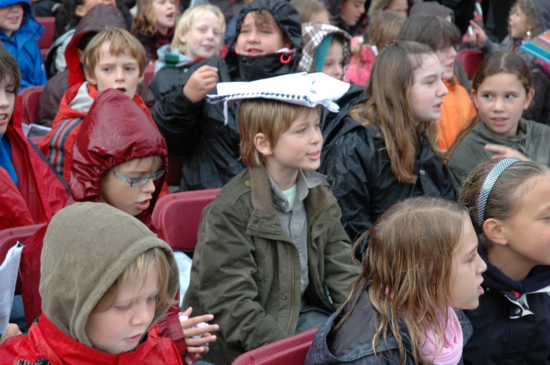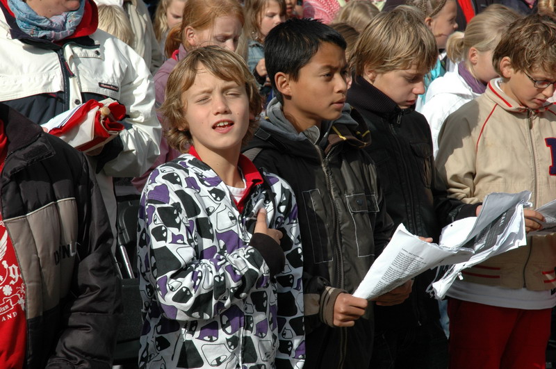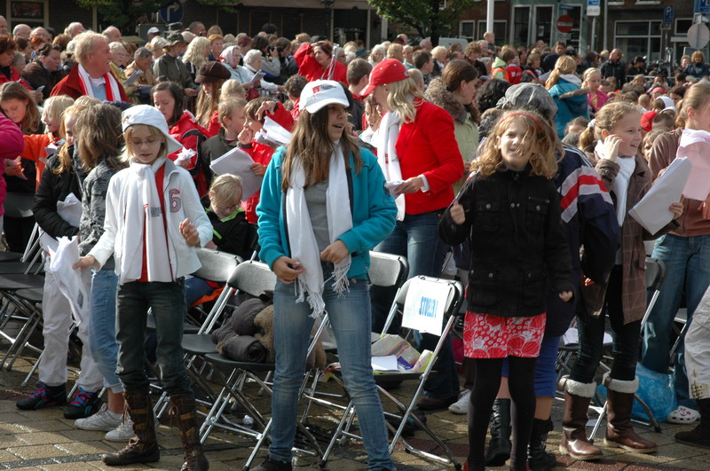 Hoewel de regen bij tijd en wijle met bakken uit de hemel kwam, had slechts een enkele basisschool vandaag besloten de leerlingen niet aan de elementen bloot te stellen tijdens het Minikoraal vanmorgen. Zij die wel kwamen zingen op de Garenmarkt, leek de regen niet te deren. Gewapend met poncho’s en paraplu’s vermaakten de duizenden scholieren zich prima met de liedjes over 3 oktober.