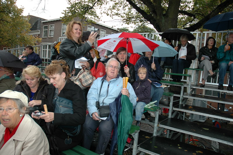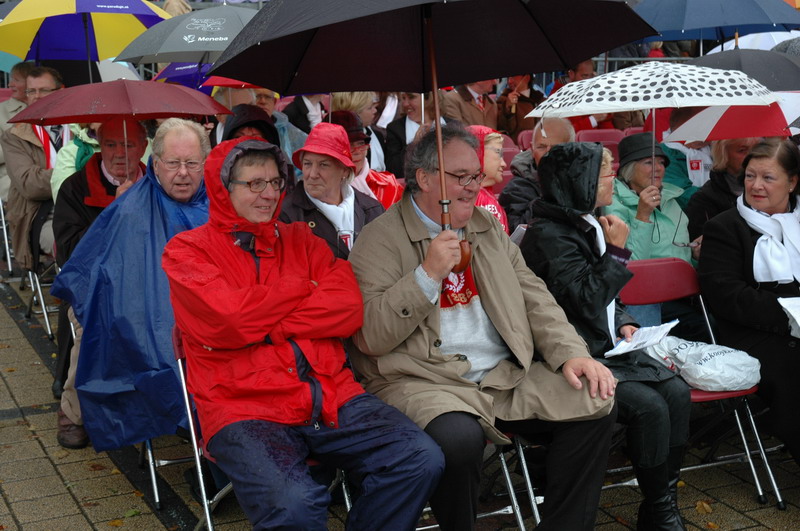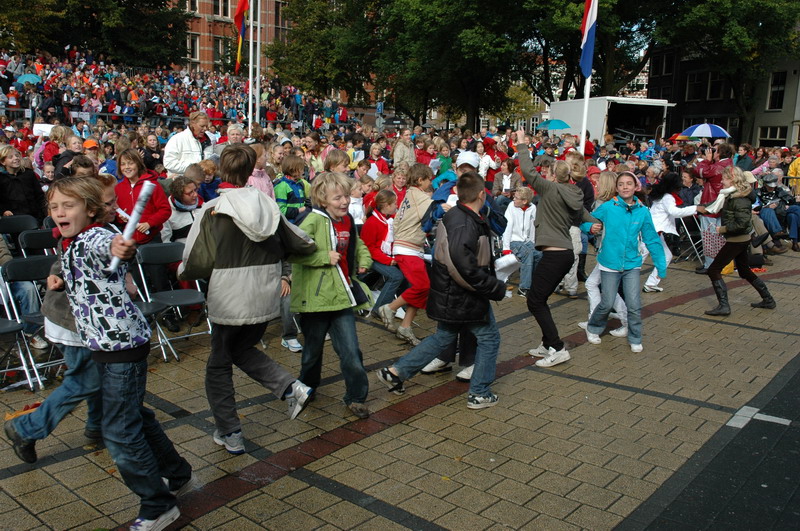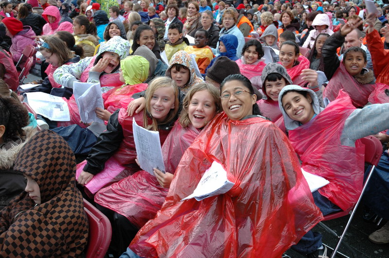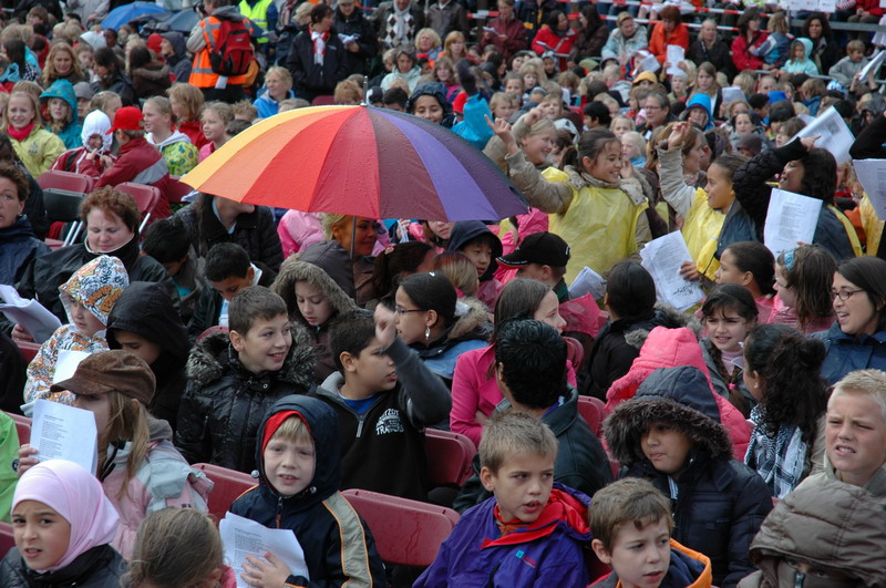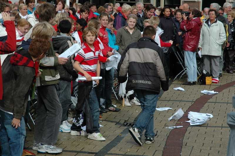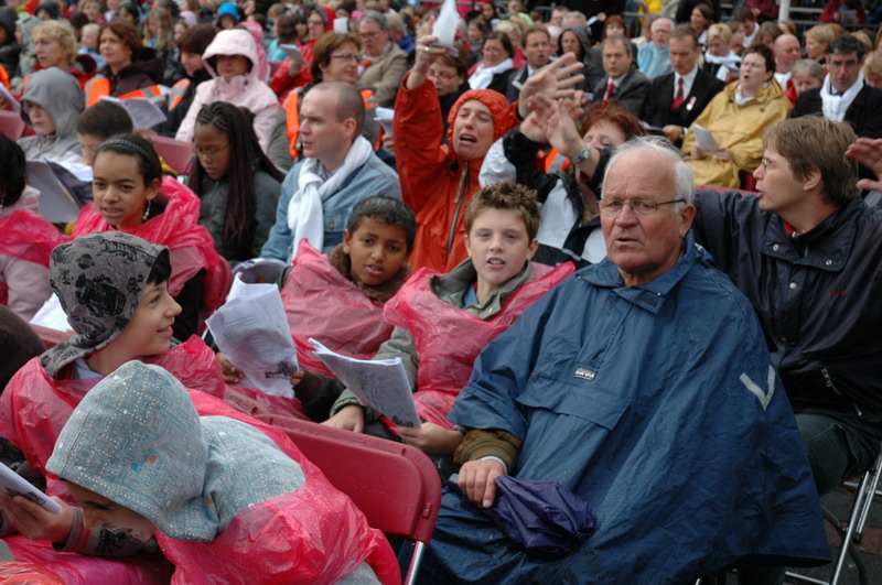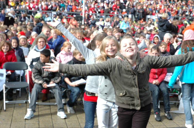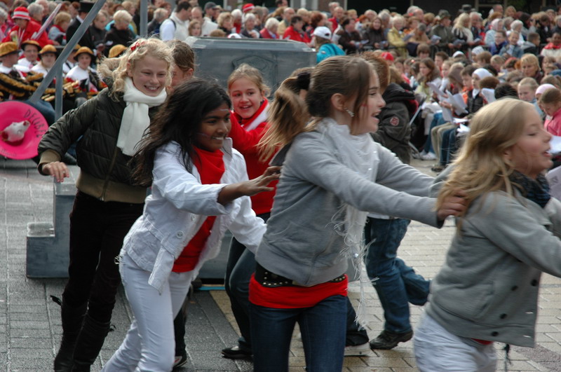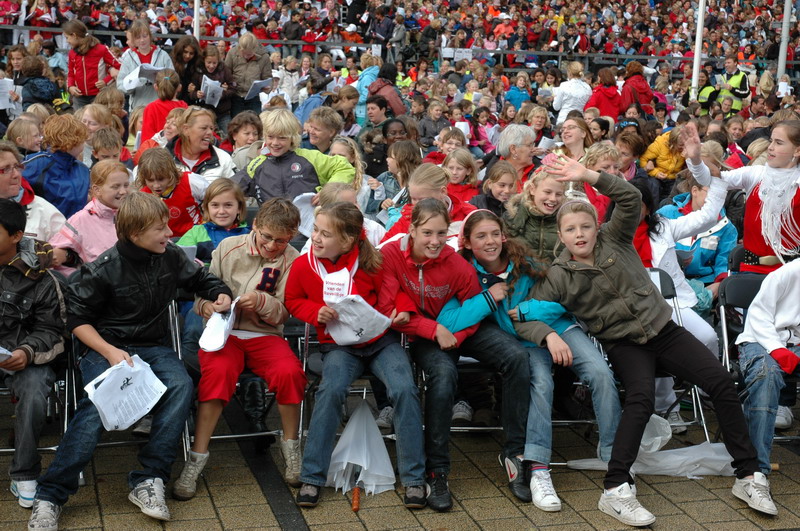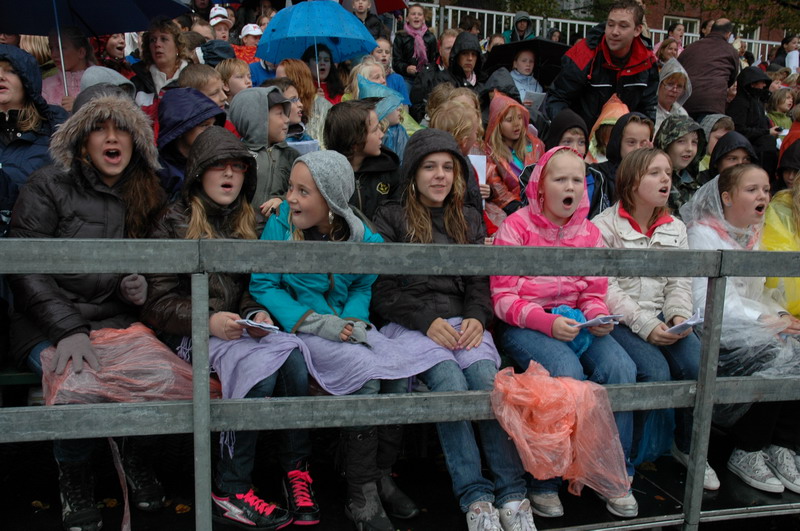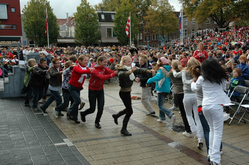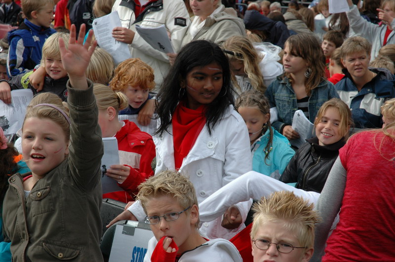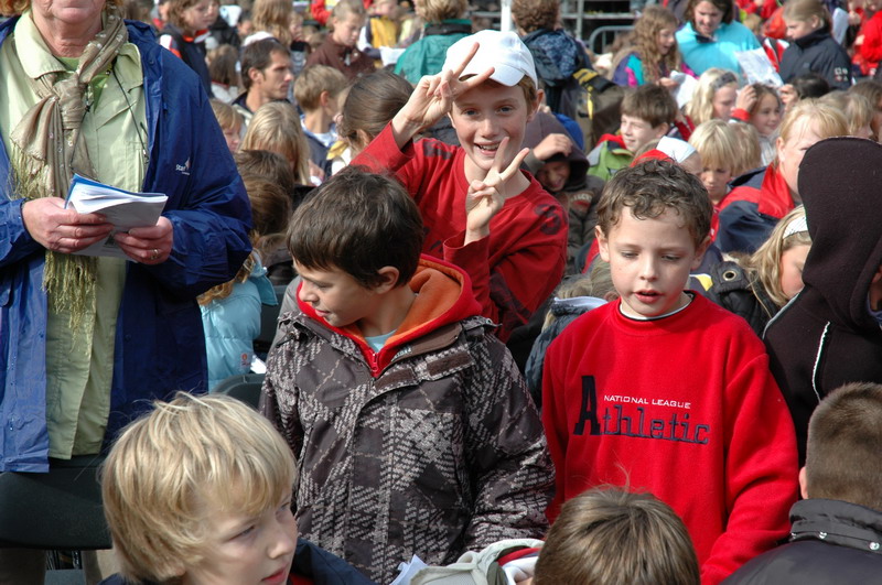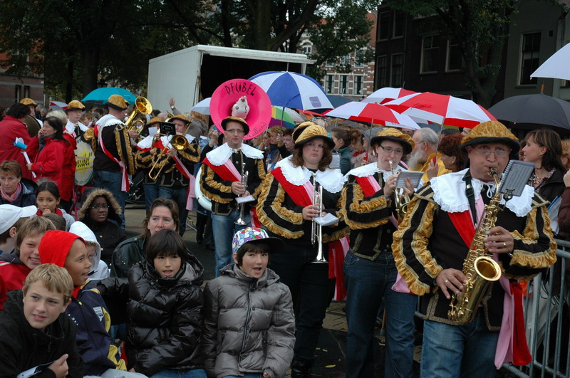 Hoewel de regen bij tijd en wijle met bakken uit de hemel kwam, had slechts een enkele basisschool vandaag besloten de leerlingen niet aan de elementen bloot te stellen tijdens het Minikoraal vanmorgen. Zij die wel kwamen zingen op de Garenmarkt, leek de regen niet te deren. Gewapend met poncho’s en paraplu’s vermaakten de duizenden scholieren zich prima met de liedjes over 3 oktober.