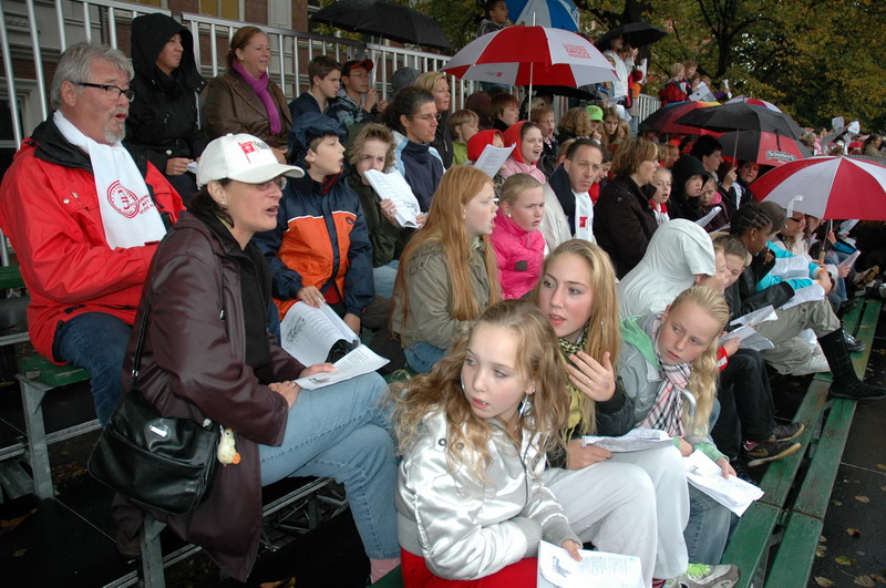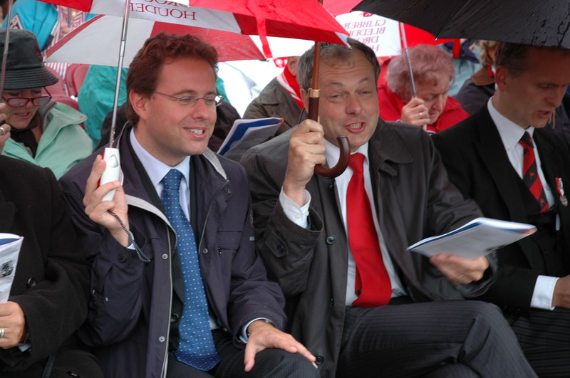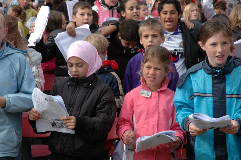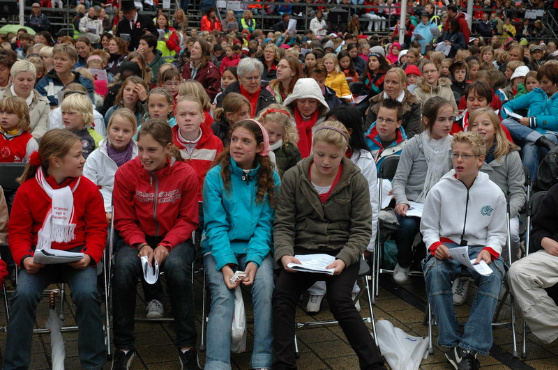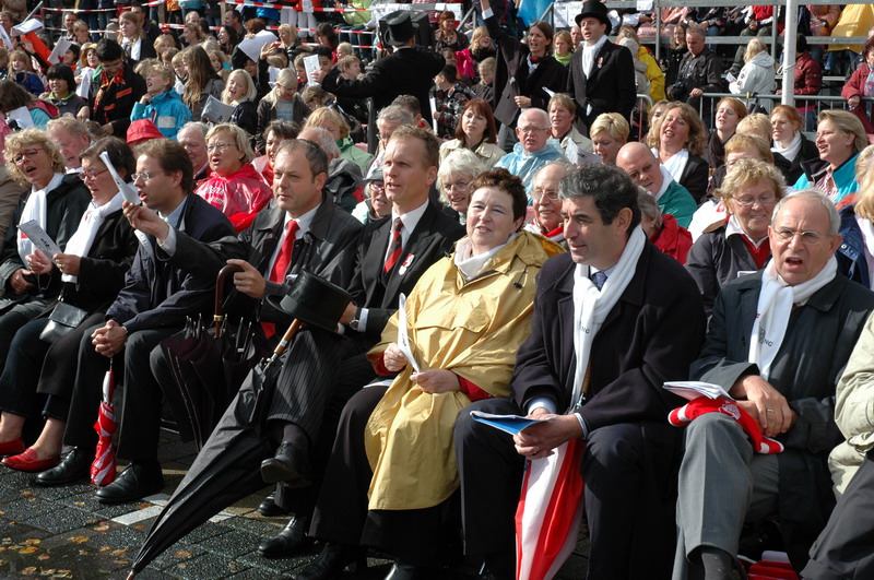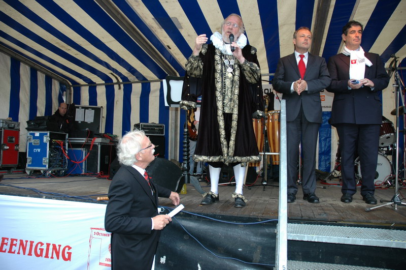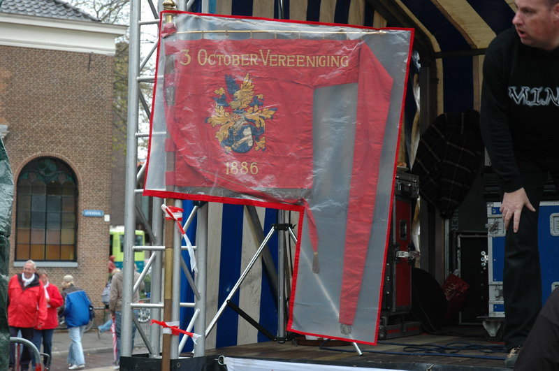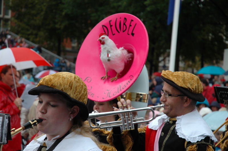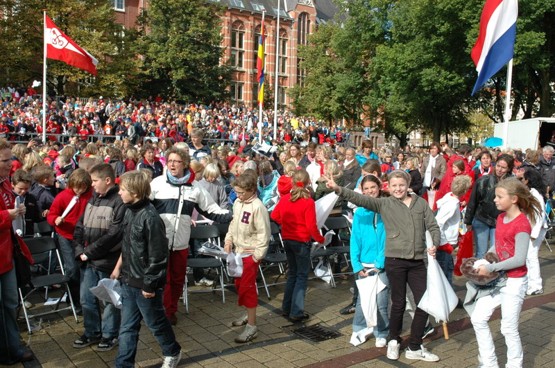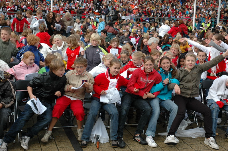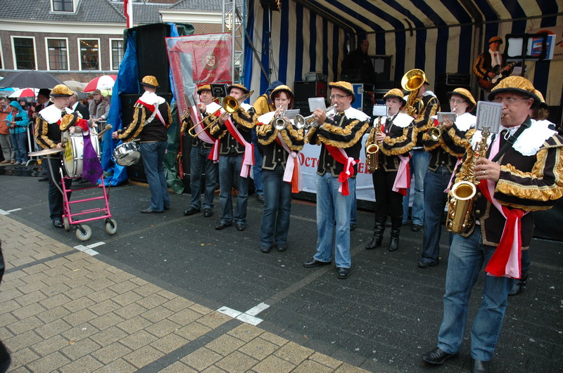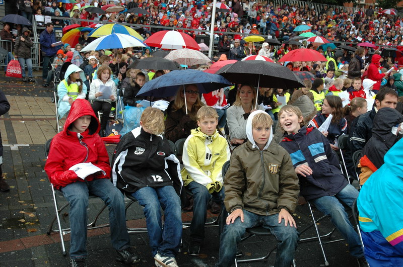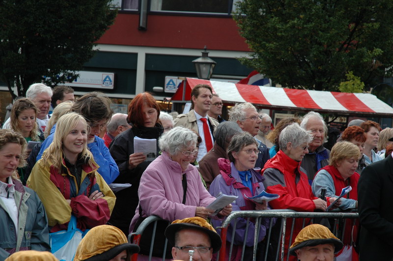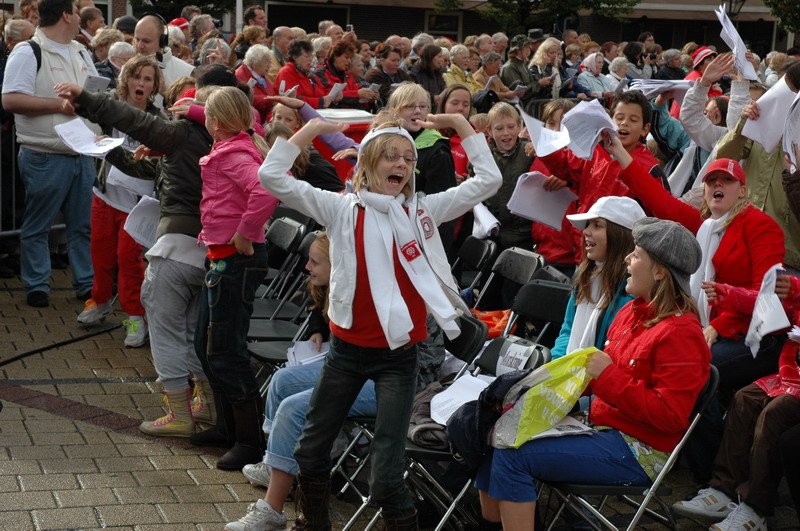Hoewel de regen bij tijd en wijle met bakken uit de hemel kwam, had slechts een enkele basisschool vandaag besloten de leerlingen niet aan de elementen bloot te stellen tijdens het Minikoraal vanmorgen. Zij die wel kwamen zingen op de Garenmarkt, leek de regen niet te deren. Gewapend met poncho’s en paraplu’s vermaakten de duizenden scholieren zich prima met de liedjes over 3 oktober.