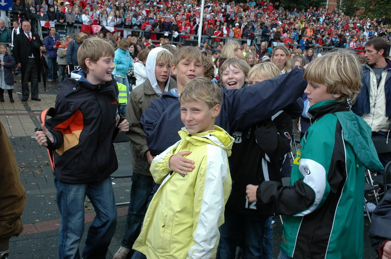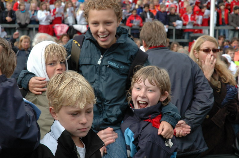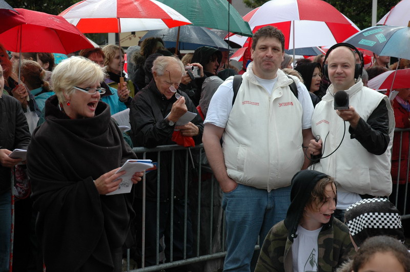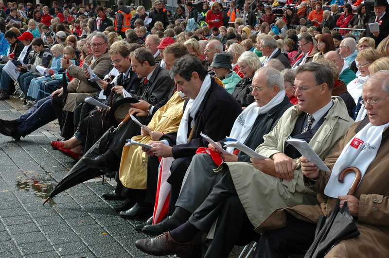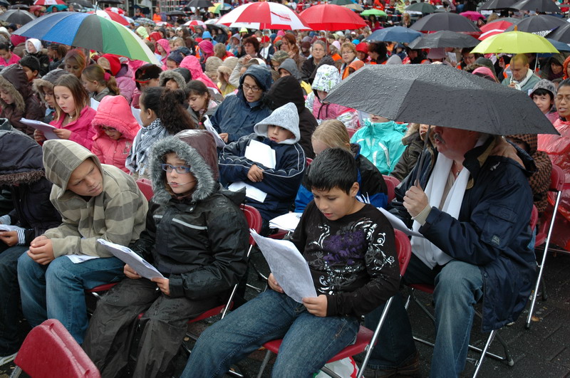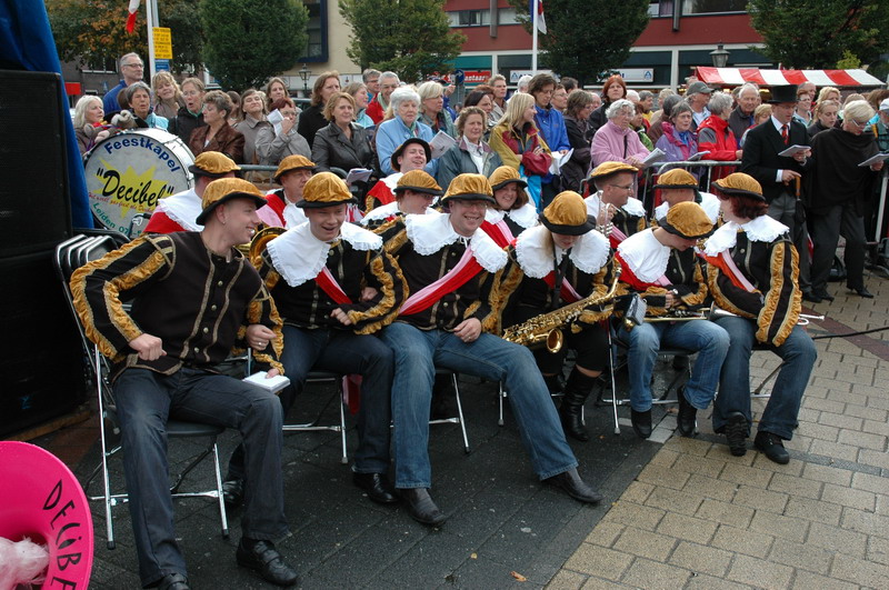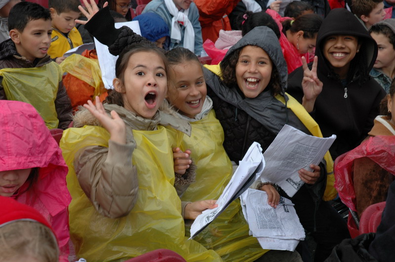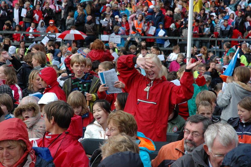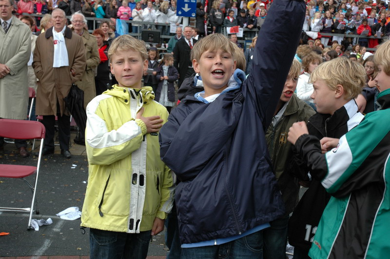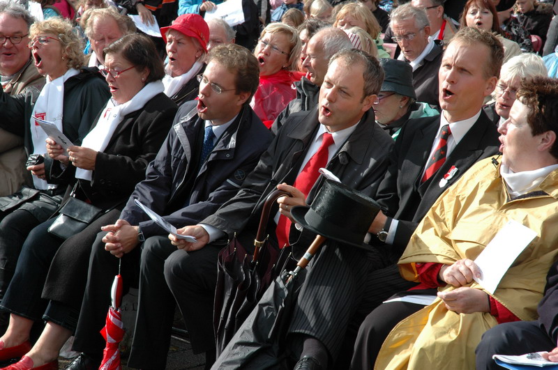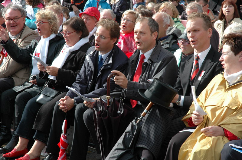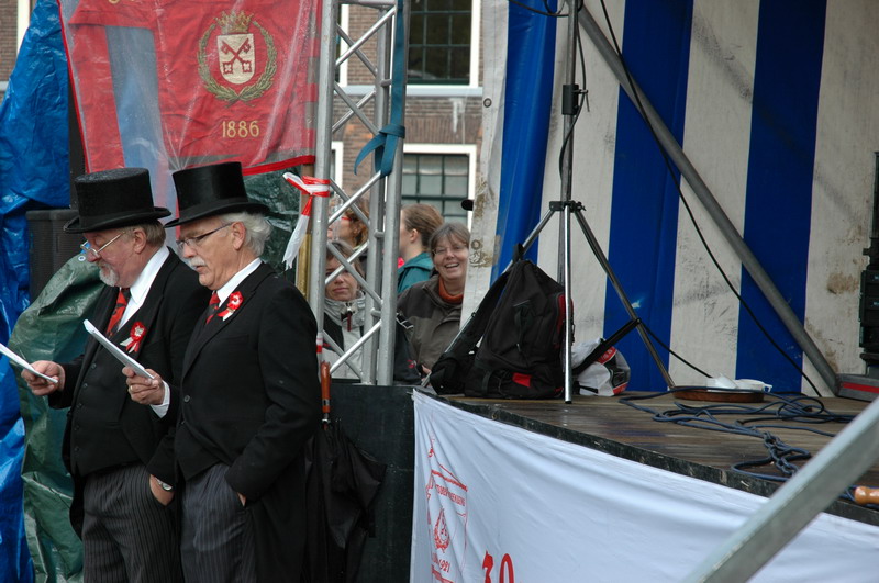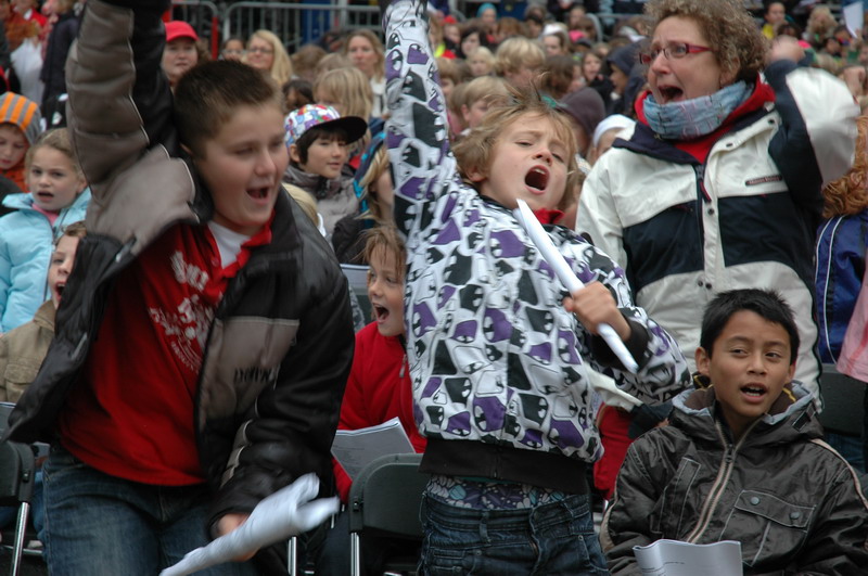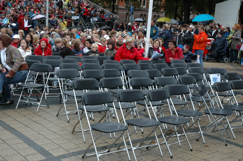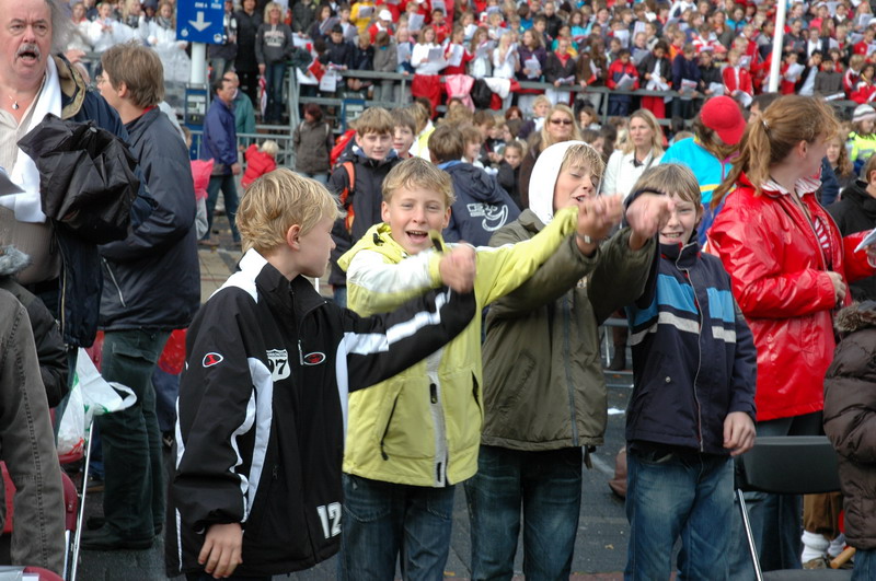 Hoewel de regen bij tijd en wijle met bakken uit de hemel kwam, had slechts een enkele basisschool vandaag besloten de leerlingen niet aan de elementen bloot te stellen tijdens het Minikoraal vanmorgen. Zij die wel kwamen zingen op de Garenmarkt, leek de regen niet te deren. Gewapend met poncho’s en paraplu’s vermaakten de duizenden scholieren zich prima met de liedjes over 3 oktober.