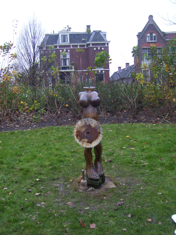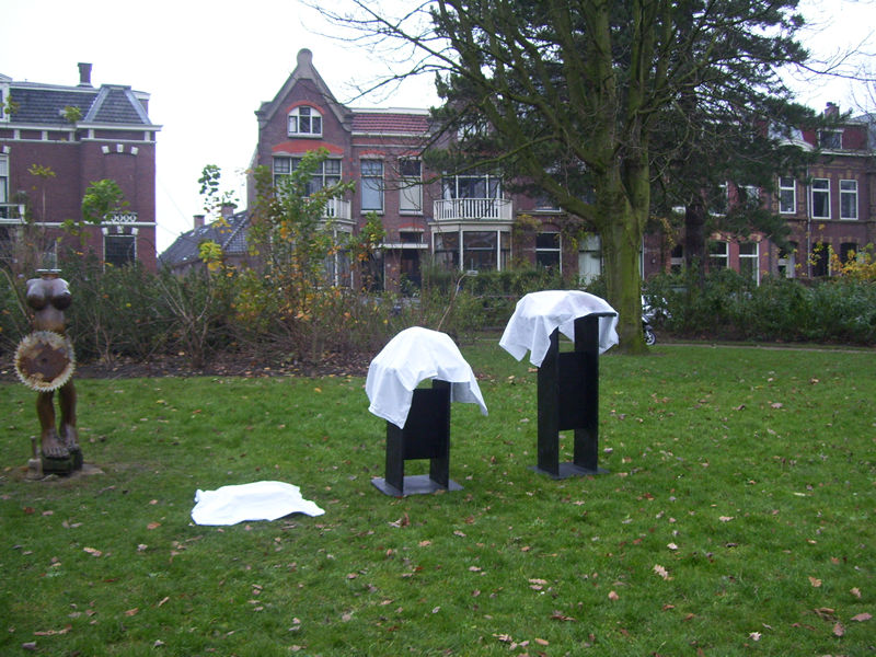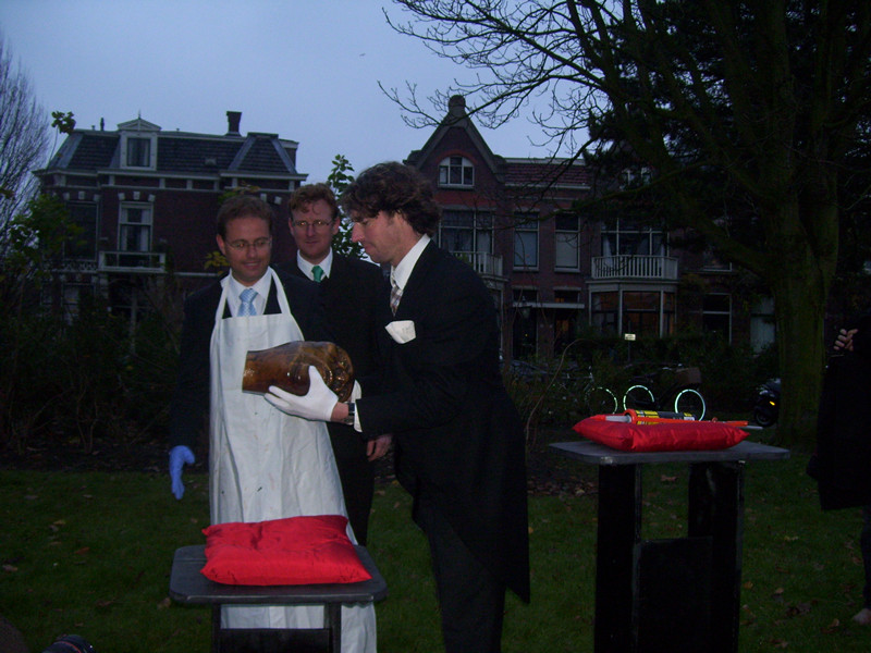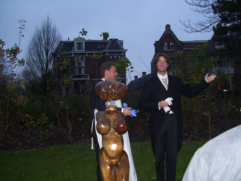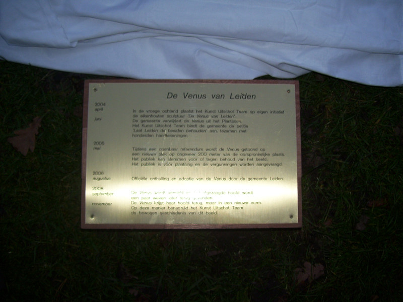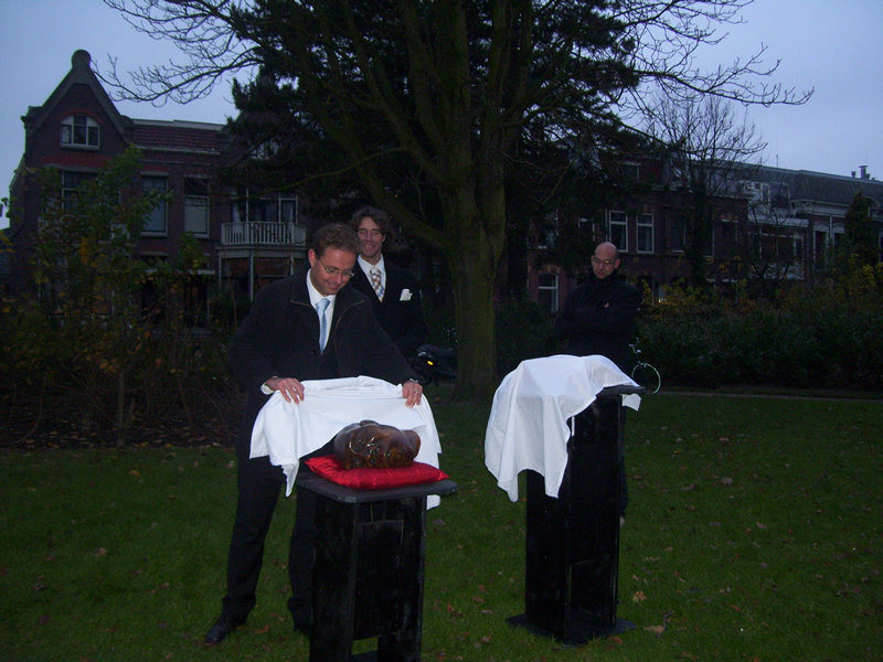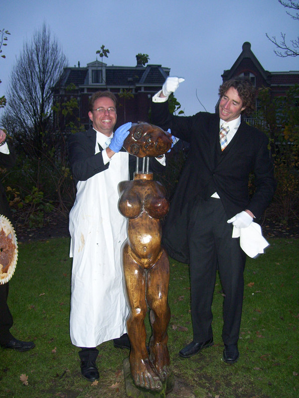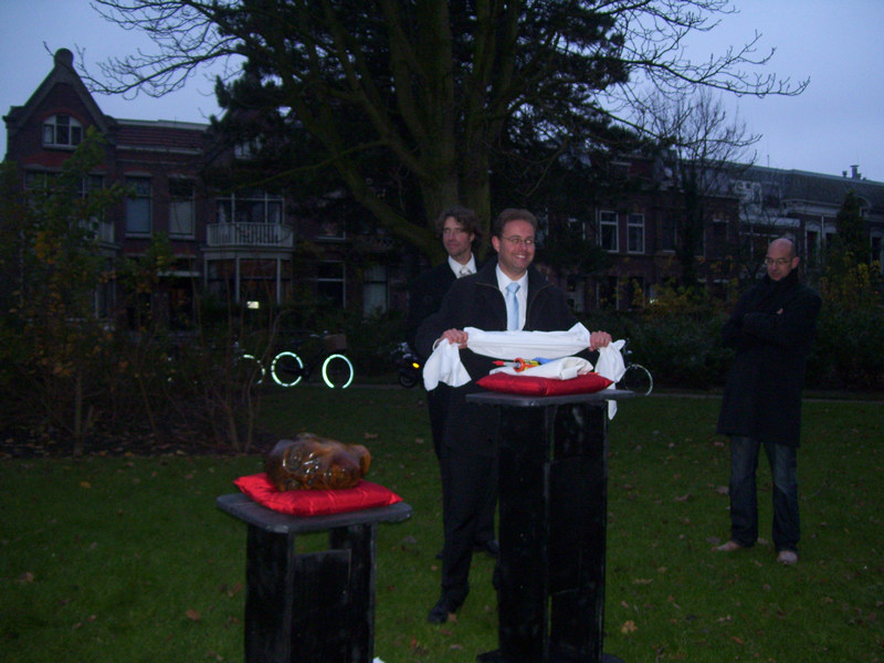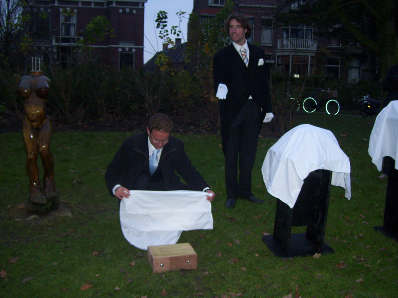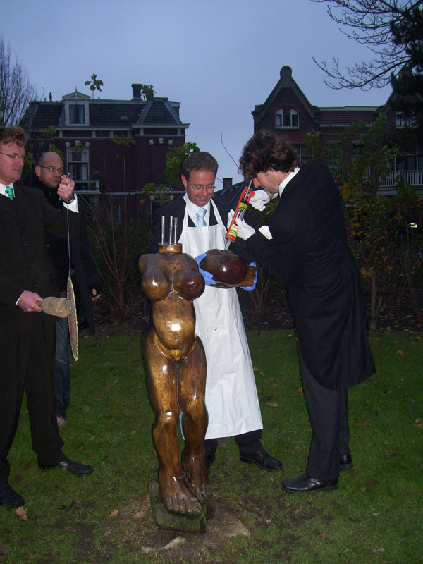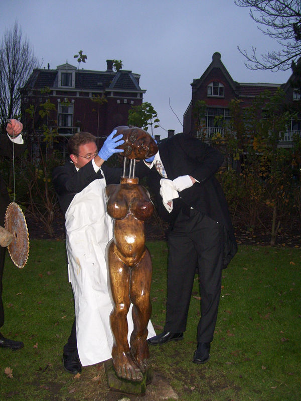 In een grijs en druilerig plantsoen vond vandaag wel een zeer feestelijke gelegenheid plaats: Het hoofd, van de eerder onthoofde Venus van Leiden, werd persoonlijk door wethouder Jan-Jaap de Haan teruggeplaatst op de wulpse torso. Een klein verschil in detail: het hoofd ligt nu dwars! De wethouder arriveerde een Leids kwartiertje later dan gepland. Hier had De Haan een goede reden voor, omdat kort voor deze plechtigheid de nieuwe cultuurmakelaar van onze Sleutelstad werd aangesteld binnen een totaal nieuwe aanpak van het Leidse cultuurklimaat. Er werden wat fikse bedragen van subsidiëring genoemd, waar het Kunst Uitschot Team (K.U.T.) niet onder zal vallen. De Haan gaf aan dat het K.U.T. vooral in het grijze gebied van de kunst opereert, dat, volgens zijn zeggen, een vruchtbare bodem biedt voor het uiten van kunst. De wethouder wil het K.U.T zeker niet echt formaliseren, maar geniet er toch vooral een beetje ‘stiekem’ van en waardeert de discussies, die het collectief oproept met zijn controversiële kunstuitingen. Na een fikse klap op de gong (een zaagblad van een cirkelzaag) onthulde De Haan een drietal objecten: