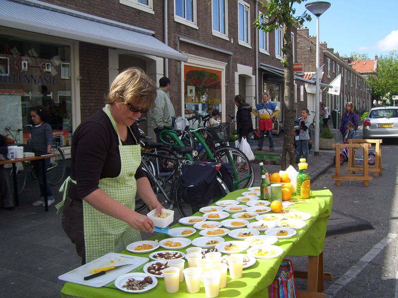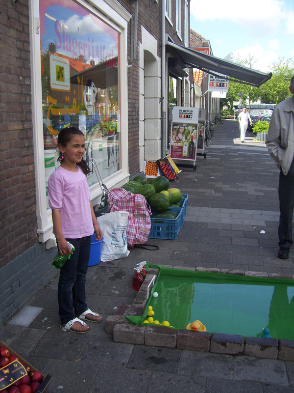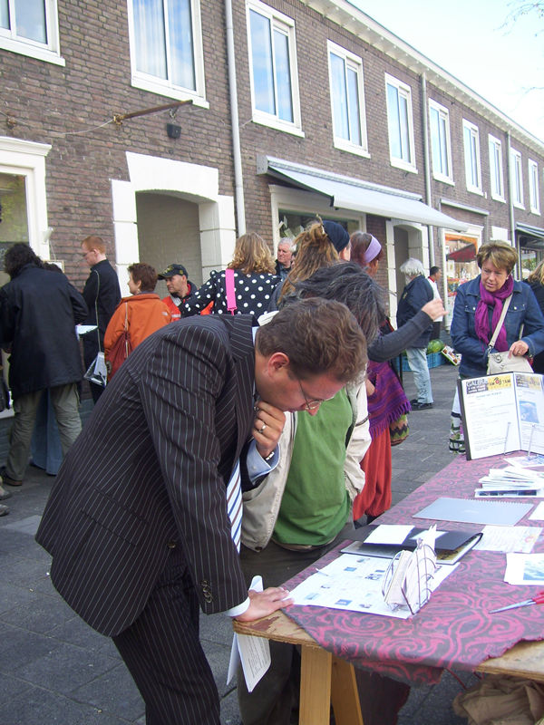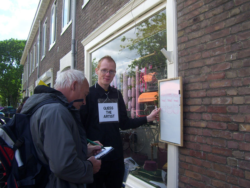 Vanmiddag rond 17.00 uur, opende wethouder Jan Jaap de Haan de unieke 'Buurt-Galerie' Tamtam in de Beatrixstraat in Leiden-Noord. Galerie Tamtam wordt dit jaar voor de tweede maal gehouden in het kader van het multiculturele Tamtam Festival, dat op 12 juni begint. Ruim 40 kunstenaars exposeren hun werk op ongewone plekken in een 'gewone' buurt, zoals in etalages van winkels, bij de ingang van de moskee en voor de ramen van buurthuizen en de videotheek. Na het voordragen van een tweetal gedichten door kunstenaar Piet Franzen, was het woord aan De Haan, die de straatgalerie een zeer goed idee noemde om kunstenaars en bewoners dichter bij elkaar te brengen. De Haan vond het zelfs zo'n bijzonder initiatief, dat hij het plan mee wil nemen naar de gemeente met als doel kunst te exposeren en te etaleren in leegstaande panden en kantoren in de Leidse binnenstad, die nu vaak dichtgetimmerd of afgeplakt het straatbeeld versomberen. Galerie Tamtam loopt tot en met 28 juni. Meer info, deelnemers en route: www.sonjavank.com/tamtam.