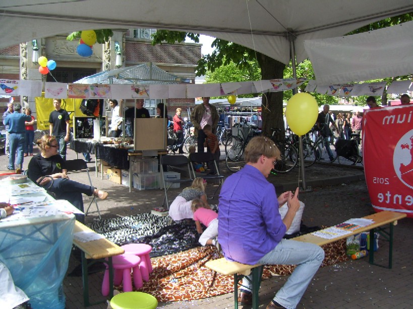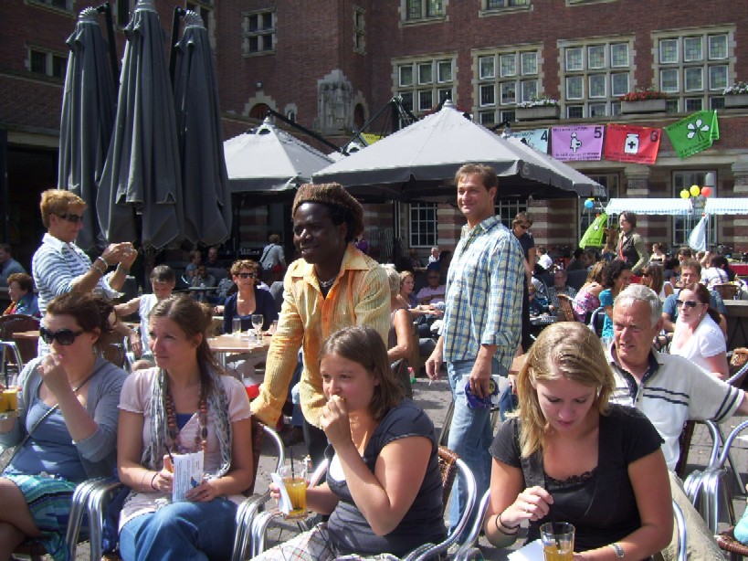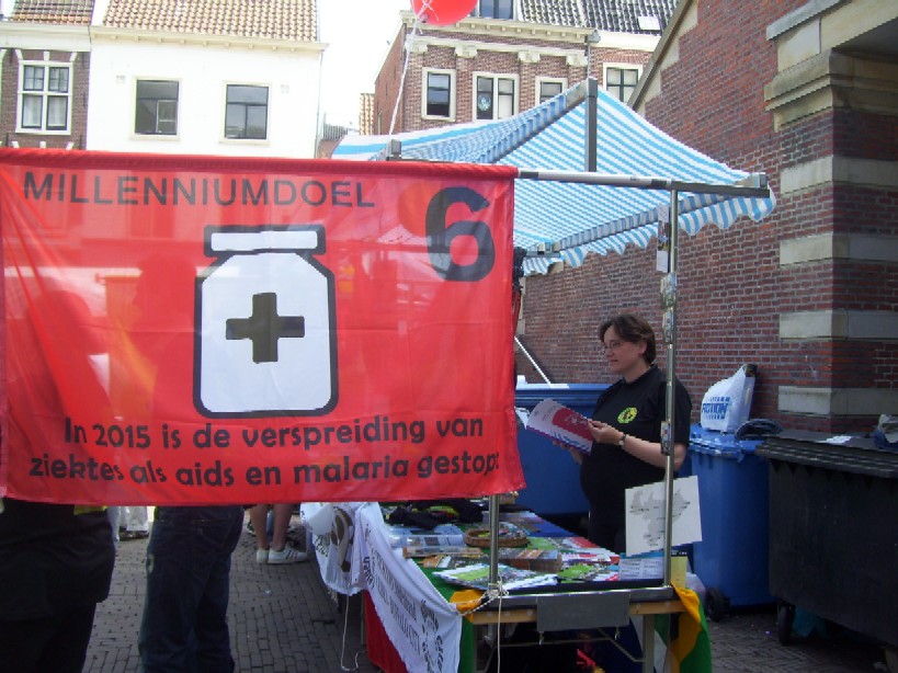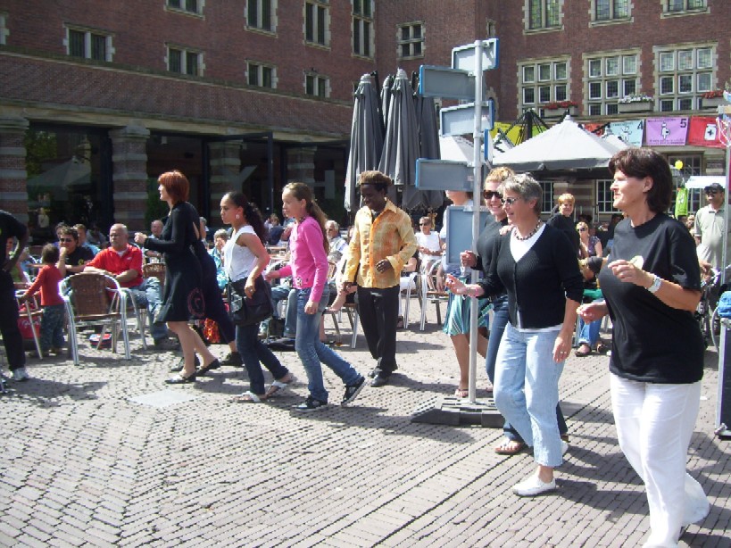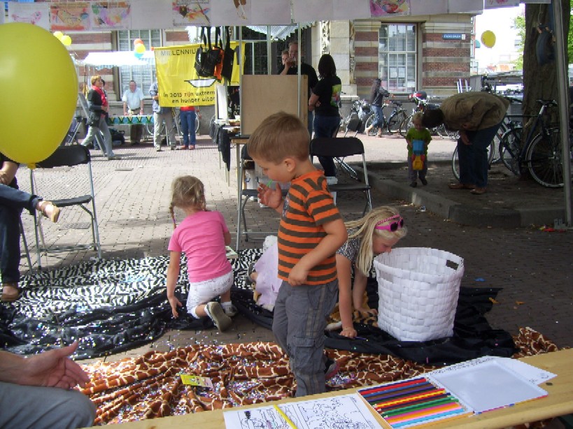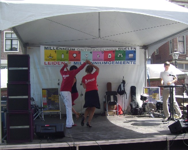 Het was een gezellige drukte op het Stadhuisplein, waar vandaag de Leidse Millenniumdoelendag gehouden werd. Het evenement is georganiseerd door Keys for Kids, samen met de stedenband Leiden-Buffalo City en de SVLJ. Vanaf 10.00 uur vanmorgen was er van alles te beleven tijdens dit multiculturele feest voor jong en oud. De kleintjes vermaakten zich met knutselen, poppentheatervoorstellingen, of deden mee met verschillende wedstrijden. De ouderen genoten in het zonnetje van uitheemse hapjes, drankjes, lezingen en workshops, of slenterden langs de vele informatiestands. Na even aarzelen gingen jong en oud aan het Salsadansen, onder de enthousiaste leiding van Rafael (van de Leids Cubaanse dansschool Salsiando) en zijn assistenten. Met swingende muziek werd deze geslaagde dag afgesloten.