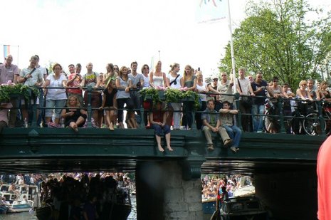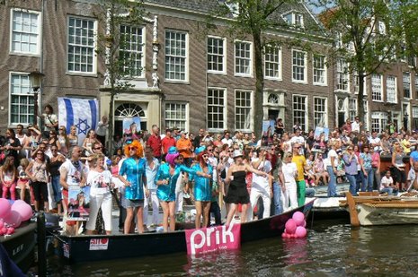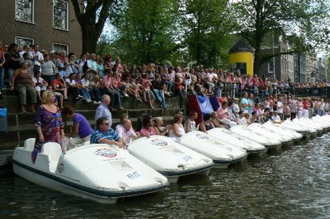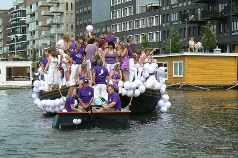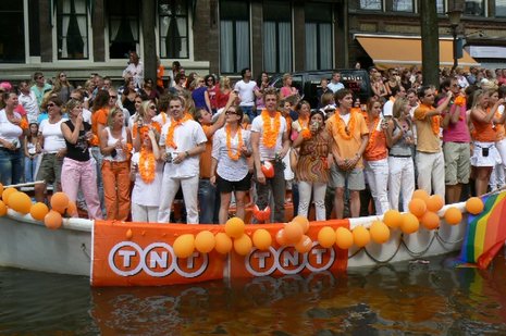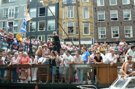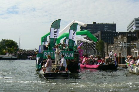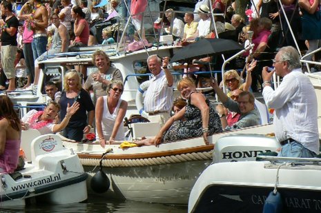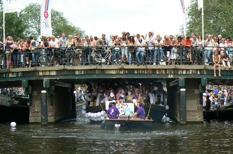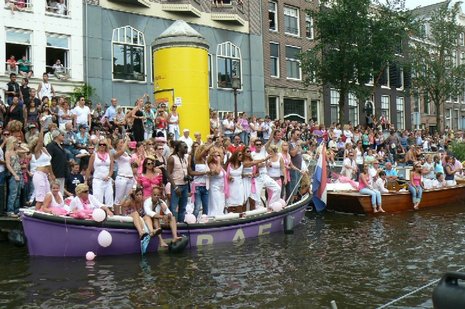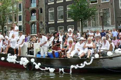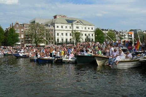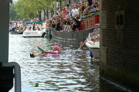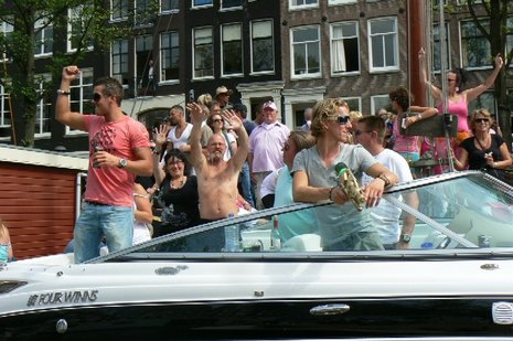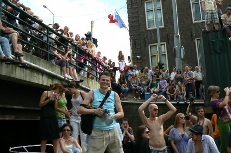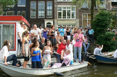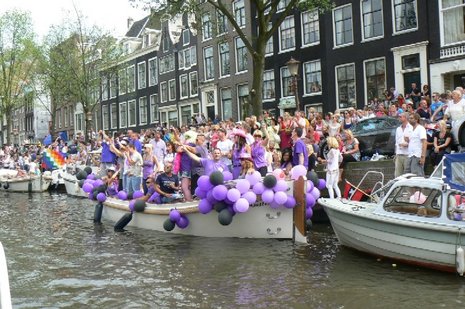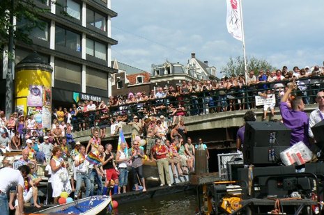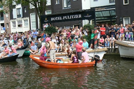 Ruim 560.000 mensen hebben afgelopen zaterdag de ‘Canal Parade’ bekeken, het hoogtepunt van de jaarlijks Gay Pride in Amsterdam. Volgens organisator Frank van Dalen was de oorzaak van de extra grote belangstelling dit jaar vooral te danken aan de vele media-aandacht en meer betrokkenheid uit de samenleving. Natuurlijk speelde ook het mooie weer een belangrijke rol. Er deden ruim 80 boten mee met de parade en speciaal hiervoor waren een flink aantal duwboten uit Leiden naar Amsterdam vertrokken. Sleutelstadfotograaf Marjo Heemskerk voer mee met een van de zeven duwboten van Van Lachniet uit Leiden en maakte op haar tochtje een fotoserie.