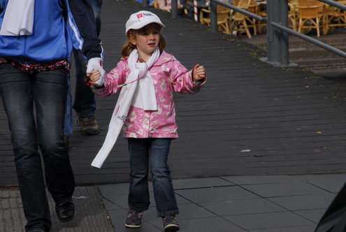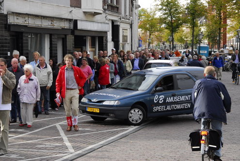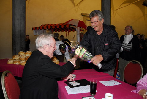 Dat 3 oktober een feest van tradities is, bleek ook gisteren weer. Bloemen voor deze vrijwillier van de 3 October Vereeniging die dit jaar voor de 40e keer achter één van de inschrijftafels plaatsnam. (Foto's: Gerard Ligtvoet).