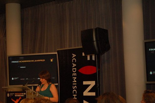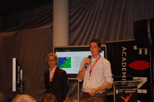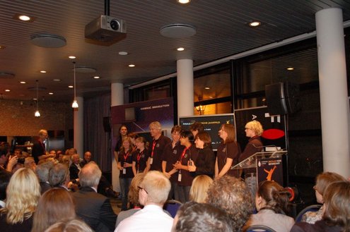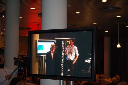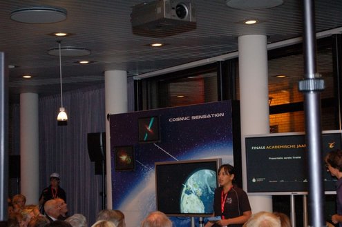 Gisteravond reikte Minister Ronald Plasterk in Museum Boerhaave, de Academische jaarprijs 2009 uit aan captain Sijbrand de Jong, van het ‘Team De Jong’ van de Radboud Universiteit Nijmegen. De prijs van € 100.000 is bestemd voor het team, dat wetenschappelijk onderzoek het beste onder de aandacht weet te brengen van een groot publiek. Aan deze vierde editie van de Academische Jaarprijs namen acht finaleteams deel. Teamcaptain De Jong: “Je hoopt natuurlijk altijd dat je wint, maar de competitie was erg sterk. Gelukkig zijn wij beloond voor alle moeite die wij in dit project hebben gestoken. Met Cosmic Sensation willen wij enerzijds onze fascinatie over het heelal en het ontstaan daarvan, overbrengen. Daarnaast willen we de bezoekers aantonen dat er kosmische deeltjes zijn. Muziek en licht tijdens het feest worden door middel van kosmische straling aangestuurd. Terwijl de mensen door koptelefoons luisteren naar de muziek, zijn de deeltjes op enorme schermen waar te nemen.”