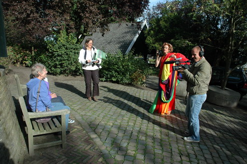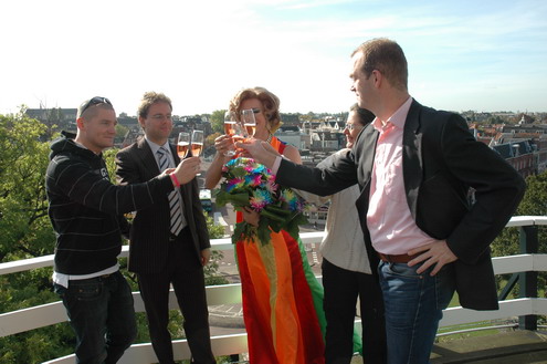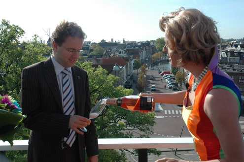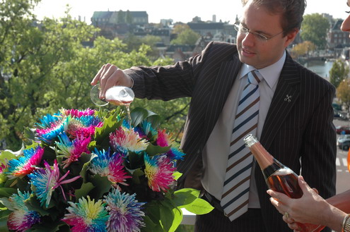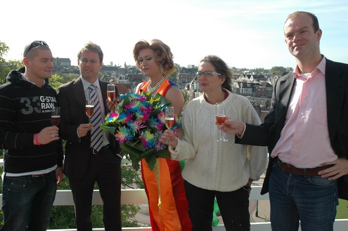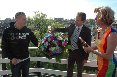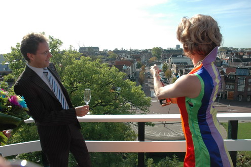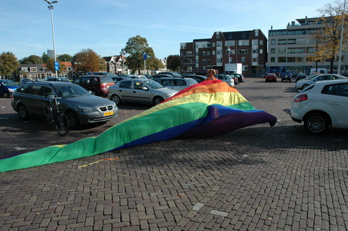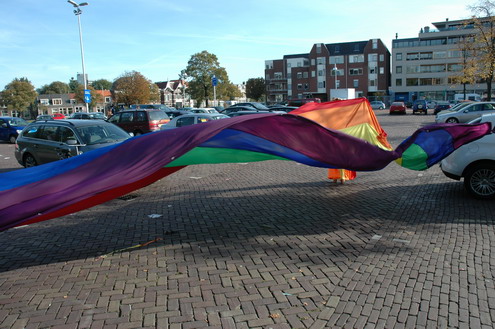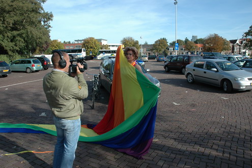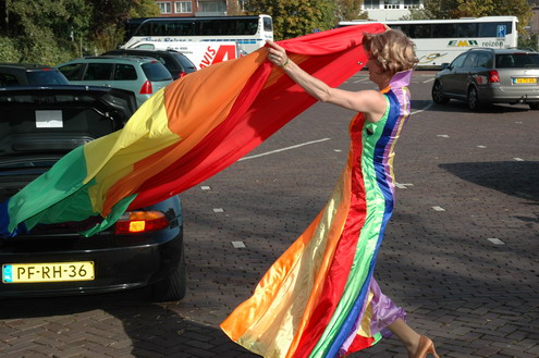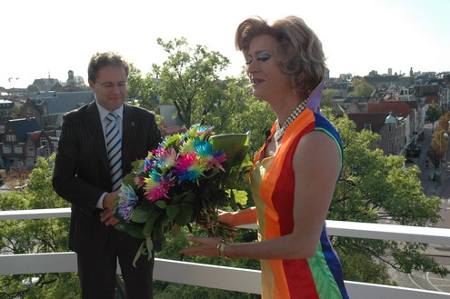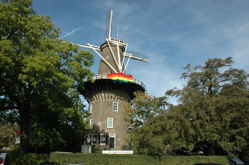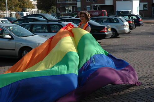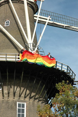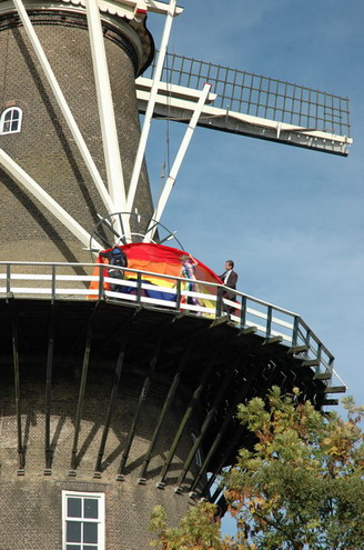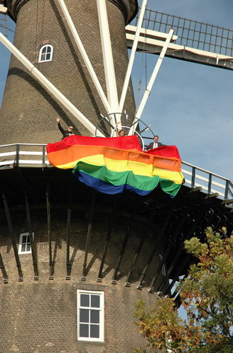 In verband met de landelijke 'Coming Outdag', die morgen voor de tweede maal in Leiden wordt gehouden, is Molen de Valk versierd met een kleurige regenboogvlag. De vlag van 18 meter werd door de 'Delftsche Studenten Alpinisten Club' (DSAC) opgehangen. Gisterochtend doopte wethouder Jan-Jaap de Haan op de omgang van de molen ook al een speciale coming-outbloem. deze crysant in alle kleuren van de regenboog is vanaf nu ook verkrijgbaar. Foto: www.dandrea.nl Reportage: Chris de Waard.