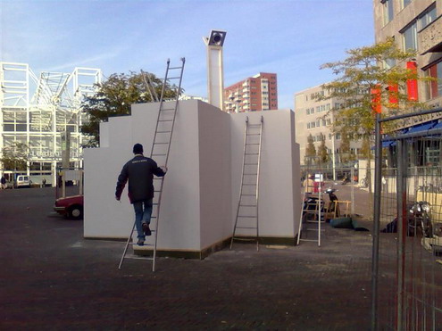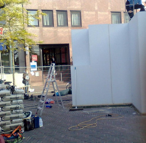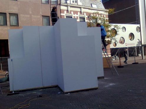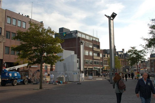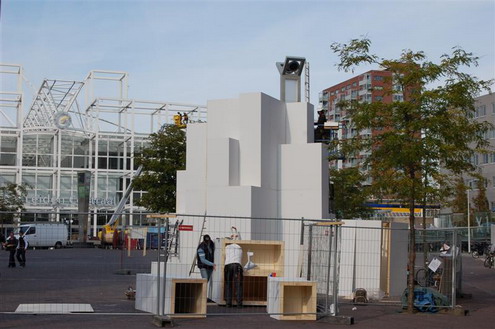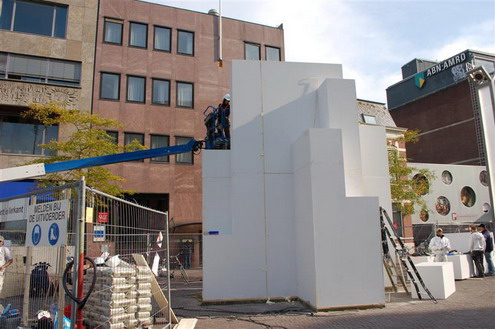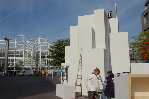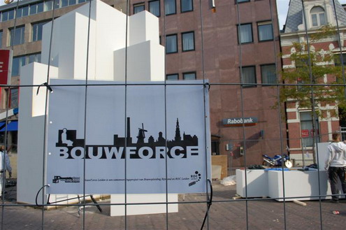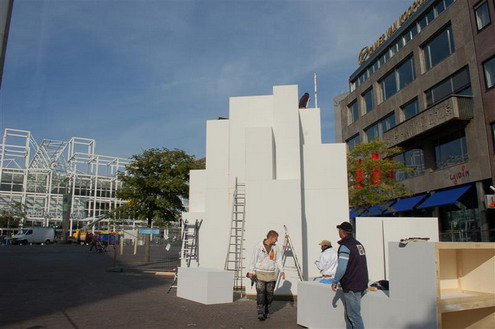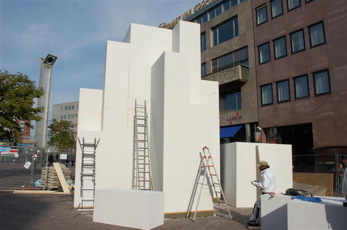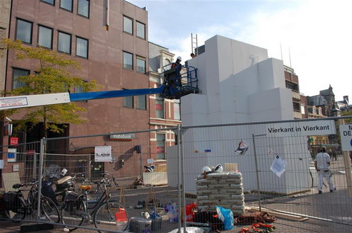 Vorige week zijn leerlingen van het ROC en de Bouwopleiding Rijnland begonnen met de bouw van een 12 meter hoog ‘plastiek’ van de fonfein Vierkant in Vierkant van Theo van Doesburg die het oorspronkelijk ontwierp voor het Stationsplein in Leeuwarden. De Leidse Stichting Vierkant in Vierkant maakt zich al jaren sterk voor plaatsing van de fonfein bij het Centraal Station. Ook de erven van Theo van Doesburg vinden dit de mooiste plaats voor de fontein. Het tijdelijke monument blijft staan tot het einde van de grote Theo van Doesburg tentoonstelling die tot 3 januari 2010 is te zijn in de Lakenhal. Volgende week is de officiële onthulling.