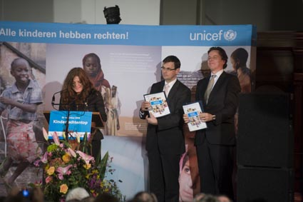 Afgelopen vrijdagmiddag woonde Koningin Beatrix een deel van de Kinderrechtentop van UNICEF bij in de Hooglandse Kerk. De Koningin is beschermvrouwe van UNICEF, waarvan ‘Het Verdrag voor de Rechten van het Kind’ nu haar 20-jarig bestaan viert. De ministers Rouvoet voor Jeugd en Gezin en Koenders voor Ontwikkelingssamenwerking ontvingen het UNICEF-rapport State of the World’s Children, dat een jaarlijks overzicht geeft van de kinderrechten in alle landen van de wereld.