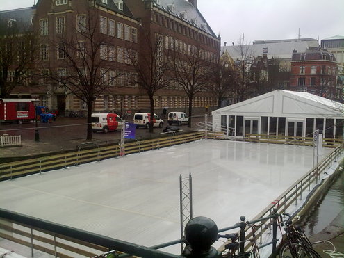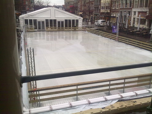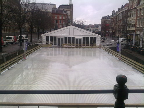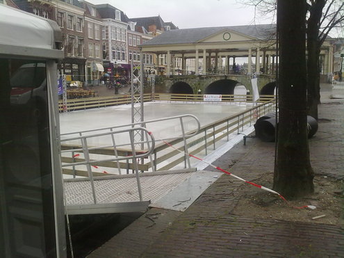 Vandaag is er begonnen met het opbouwen van de Zorg en Zekerheid IJsbaan die op het water van de Nieuwe Rijn komt te liggen. Vanaf aanstaande vrijdag tot en met zondag 3 januari ligt de kunstijsbaan in het centrum van Leiden. Centrummanager Joost Bleijie is dolenthousiast over de openluchtbaan op de gracht: “Iedere stad heeft een ijsbaan, maar geen enkele stad heeft een ijsbaan op een gracht. Ik ben daar wel trots op”. Naast de ijsbaan verrijst er ook een Koek en Zopietent op het water die door CityHall en Einstein wordt gerund.
