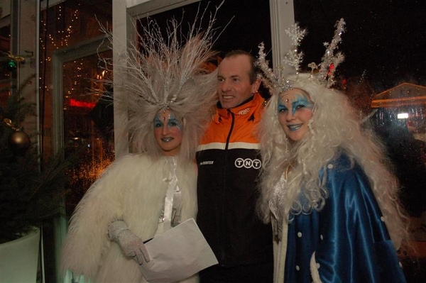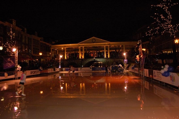 Vanwege de regen en de verwachting (volgens buienradar), dat het droger zou worden, werd gisteravond de feestelijke opening van de Leidse kunstijsbaan een klein half uurtje uitgesteld. In de grote ‘Koek & Zopietent’ stonden genodigden te wachten tot Elfstedentochtwinnaar Henk Angenet de ijsbaan zou openen. Het wachten leverde geen weersverbetering op en na een korte demonstratie van vier jeugdleden van KSV Rijnland, was het dan eindelijk zover en gaf Henk Angenet het startschot. Door de aanhoudende regen was het ijs spekglad geworden en veranderd in een echte ‘waterijsbaan’. Centrummanager Joost Bleijie is trots op de openluchtijsbaan: “Iedere stad heeft een ijsbaan, maar geen enkele stad heeft een ijsbaan op een gracht.”