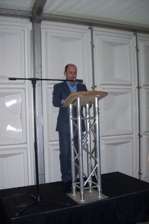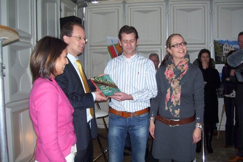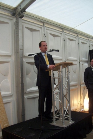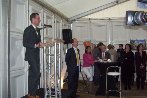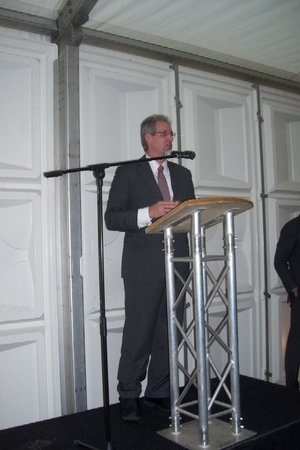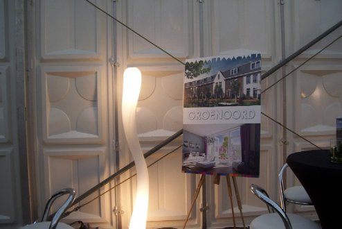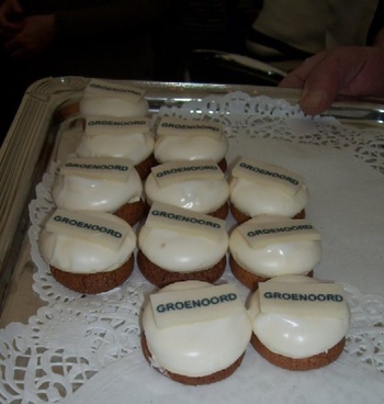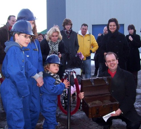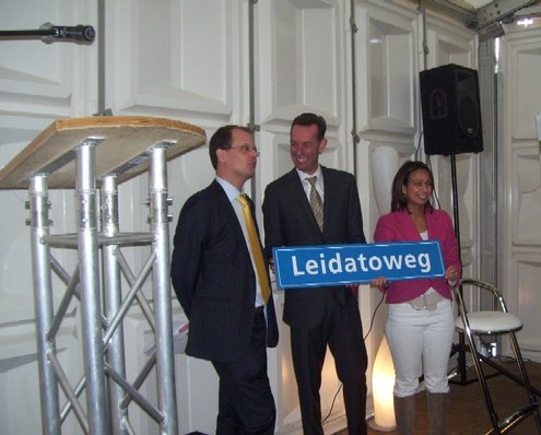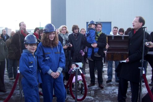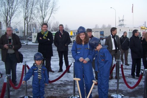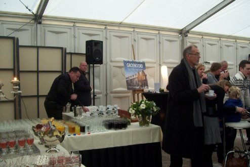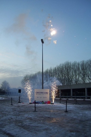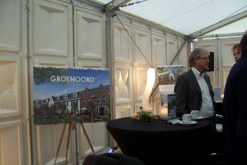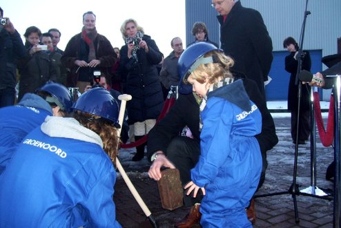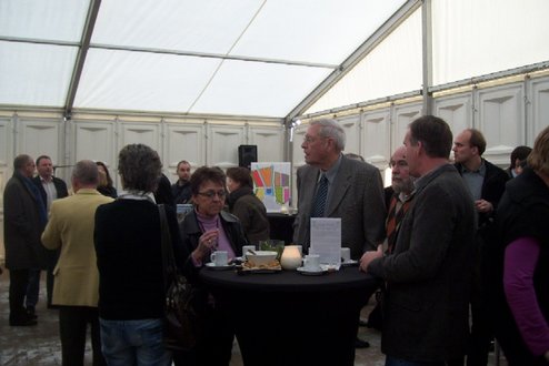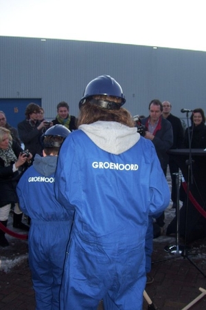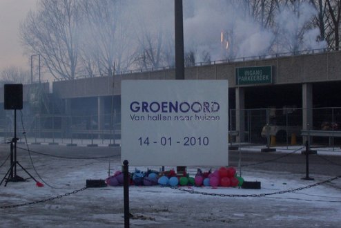 Wethouder Pieter van Woensel gaf vanmiddag in zijn toespraakje aan, een dubbel gevoel te hebben bij de feestelijke start van de sloop van de Groenoordhallen. “Aan de ene kant voelt het verdrietig, dat deze markante plek verdwijnt, aan de andere kant komt er een mooie, prachtige wijk voor in de plaats, waar we trots op kunnen zijn”, aldus Van Woensel, die aangaf liever voor- dan achteruit te willen kijken. Als verrassing overhandigde Van Woensel een eerste straatnaambord met een toepasselijke naam: ‘Leidatoweg’. Ook de andere sprekers, zoals onder andere Joop Baars, Directeur Projectontwikkeling Zuidoost en Hans Woerlee, Algemeen Directeur, PFC2 (Groenoord cv) benadrukten het verleden van de hallen en al het mooie, dat daarvoor in de plaats gaat komen. Allen waren vol lof over de samenwerking met de gemeente Leiden. Saskia van den Bronk, (Ymere) ging nog iets verder terug in de tijd en vertelde over de bekende Leidse schilder Floris Verster, die tussen het idyllisch groen in het landgoed Groenoord woonde, lang voor de hallen gebouwd werden. Een speciaal boek over de geschiedenis van de befaamde hallen en omgeving werd als eerste exemplaar uitgereikt aan de eerste toekomstige bewoners. Na alle toespraakjes toog het hele gezelschap naar buiten, waar enkele kinderen (toekomstige bewoners van Groenoord) in ‘slooptenue’ de eerste stenen uit de grond haalden en aan de wethouder overhandigden. Knallende ballonnen en vuurwerk gaven de symbolische start van de sloop aan, waarna iedereen snel de verwarmde tent binnenging voor een feestelijk glaasje.