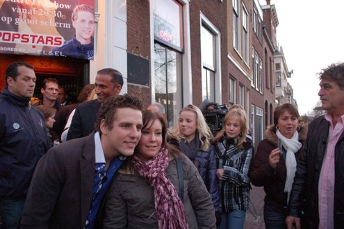 In een bijna lenteachtig zonnetje, werd de jonge Leidse zanger Wesley Klein vanmiddag enthousiast door zijn fans opgewacht aan de Oude Vest. Café M’n Schoonmoeder en Café Die Ander organiseerden de hele middag optredens met diverse artiesten en Wesley, die afgelopen vrijdag bij het populaire SBS6-programma Popstars doorging naar de halve finales, werd feestelijk onthaald. Het was rond 15.00 uur een drukte van belang en allerlei mensen en kinderen wilden graag even op de foto met deze talentvolle Leidenaar. In 2004 en 2006 werd Wesley overigens al tweede bij het Leids Festival van het Levenslied en in 2007 eindigde hij zelfs als eerste. De vele fans zijn er in ieder geval van overtuigd, dat onze Wesley dé winnaar gaat worden van Popstars.