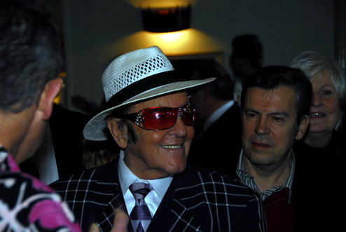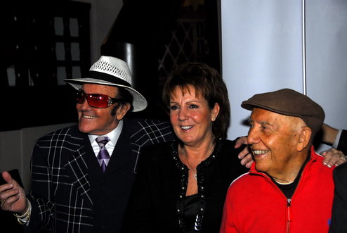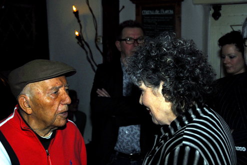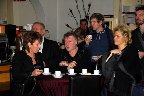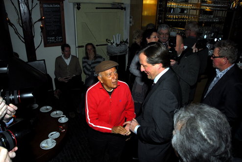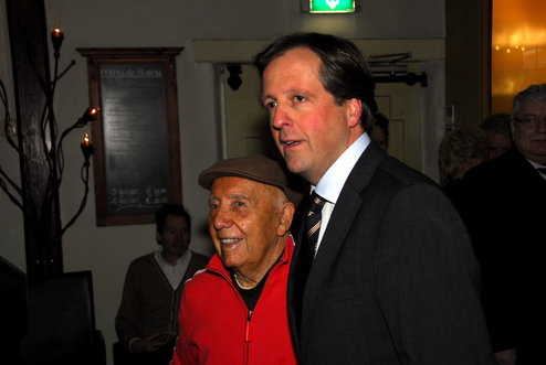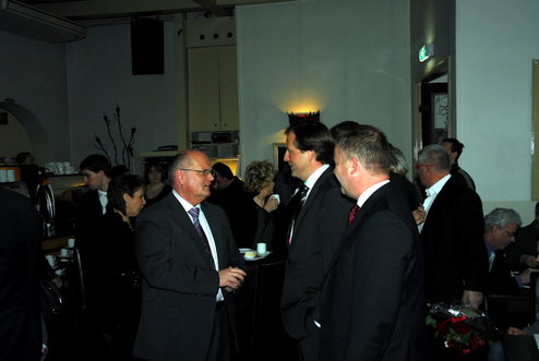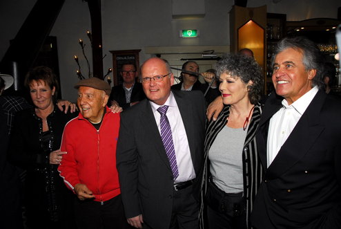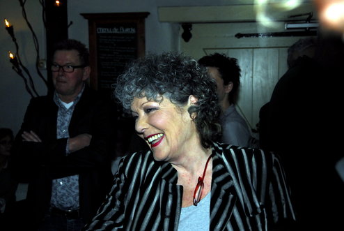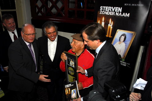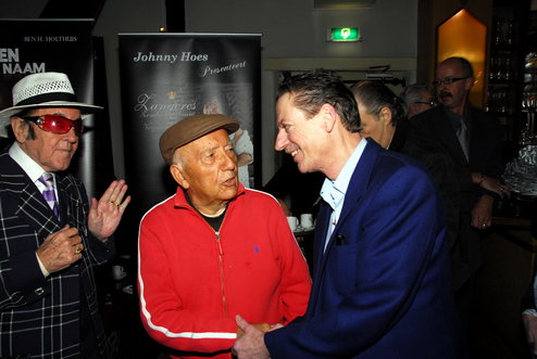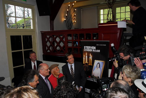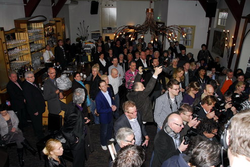 Links schrijver Ben Holthuis, midden Johnny Hoes en rechts Alexander Pechtold, omringd door vrienden en bekenden van de Zangeres zonder Naam en talloze afgevaardigden van de media. (Foto's: Gerard Ligtvoet).