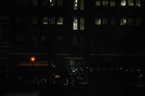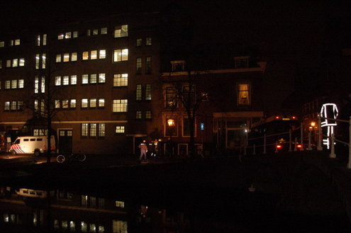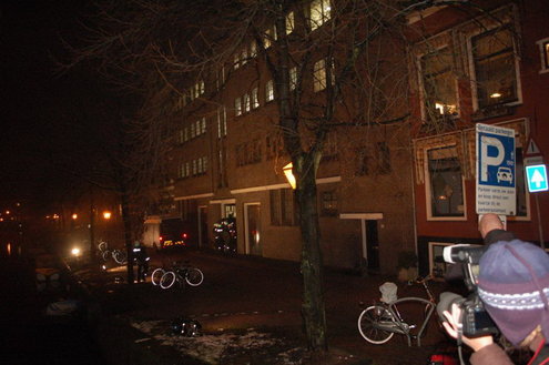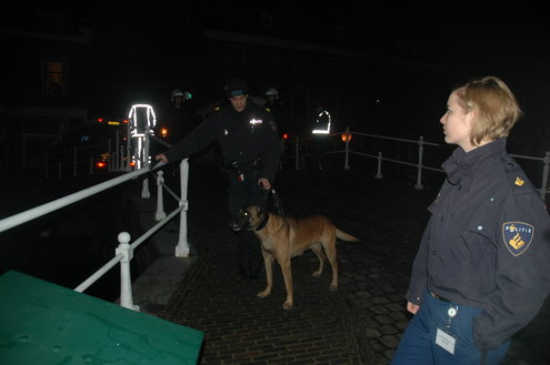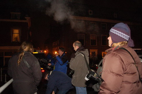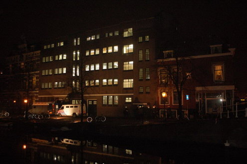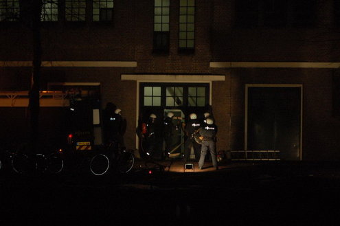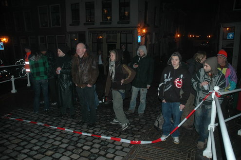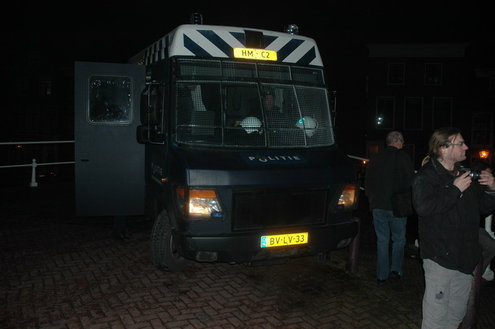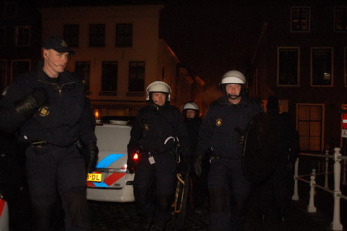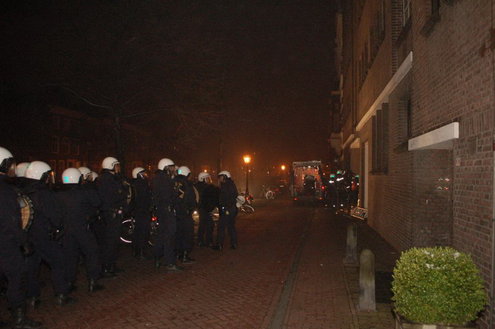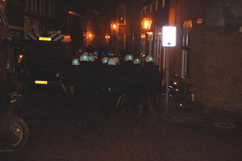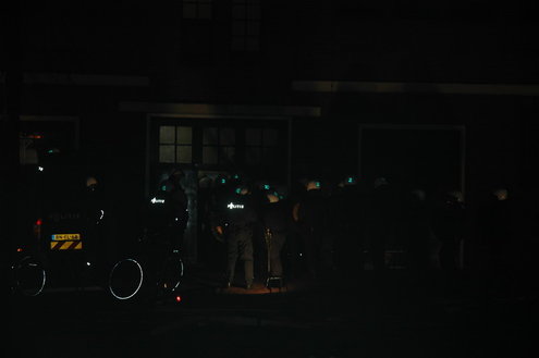 Een enorme politiemacht werd afgelopen avond ingezet om de gekraakte panden aan de Herengracht te ontruimen. De gemeente wilde koste wat kost voorkomen dat er, een maand voor de ontruiming van de Koppenhinksteeg, een nieuw krakersbolwerk in Leiden ontstaat. (Foto's: Chris de Waard en Emile van Aelst).
