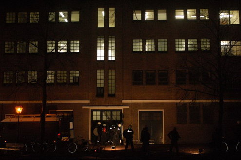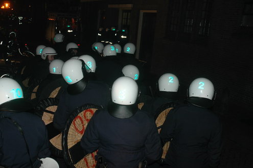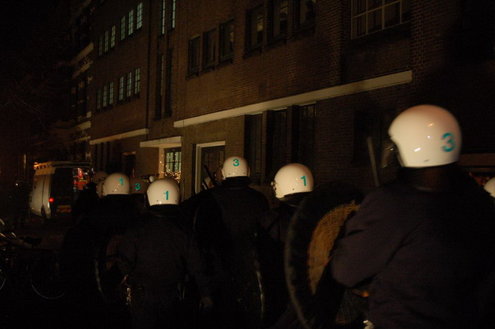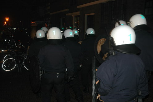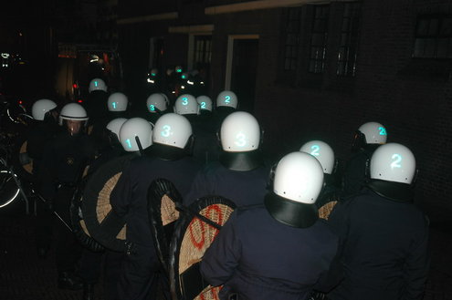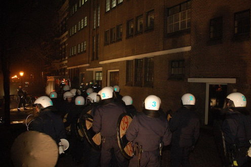 Een overweldigende politiemacht heeft vanavond de eerder vandaag gekraakte panden aan de Herengracht ontruimd. In een soort generale repetitie voor de aanstaande ontruiming van de Vrijplaats Koppenhinksteeg verzamelden zich in de loop van de avond steeds meer politieagenten in de omgeving van de Herengracht. Later kwamen daar pelotons van de Mobiele Eenheid bij en een zogenaamd BraTra-team (brand en traangas). Ook de brandweer ondersteunde bij de ontruiming. Tegen het eind van de avond werd het pand omsingeld en fel verlicht. Daarop brak de ME met behulp van een slijptol naar binnen om het pand daadwerkelijk te ontruimen. Pas na middernacht werd de eerste kraker naar buiten gebracht. Volgens de krakers is het pand ’s middags door zo’n 70 mensen in bezit genomen, maar waren er bij de ontruiming nog maar 10 binnen. De krakers spreken van een illegale ontruiming. Volgens een arrest van de Hoge Raad mag een kraakpand niet zonder tussenkomst van de rechter worden ontruimd. Burgemeester Lenferink wilde een door de krakers aangespannen kort geding dat morgen dient echter niet afwachten en ging direct tot de ontruiming over. Daarbij deden zich overigens geen ongeregeldheden voor. Uiteindelijk heeft de politie 22 mensen aangehouden wegens lokaalvredebreuk, openlijke geweldpleging, vernieling en poging tot (bedrijfs-)inbraak.