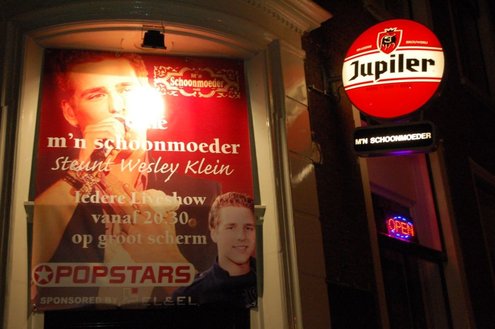 Gisteravond werd Popstars ademloos gevolgd in de Leidse kroegen door fans van de Leidse zanger Wesley Klein, die met overtuiging winnaar is geworden. Na de 'Zangeres zonder Naam' heeft Leiden nu een 'Zanger met Faam'. In café 'Die Ander' en café 'Mijn Schoonmoeder' aan de Oude Vest hadden de fans al wekenlang via grote schermen de live uitzendingen gevolgd en werd het gisteravond een supergroot feest. Verschillende fans hoopten, dat hun Wesley nog even mee zou komen feesten in Leiden, maar dat zat er helaas niet in. Ook eigenaar van café 'Mijn Schoonmoeder', de bekende zanger Raymond van Leest, was in zijn nopjes met de overwinning van Wesley en had zelf ook niet anders verwacht. Leiden heeft er weer een grote belofte voor de toekomst bij. Foto's : Emile van Aelst