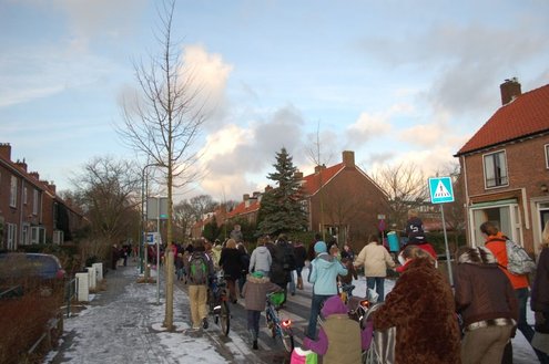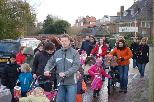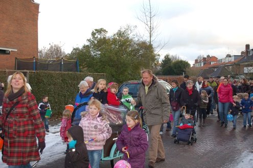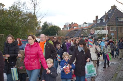 Gisteren werd in Oegstgeest ter ere van de 72ste verjaardag van Koningin Beatrix een lampionnenoptocht gehouden. Zo’n 150 kinderen liepen mee, muzikaal begeleid door drumfanfare FBL. Na afloop kregen de kinderen warme chocolademelk en een stroopwafel van de locoburgemeester op het gemeentehuis. Vanwege de jongste deelnemertjes werd de optocht aan het eind van de middag al gelopen, terwijl het nog licht was. Op zich was dat jammer, want daarmee ging er veel van het gewenste effect verloren.